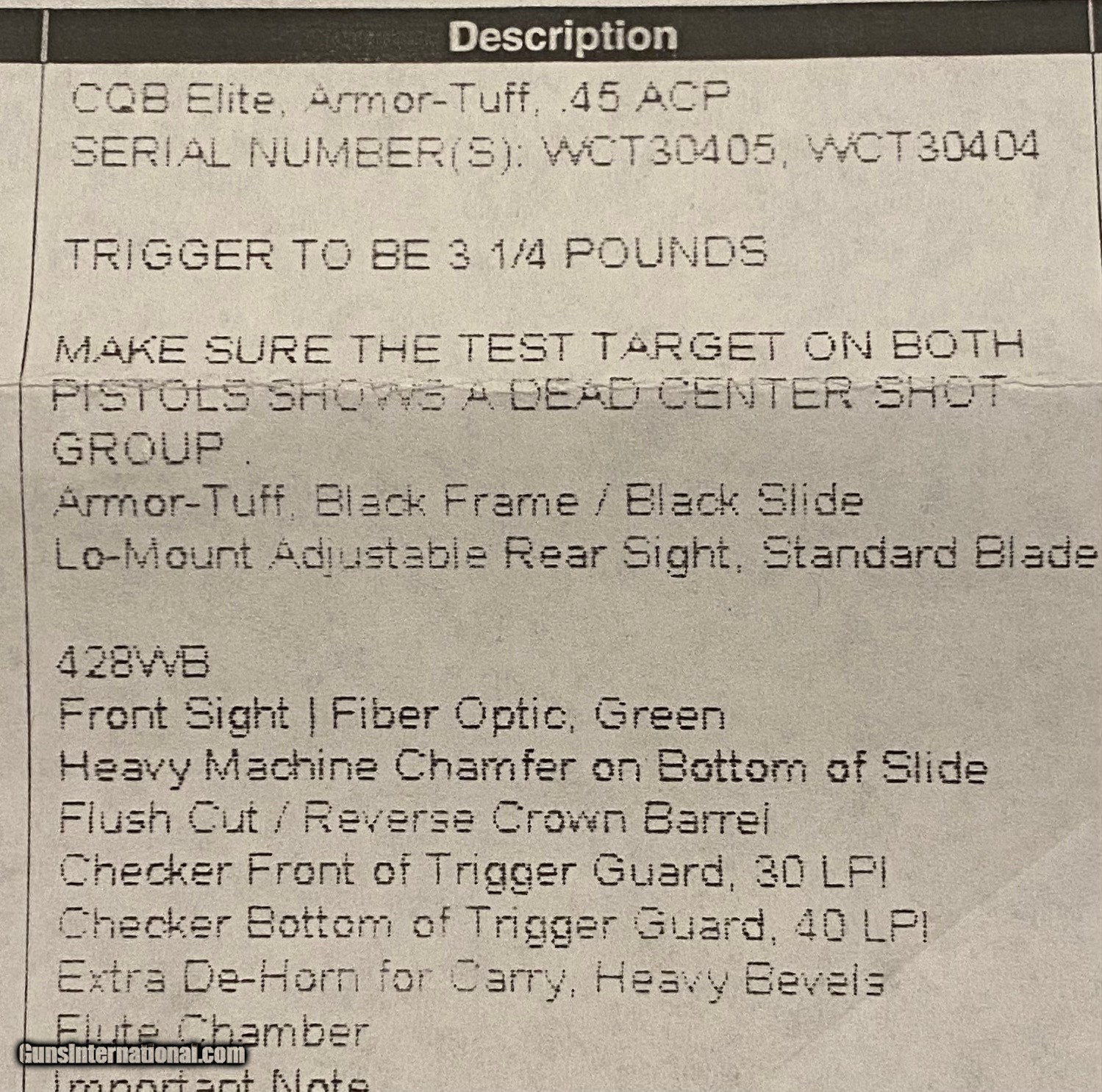 Description: LISTING EXPIRES IN ON 8/24/2022. Up for sale is a beautiful Wilson Combat CQB ELITE custom ordered with many options, two of which are, it must shoot to point of aim, and 3¼ pound trigger. Beautiful checkering, flush cut / reverse crown and fluted barrel are just a few of the other options. Gun has less than 500 rounds through it and has been a safe queen. See the pictures for the great condition of this gun and one-hole target. PAYMENT: Cashier’s Check, USPS Money Order or Personal Check only. PLEASE know your own state and local laws prior to purchasing. NO sales to CA or where illegal. I will ship your firearm out via FedEx Ground to your FFL Dealer once payment is received and cleared. Please insure your dealer will accept from private party with driver’s license included. I can arrange for shipment from FFL to FFL for additional $50. Insurance IS INCLUDED in the selling price. Should you have any questions, please feel free to email me. Thank you SOLD Handgun Caliber: .45 ACP (.45 Auto) Manufacturer: Wilson Combat Model: CQB ELITE Condition: Excellent Finish: Armor-Tuff, Black Sights: Lo-Mount Adj, Fiber Opt |