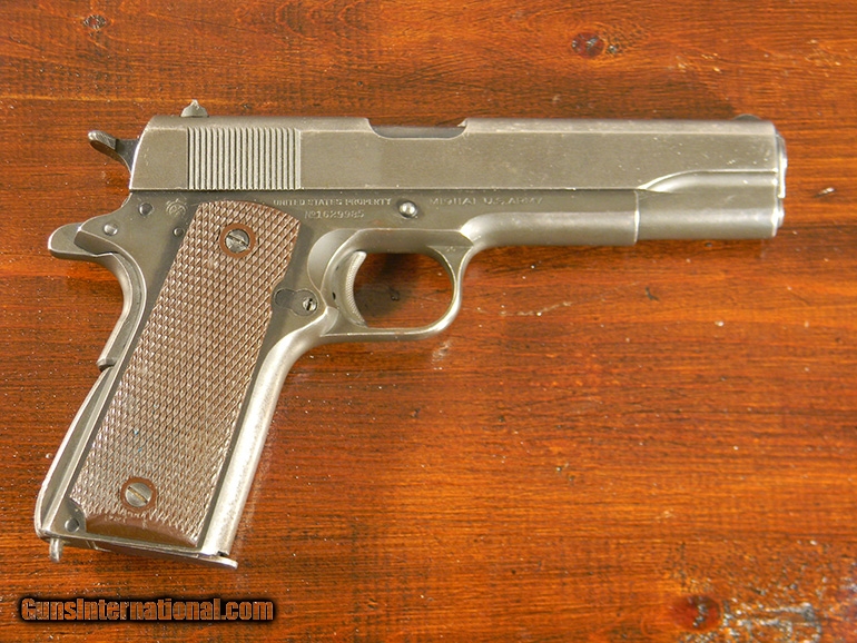 Description: This pistol is a WWII veteran bring back and is a 1944 Colt frame with a Remington Rand slide. It has been together since the war and the original finish matches slide and frame (Springfield Armory rework stamp). Good to very good. A nice looking, honest, original military pistol marked "1911A1 U.S. Army". Serial number 162998x. SOLD Curio/Relic: Yes |