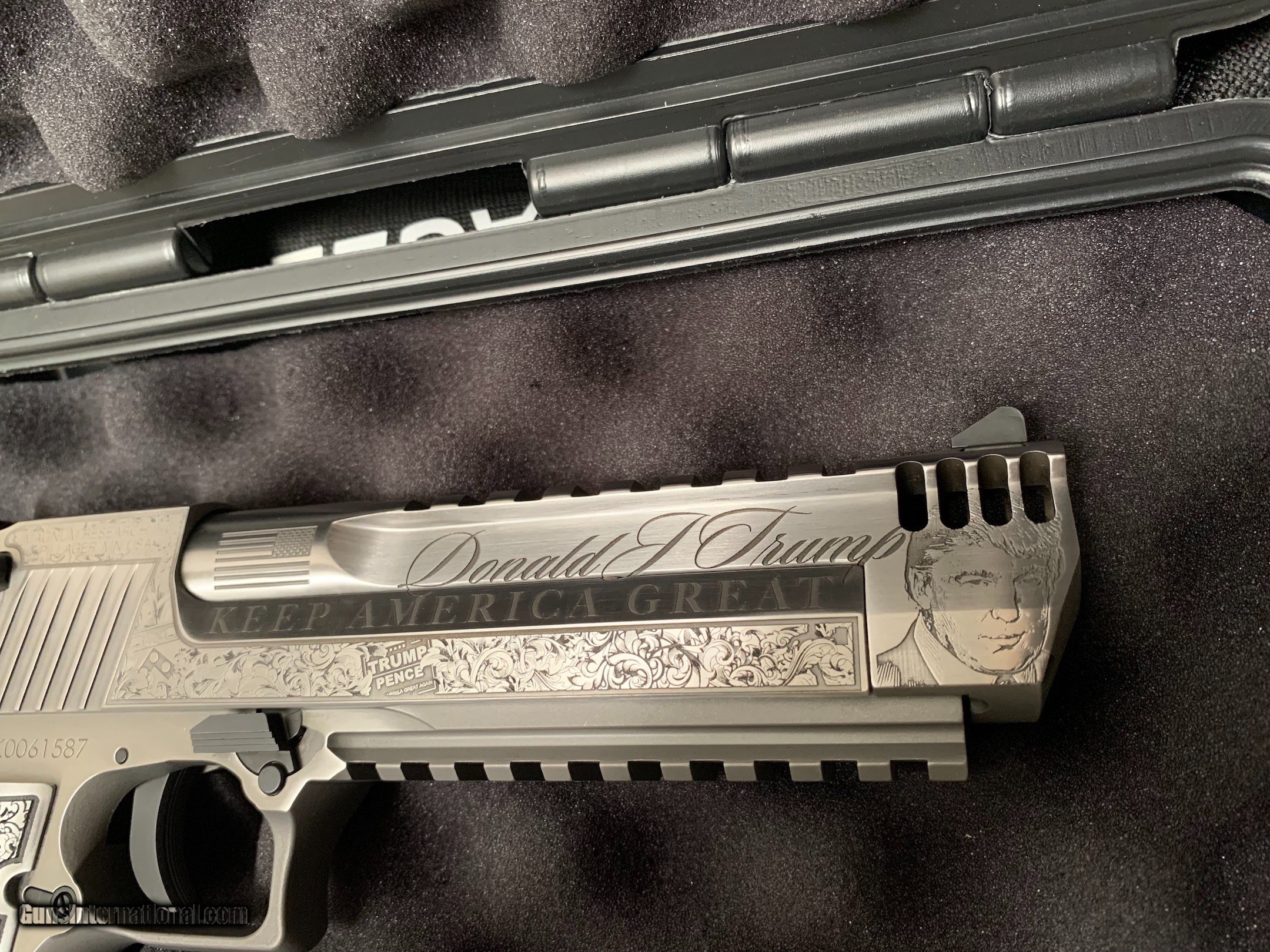 Description: Donald Trump Desert Eagle 50AE Special Edition. BRAND NEW. NEVER BEEN FIRED, RACKED, OR LOADED. With Factory Presentation Case and Paperwork. SOLD Handgun Caliber: .50 Action Express Manufacturer: Magnum Research Model: Desert Eagle Serial Number: DK0061587 Barrel Length: 6 in. Condition: Brand New Metal Condition: Brand New Wood Condition: N/A Bore Condition: Unfired Action: Semi-automatic Weight: 4 lbs. Engraving: Yes Case: Factory Presentation Case Item Location: Las Vegas |