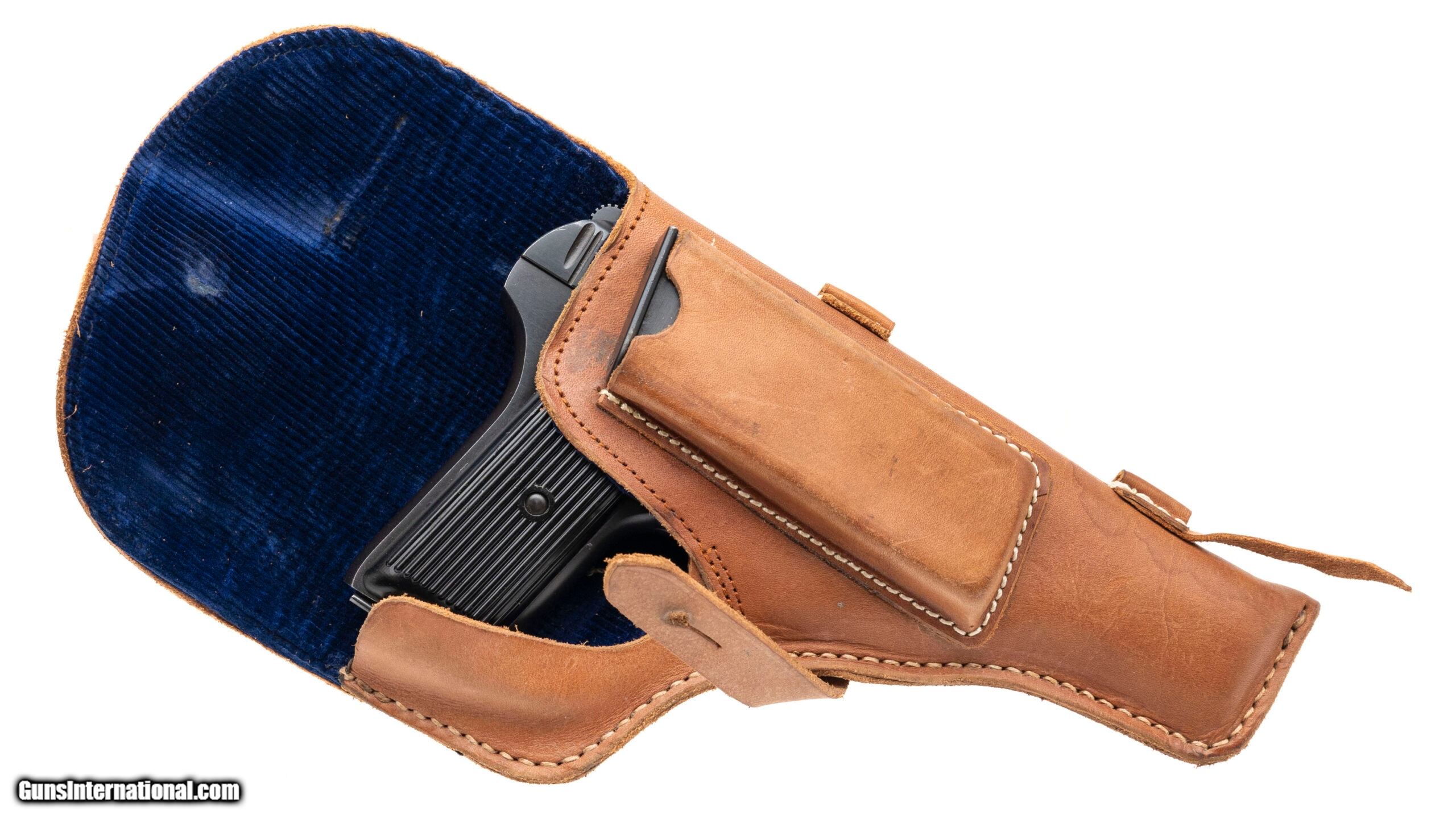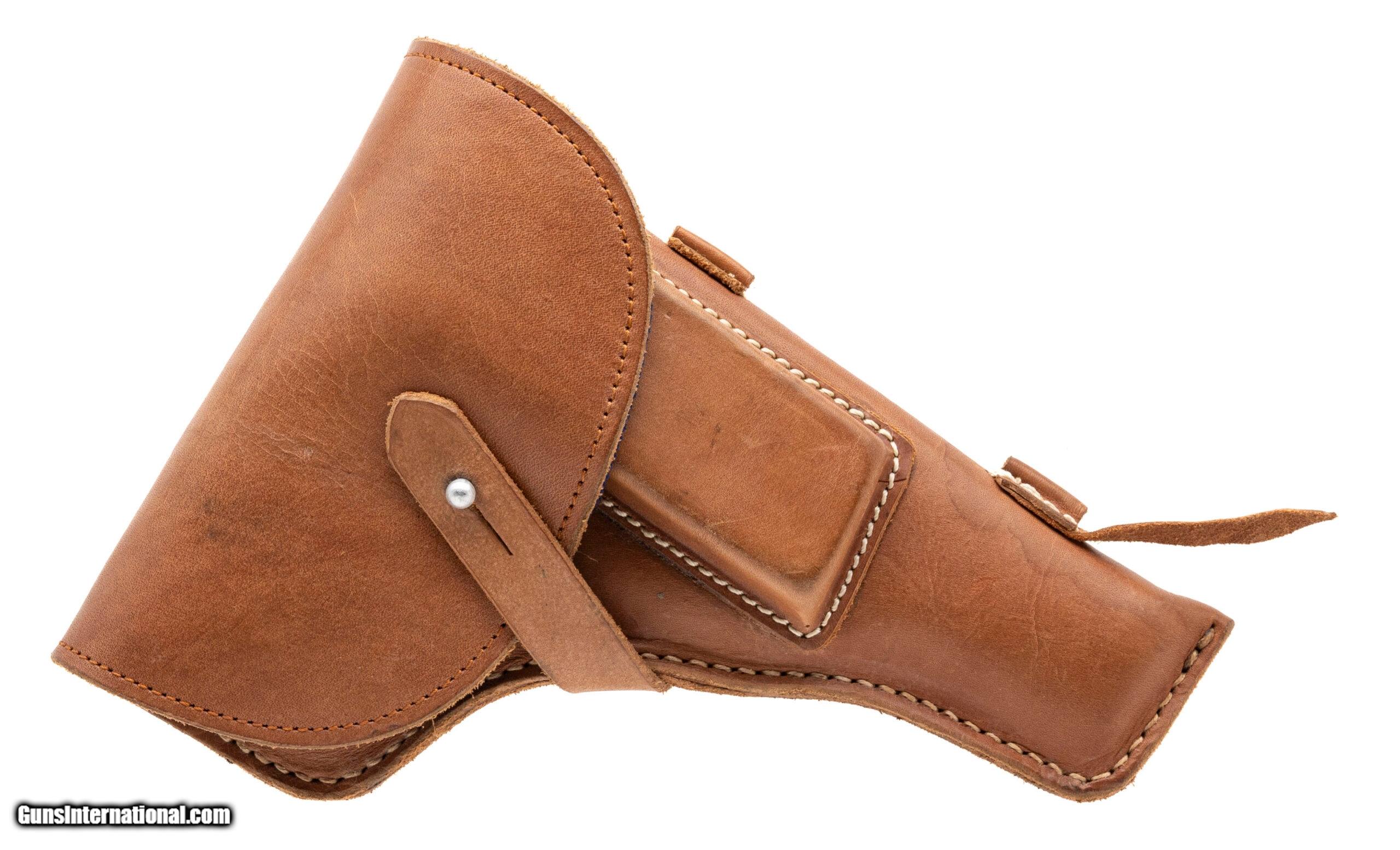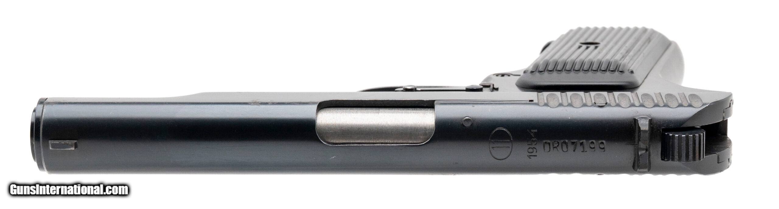 Description: "Serial No. DR07199, made in 1954, 7.62x25mm, 4 ½" round barrel. Pistol retains approximately 95% of its original finish, with matching serial numbers throughout. Grips show light handling marks but remain structurally sound. Action is smooth and functions correctly. Includes brown leather holster with extra magazine. A classic Cold War-era sidearm SOLD |