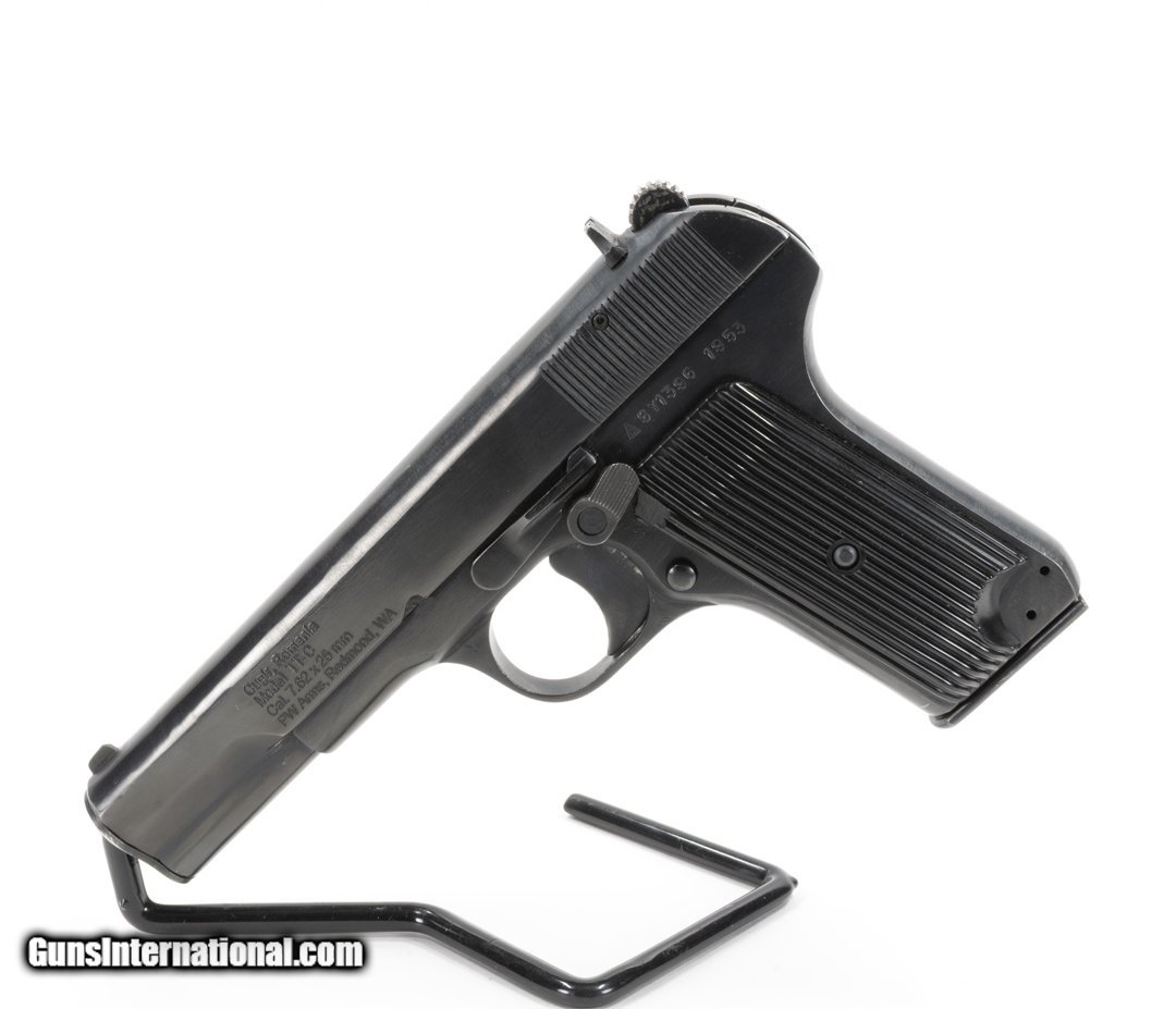 Description: Guns Listing ID: 493111 Romanian Cugir TT-C Tokarev 7.62x25 w/ Leather Holster Manufacturer: Cugir Model: TT-C Condition: Very good Caliber: 7.65x25mm Action: Semi-Auto Barrel Length: 4.57\" Capacity: 8 Features: Made in 1953, Romania. Inventory: Firearm, (1) 8-rd magazine, leather holster. • Please be aware that we have not test fired this gun. Unless otherwise stated, expect this firearm to fire and function safely. SOLD Manufacturer: CUGIR ARMS Model: TT-C Tokarev Caliber Info: 7.62x25mm Condition: Used - Non-Certified Barrels: 4.57 Finish: black |