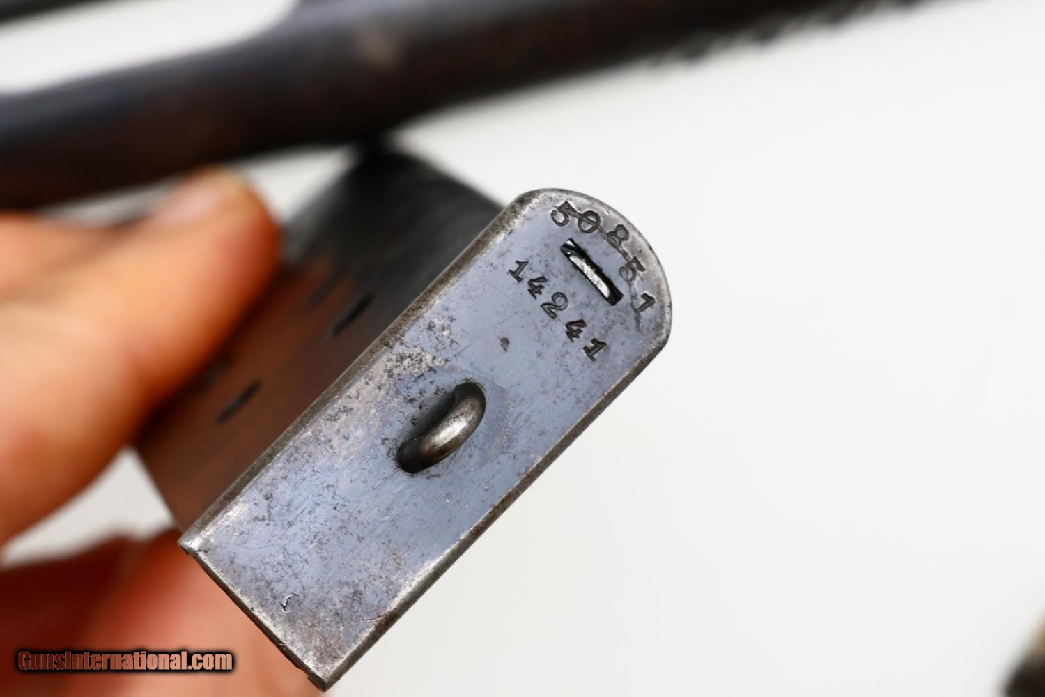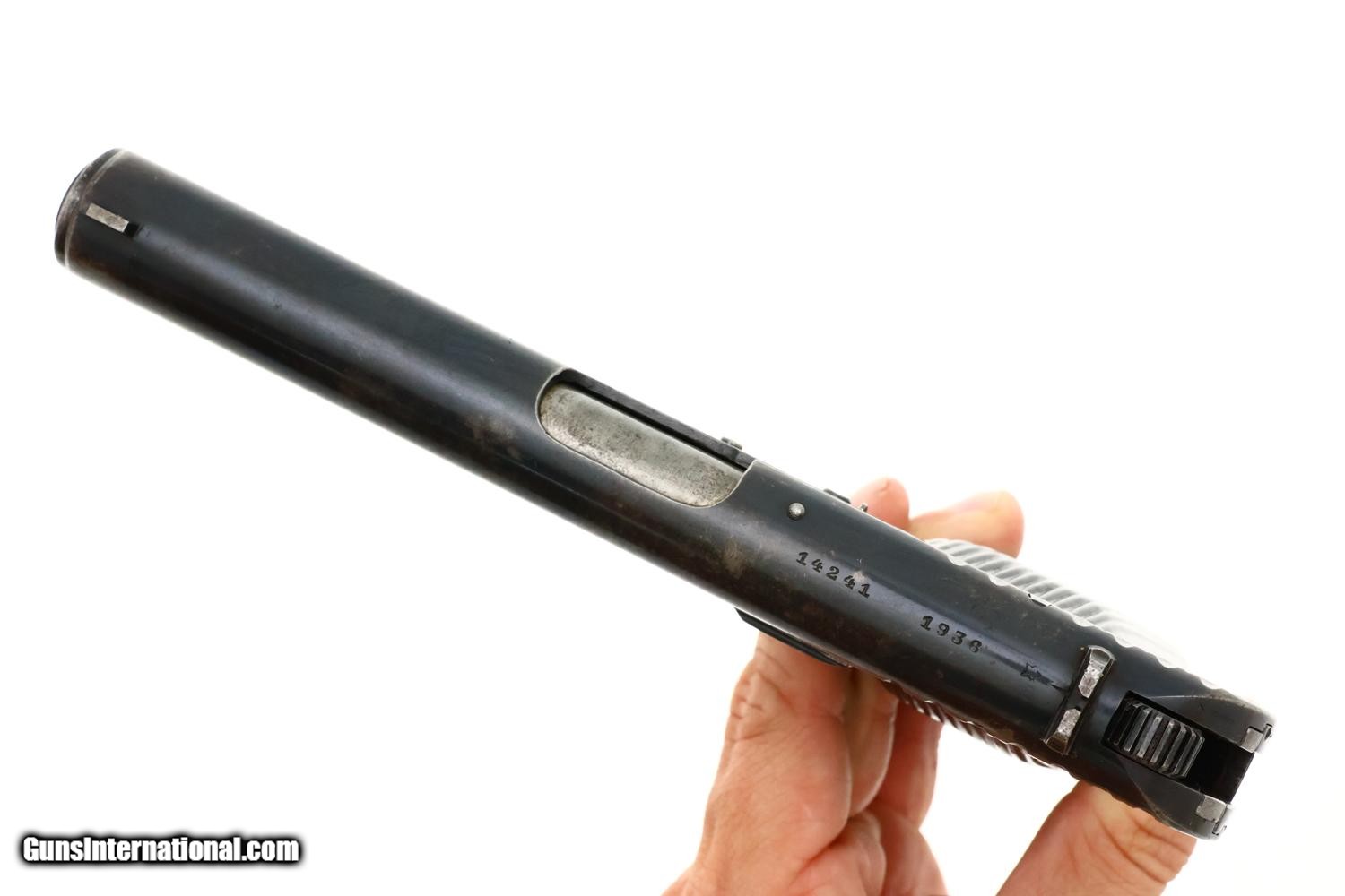 Description: Synopsis: Attractive, Original, and All Matching Soviet TT-33 Tokarev pistol, with serial number 14241, complete with original bakelite grips and arsenal renumbered matching magazine. Description: Standard configuration Soviet TT-33 Tokarev pistol, made 1936, SN 14241, military semi-automatic pistol chambered in 7.62x25mm Tokarev cartridge with fixed front sight and drift adjustable rear sight. Top of slide marked with serial number, Arsenal logo, and production year. Left side of frame with identical markings. Disassembly shows a matching barrel and hammer group. Original black bakelite grips with “CCCP” communist star logo molded into grip panels. Factory original magazine with 6 indicator holes and removable floorplate whose original serial number was lined out and arsenal renumbered to match pistol. Condition: Approximately 75% original blue with holster and handling wear as one might expect from a service pistol assembled prior to WWII and likely used throughout the entire conflict. Bright bore with sharp rifling. Correct manual mechanics. An all matching pre-war Tokarev pistol, difficult to find under any circumstance. SOLD Manufacturer: Russian Model: Tokarev Serial Number: 14241 Caliber Info: 7.62x25 Condition: 0.75 |