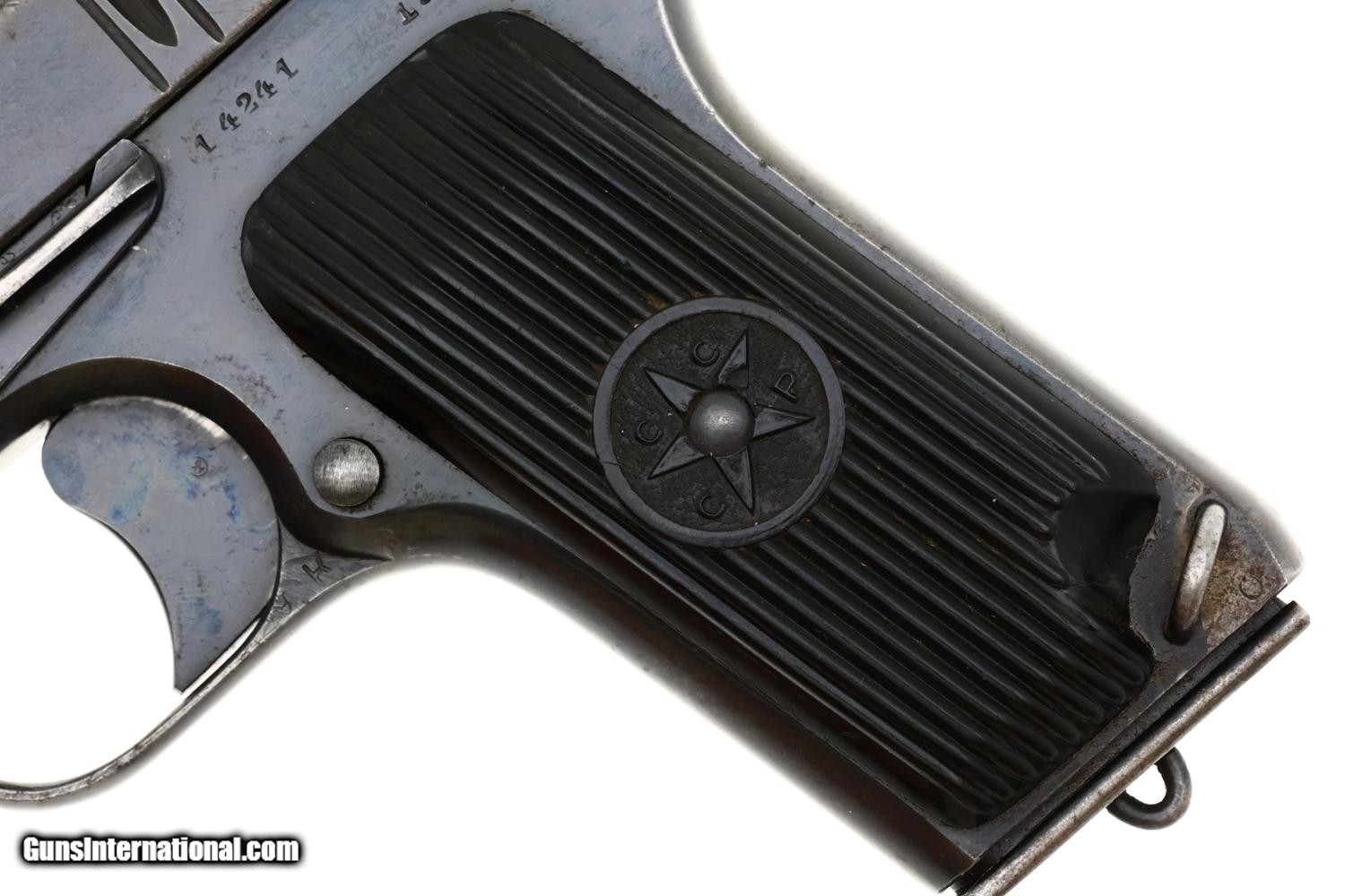 Standard configuration Soviet TT-33 Tokarev pistol, made 1936, SN 14241, military semi-automatic pistol chambered in 7.62x25mm Tokarev cartridge with fixed front sight and drift adjustable rear sight. Top of slide marked with serial number, Arsenal logo, and production year. Left side of frame with identical markings. Disassembly shows a matching barrel and hammer group. Original black bakelite grips with “CCCP” communist star logo molded into grip panels. Factory original magazine with 6 indicator holes and removable floorplate whose original serial number was lined out and arsenal renumbered to match pistol.