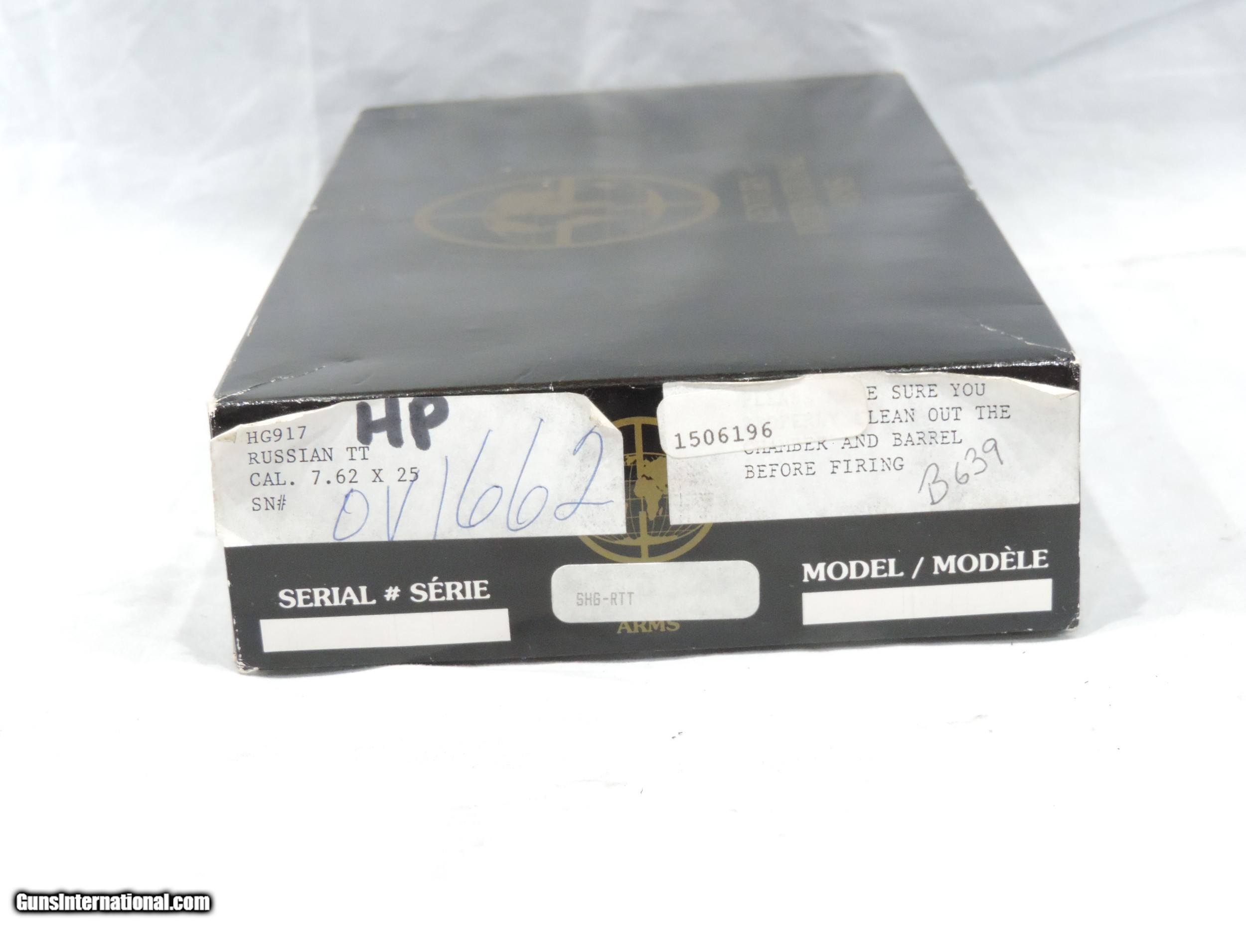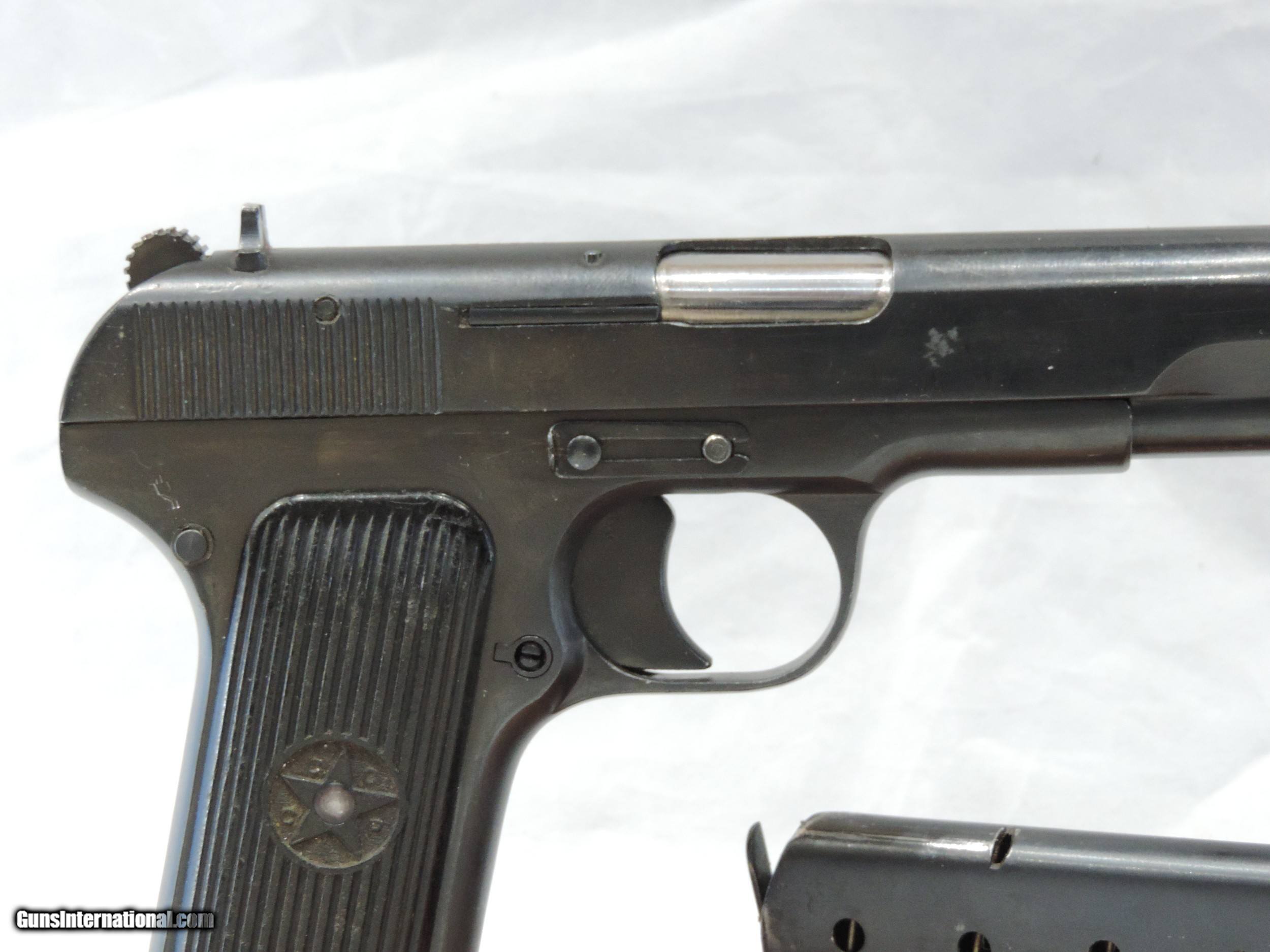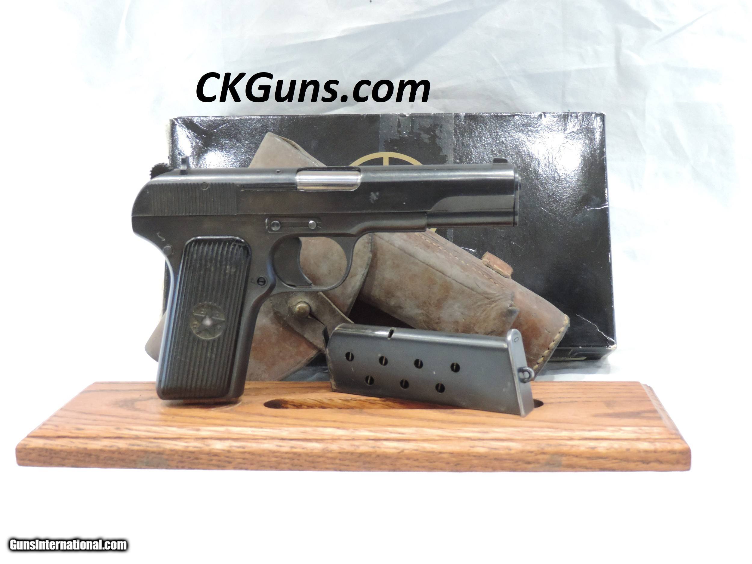 Description: INV. 9804 RUSSIAN TOKAREV, TT33, CAL. 7.62MM, SER. O B 1662. THIS BEAUTY HAS RETAINED ABOUT 99+% OF THE ORIGINAL ARSENAL FINISH. THERE ARE NO RUST SPOTS, RUB MARKS, SCRATCHES OR SHARP EDGE SILVERING. ALL PARTS ARE ORIGINAL TO THE GUN. IT WAS IMPORTED BY "CAI" SHORTLY AFTER PRODUCTION AND ACCORDING TO U.S. LAW A SAFETY WAS ADDED. THE GRIPS ARE THE CORRECT SOVIET ISSUE AND SHOW NO USE. JUDGING BY THE SLIDE RAILS, BOLT FACE AND FEED RAMP THE GUN IS PRISTINE. THE BORE IS SUPER, MIRROR BRIGHT WITH RAZOR SHARP RIFLING, NOT A WHISP OF FROST ANYWHERE. IT COMES WTH AN ORIGINAL WARTIME MAGAZINE, A ORIGINAL RUSSIAN ARMY HOLSTER THAT SHOULD CLEAN UP BEAUTIFULLY AND THE ORIGINAL CENTURY ARMS BOX. THIS BEAUTY WOULD SATISFY THE MOST CRITICAL COLLECTOR AND BE GREAT FUN AT THE RANGE. MODESTLY PRICED AT..... $995.*** *** 100% SATISFACTION GUARANTEED FOR THE PURCHASE PRICE OF THE GUN. To purchase this firearm or if you want to request more information contact us at: Email ckguns[at]ymail[dot]com Phone 201-512-0002 Cell 201-575-6838 FAX 201-215-4759 We accept most major credit cards. Prices shown are Discounted 3% for Cash or Check. The buyer must be familiar with all the laws governing the purchase and the ownership of firearms in their own city and state. The Yankee Armorer, Inc is not responsible for any failure to comply with or observe these laws. The Yankee Armorer, Inc will only ship after full payment and receipt of all required documents. Shipping: Add $35.00 for handguns, $45.00 for long guns. New Jersey buyers are subject to a 7% sales tax. The Yankee Armorer, Inc offers a 3 day inspection period with full refund upon return of intact firearm and in the original condition. The Yankee Armorer, Inc offers a no interest lay away program - 25% down; 25% in 30 days; 25% in 60 days; and full payment in 90 days. Any violation of this policy is subject to restocking and forfeiture of all payments. Any variation from this policy must be agreed to in advance. Unshipped Cancelled sales are subject to a 20% restocking fee. Be advised that all firearms sold by The Yankee Armorer, Inc. or the Gun Exchange, LLC (SELLER) are sold as collector’s items. They have not been fired or tested for safety and must be examined by a license gunsmith prior to use. By purchasing any item from the (SELLER), you are agreeing to hold the (SELLER) free from any damages or lawsuits of any nature. Any item left for transfer or storage will be charged to $25.00 per month, per item from the day of its receipt. Any variation from this policy must be agreed to in advance. Store hours 10:00 am to 5:00 pm Tuesday -Saturday. It's always best to call for appointment. Store 201-512-0002, cell 201-575-6838. SOLD |