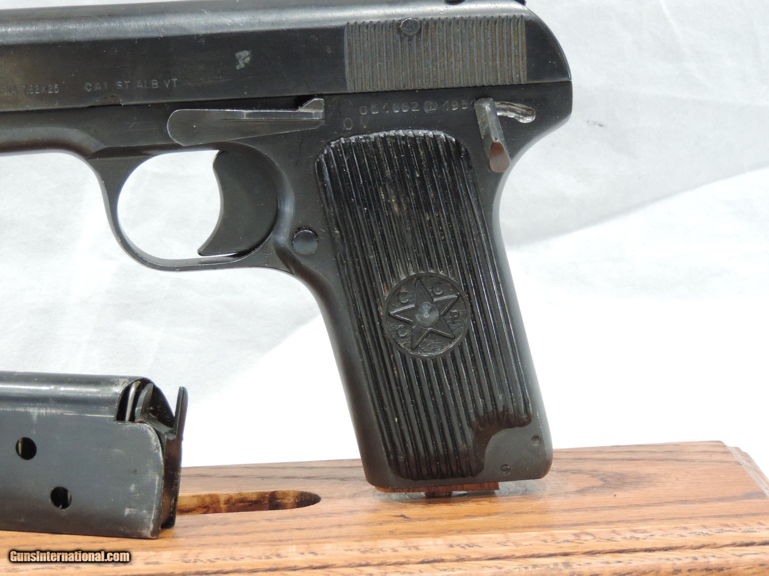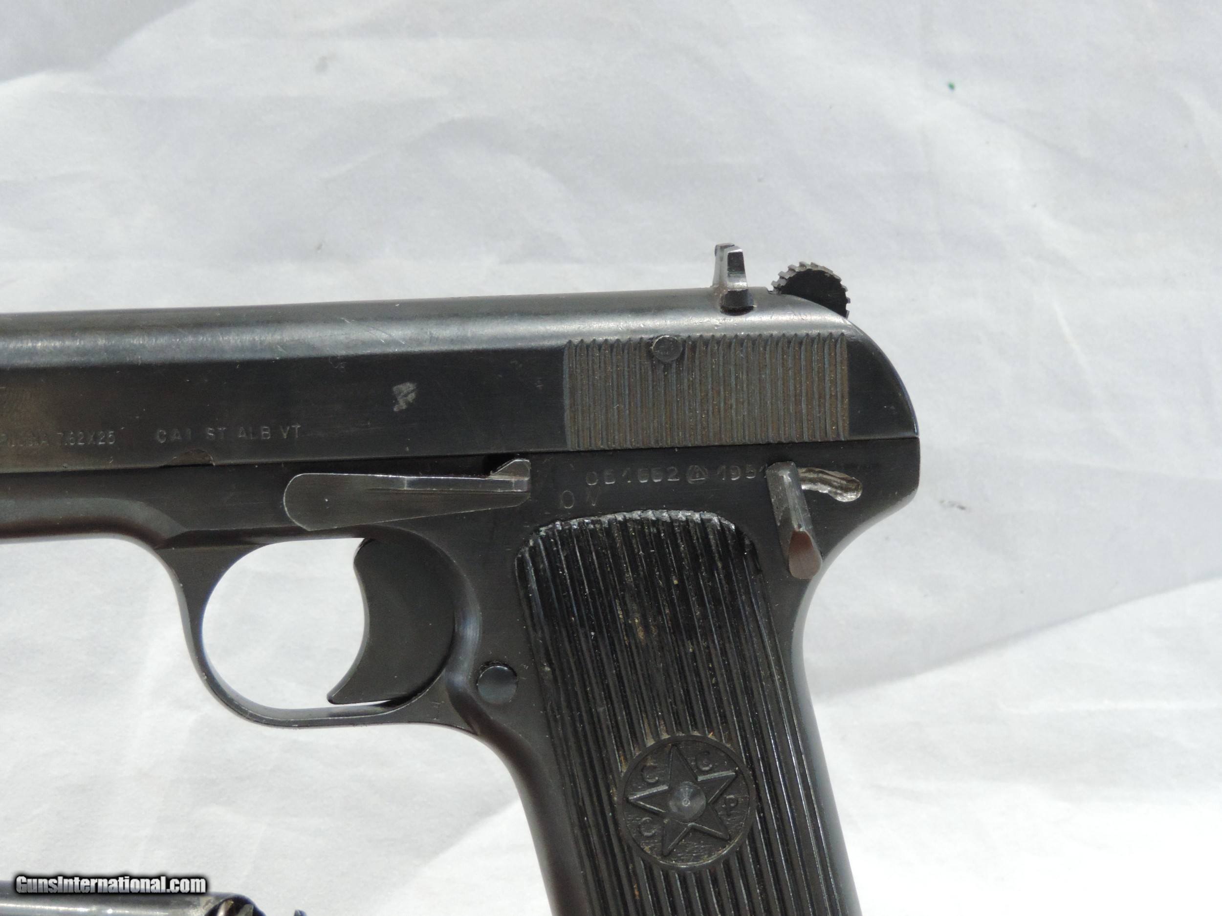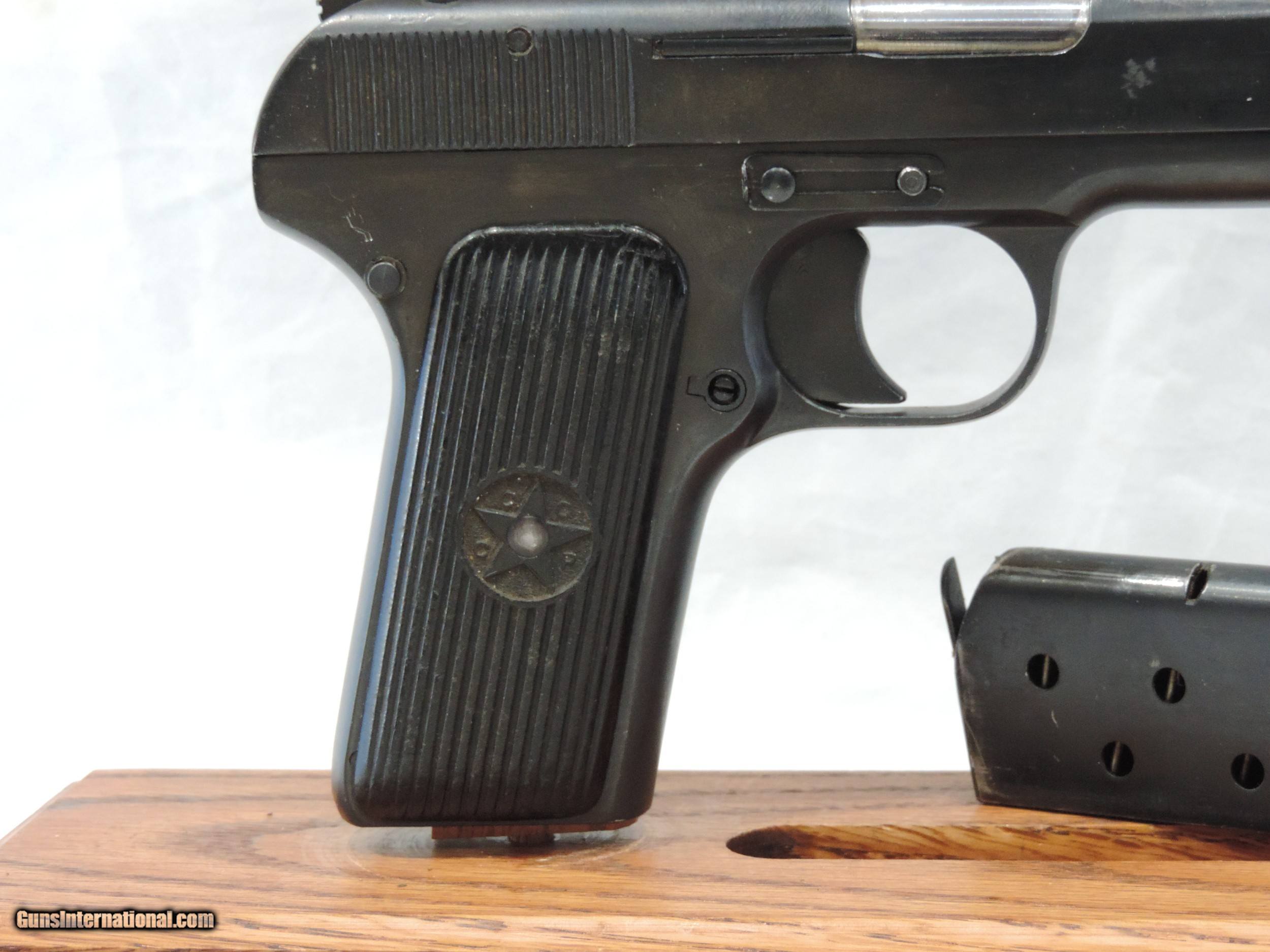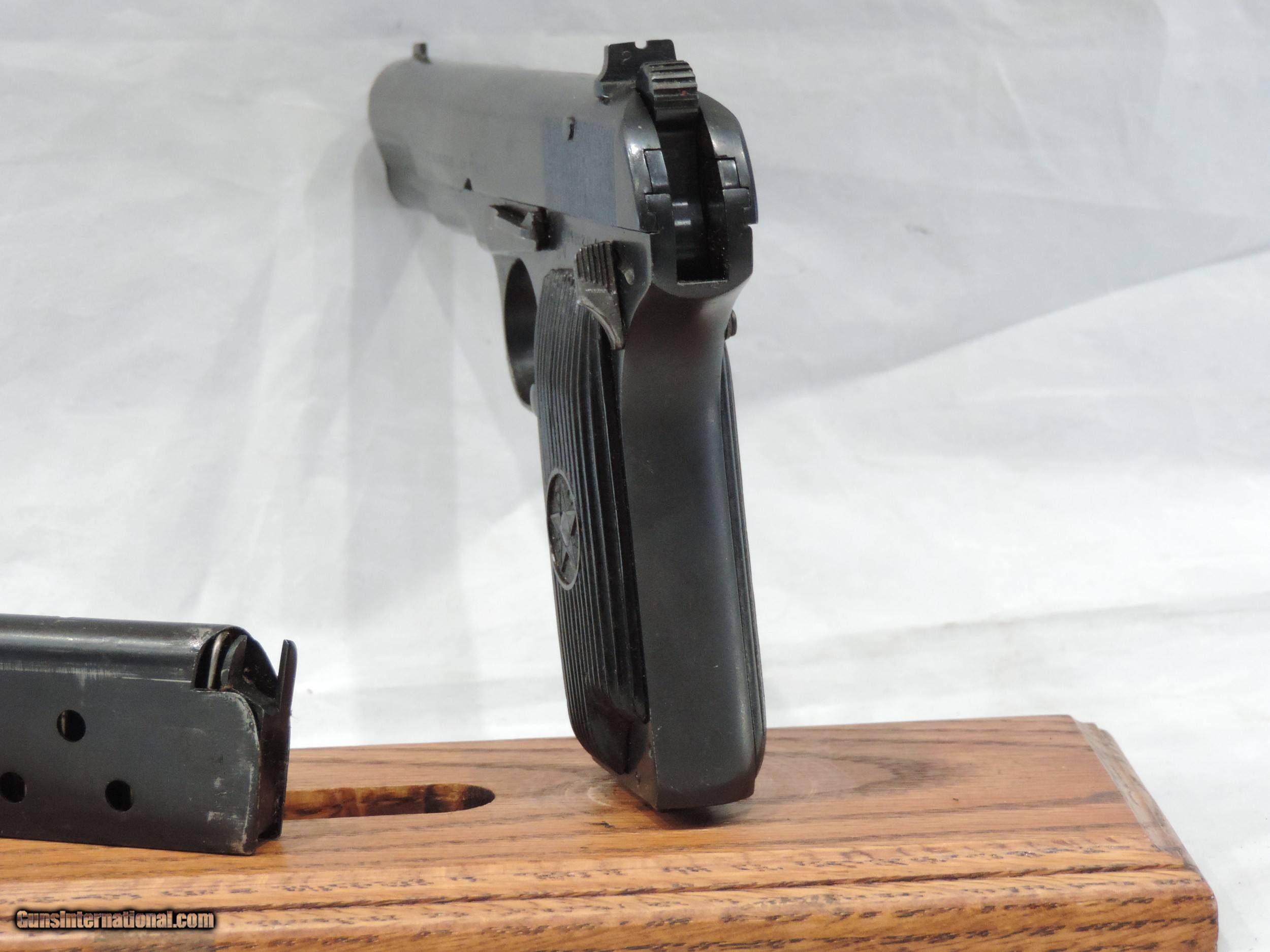 Description: INV. 9804 RUSSIAN TOKAREV, TT33, CAL. 7.62MM, SER. O B 1662. THIS BEAUTY HAS RETAINED ABOUT 99+% OF THE ORIGINAL ARSENAL FINISH. THERE ARE NO RUST SPOTS, RUB MARKS, SCRATCHES OR SHARP EDGE SILVERING. ALL PARTS ARE ORIGINAL TO THE GUN. IT WAS IMPORTED BY "CAI" SHORTLY AFTER PRODUCTION AND ACCORDING TO U.S. LAW A SAFETY WAS ADDED. THE GRIPS ARE THE CORRECT SOVIET ISSUE AND SHOW NO USE. JUDGING BY THE SLIDE RAILS, BOLT FACE AND FEED RAMP THE GUN IS PRISTINE. THE BORE IS SUPER, MIRROR BRIGHT WITH RAZOR SHARP RIFLING, NOT A WHISP OF FROST ANYWHERE. IT COMES WTH AN ORIGINAL WARTIME MAGAZINE, A ORIGINAL RUSSIAN ARMY HOLSTER THAT SHOULD CLEAN UP BEAUTIFULLY AND THE ORIGINAL CENTURY ARMS BOX. THIS BEAUTY WOULD SATISFY THE MOST CRITICAL COLLECTOR AND BE GREAT FUN AT THE RANGE. MODESTLY PRICED AT..... $995.*** *** 100% SATISFACTION GUARANTEED FOR THE PURCHASE PRICE OF THE GUN. To purchase this firearm or if you want to request more information contact us at: Email ckguns[at]ymail[dot]com Phone 201-512-0002 Cell 201-575-6838 FAX 201-215-4759 We accept most major credit cards. Prices shown are Discounted 3% for Cash or Check. The buyer must be familiar with all the laws governing the purchase and the ownership of firearms in their own city and state. The Yankee Armorer, Inc is not responsible for any failure to comply with or observe these laws. The Yankee Armorer, Inc will only ship after full payment and receipt of all required documents. Shipping: Add $35.00 for handguns, $45.00 for long guns. New Jersey buyers are subject to a 7% sales tax. The Yankee Armorer, Inc offers a 3 day inspection period with full refund upon return of intact firearm and in the original condition. The Yankee Armorer, Inc offers a no interest lay away program - 25% down; 25% in 30 days; 25% in 60 days; and full payment in 90 days. Any violation of this policy is subject to restocking and forfeiture of all payments. Any variation from this policy must be agreed to in advance. Unshipped Cancelled sales are subject to a 20% restocking fee. Be advised that all firearms sold by The Yankee Armorer, Inc. or the Gun Exchange, LLC (SELLER) are sold as collector’s items. They have not been fired or tested for safety and must be examined by a license gunsmith prior to use. By purchasing any item from the (SELLER), you are agreeing to hold the (SELLER) free from any damages or lawsuits of any nature. Any item left for transfer or storage will be charged to $25.00 per month, per item from the day of its receipt. Any variation from this policy must be agreed to in advance. Store hours 10:00 am to 5:00 pm Tuesday -Saturday. It's always best to call for appointment. Store 201-512-0002, cell 201-575-6838. SOLD |