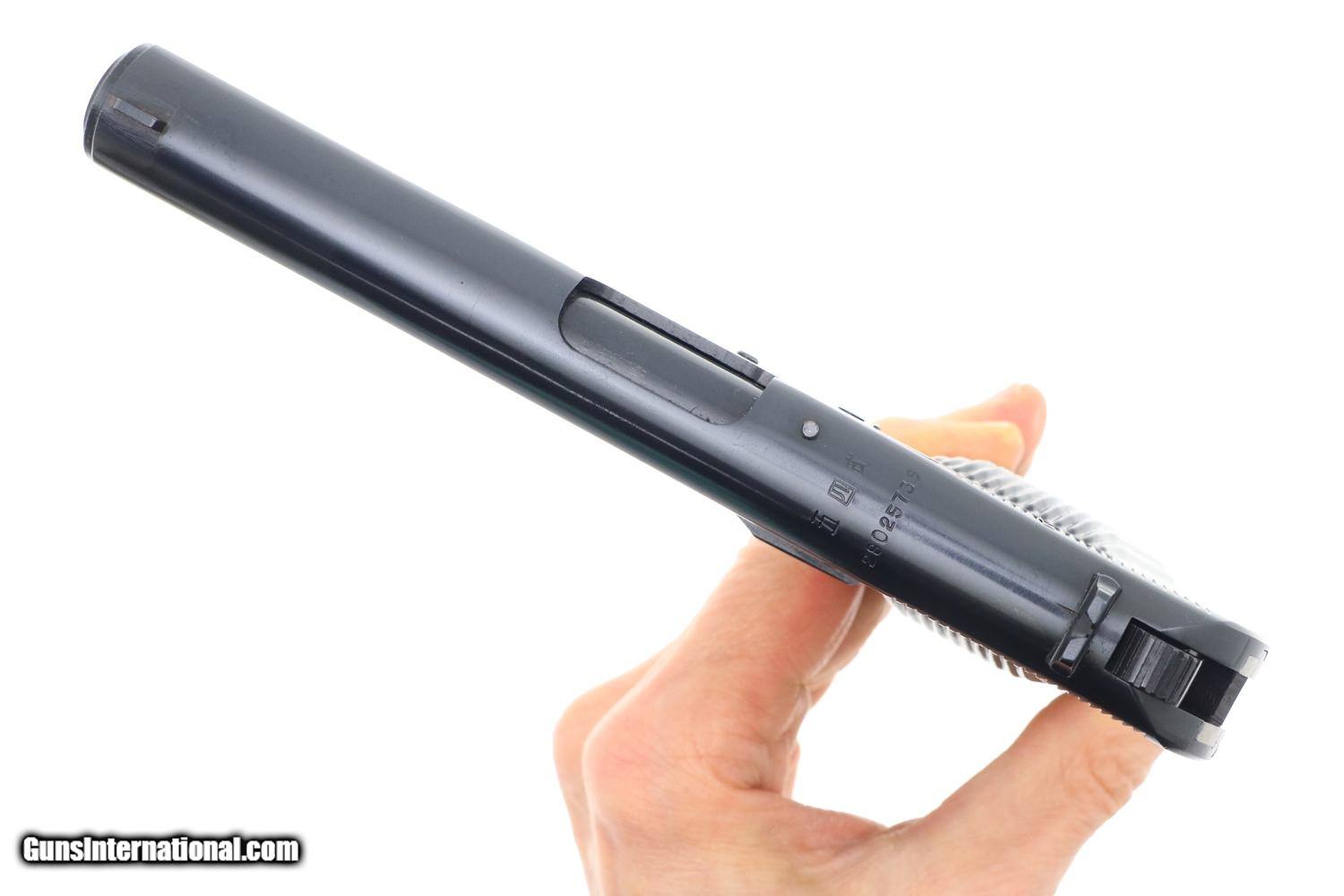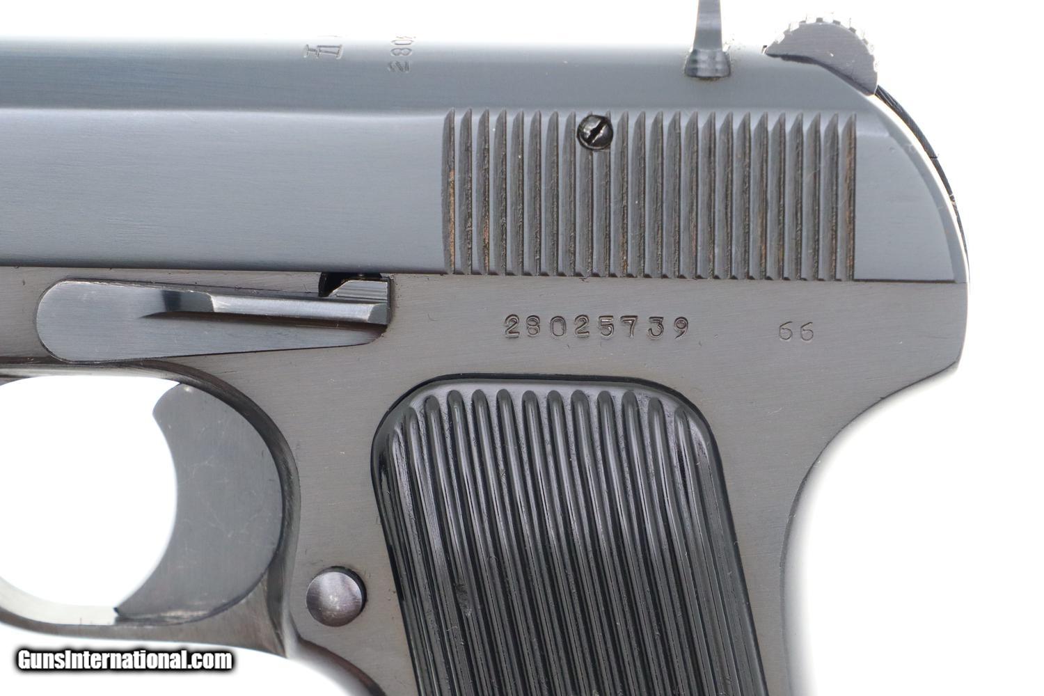 Description: Synopsis: Spectacular Chinese Tokarev, Matching Mag, Made 1981, 28025739, FB01176 Description: Superb as new Chinese Tokarev made in 1981 in factory 66 with three Chinese characters on top of slide surmounting serial number that is repeated on the left side of the frame. Assembly markings on either side of upper trigger guard web. Fitted with vertically serrated black plastic panels with central 5 pointed star, the left panel recessed for a fixed lanyard ring. Magazine with 6 indicator holes and detachable floorplate matched to the last four digits of the serial number. Condition: AS NEW! This pistol shows absolutely no wear. If you want the best possible Chinese Tokarev from 1981 including a matching magazine, this is your chance! ~~Insured shipping fee of $65; most packages shipped using FedEx 2nd Day.~~ SOLD Manufacturer: Chinese Serial Number: 28025739 Caliber Info: 7.62x25 |