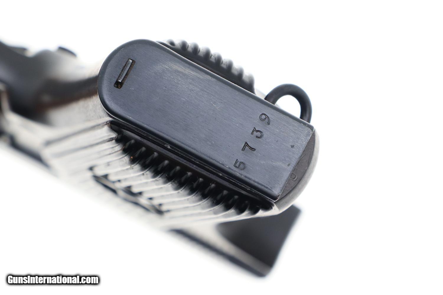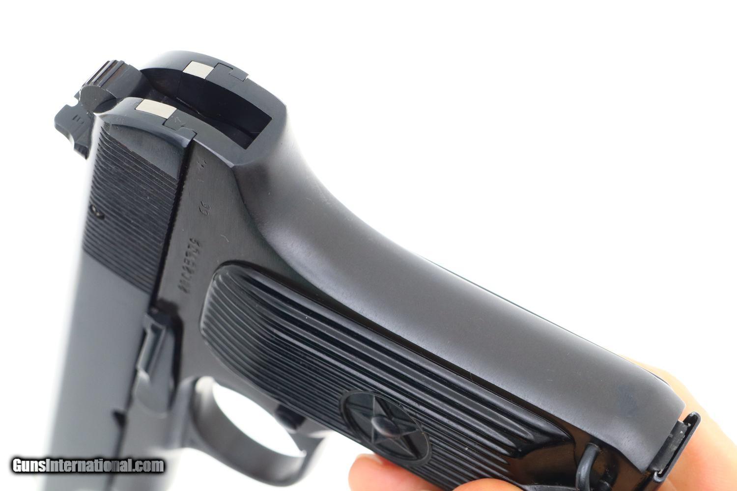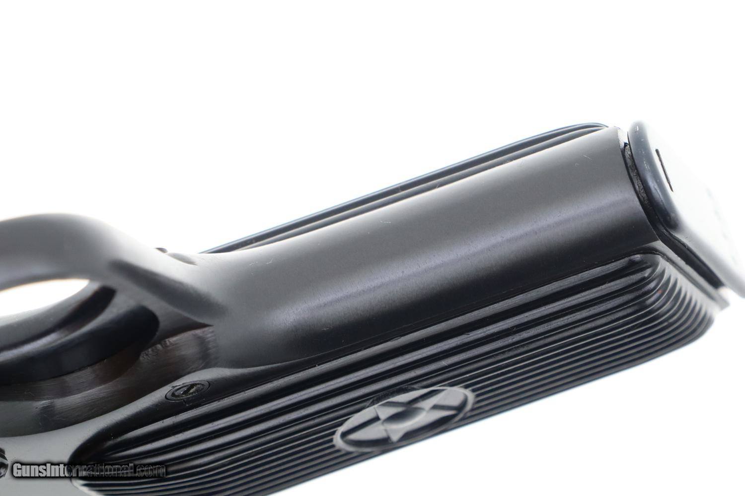 Description: Synopsis: Spectacular Chinese Tokarev, Matching Mag, Made 1981, 28025739, FB01176 Description: Superb as new Chinese Tokarev made in 1981 in factory 66 with three Chinese characters on top of slide surmounting serial number that is repeated on the left side of the frame. Assembly markings on either side of upper trigger guard web. Fitted with vertically serrated black plastic panels with central 5 pointed star, the left panel recessed for a fixed lanyard ring. Magazine with 6 indicator holes and detachable floorplate matched to the last four digits of the serial number. Condition: AS NEW! This pistol shows absolutely no wear. If you want the best possible Chinese Tokarev from 1981 including a matching magazine, this is your chance! ~~Insured shipping fee of $65; most packages shipped using FedEx 2nd Day.~~ SOLD Manufacturer: Chinese Serial Number: 28025739 Caliber Info: 7.62x25 |
