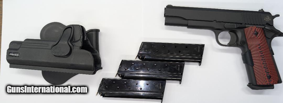 Description: Guns Listing ID: 587739 Armscor, Rock FS, 1911, Semi-automatic, Metal Frame Pistol, Full Size, 10MM, 5\" Barrel, Steel, Parkerized Finish, Black, G10 Style Green Laser Grips, fixed Sights, 8 Rounds, 4 Magazines, RH OWB Kydex Bulldog holster 5\" Barrel 8 Round Capacity Parkerized Finish, Black 4-6 LB Trigger Pull G10 Style Green Laser GripsGrips Product Description The Rock FS pistol is built in traditional 70 series design and delivered with precise engineering standards and first rate upgrades. This pistol is chambered in 10mm with a 5\" button rifled barrel supported by a full length guide rod. SOLD Manufacturer: ROCK ISLAND ARMORY Model: 1911 Caliber Info: 10MM Condition: Used - Non-Certified Barrels: 5" BARREL Action: SEMI AUTOMATIC Finish: black |