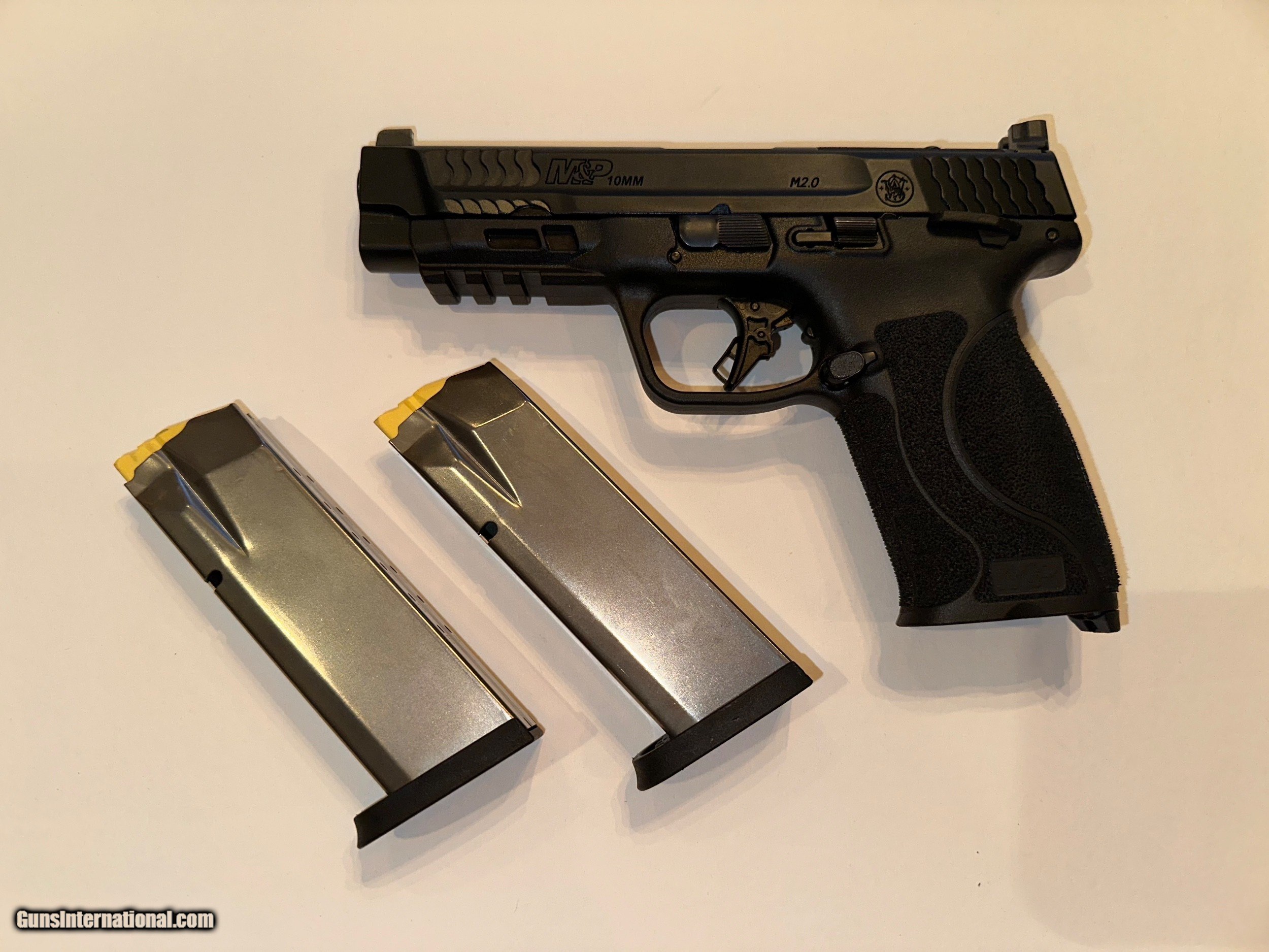 Description: NEVER FIRED Smith & Wesson Model M&P 10mm M2.0 4.6IN TS (thumb safety) is a right hand semi-auto pistol in 10mm Auto Cal. It has a 4.6 inch barrel with a front and rear serrated slide. A blade front sight and notch rear sight with 3 white sight dots PLUS slide cut for optics. The grip is a excellent textured black polymer with four size adjustments. It has a lower accessory rail. It has never been fired and is in clean and excellent condition. Comes with two clips and various hand size customization pieces (see photos). All original paperwork in original factory box. MSRP is $669. $10mm Auto with 15 + 1 capacity. FREE SHIPPING From Smith & Wesson: Designed to shoot bigger, faster, flatter, and farther. Whether for hunting, self-defense, or the range – M&P®10MM delivers when you need it most.