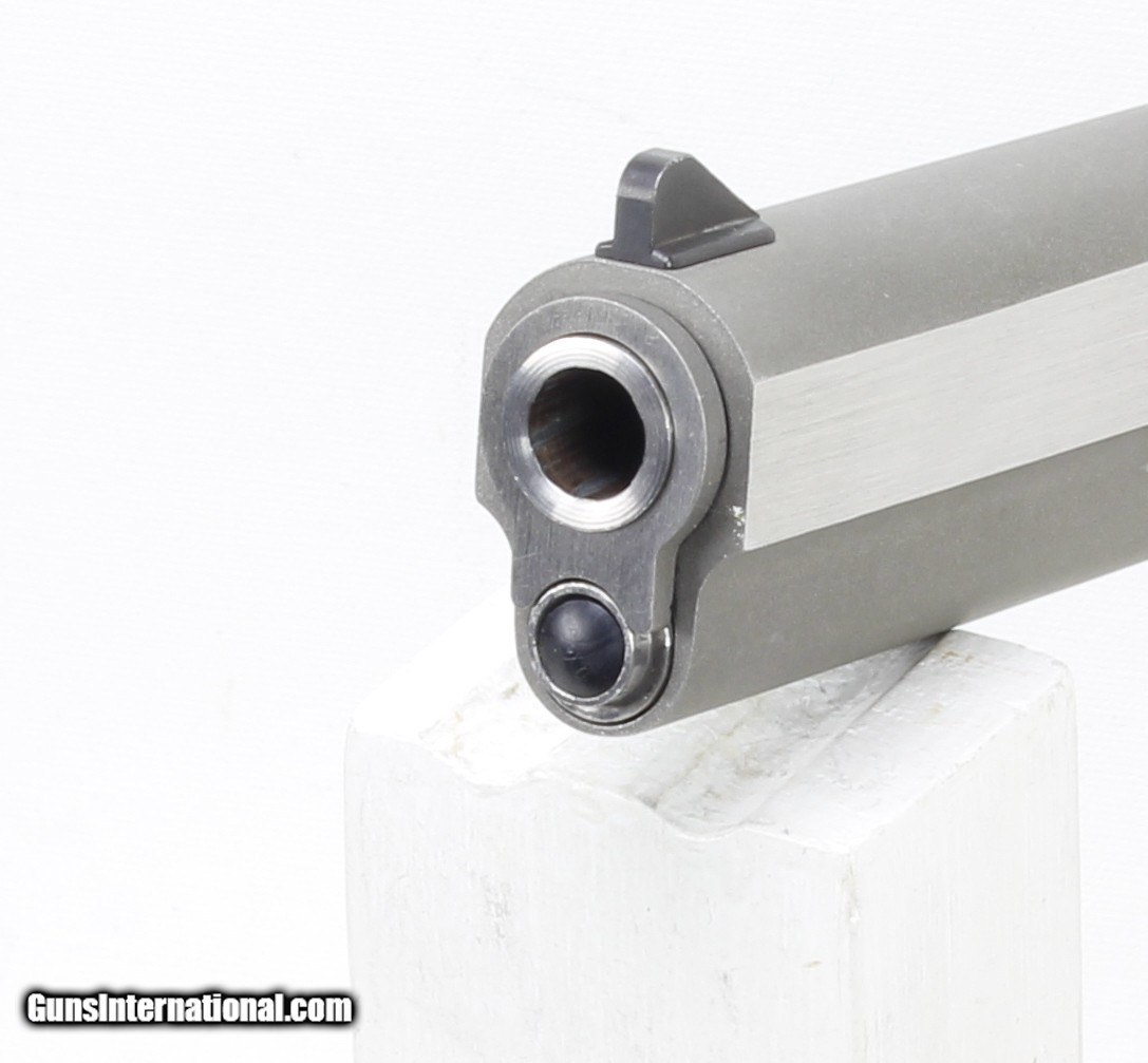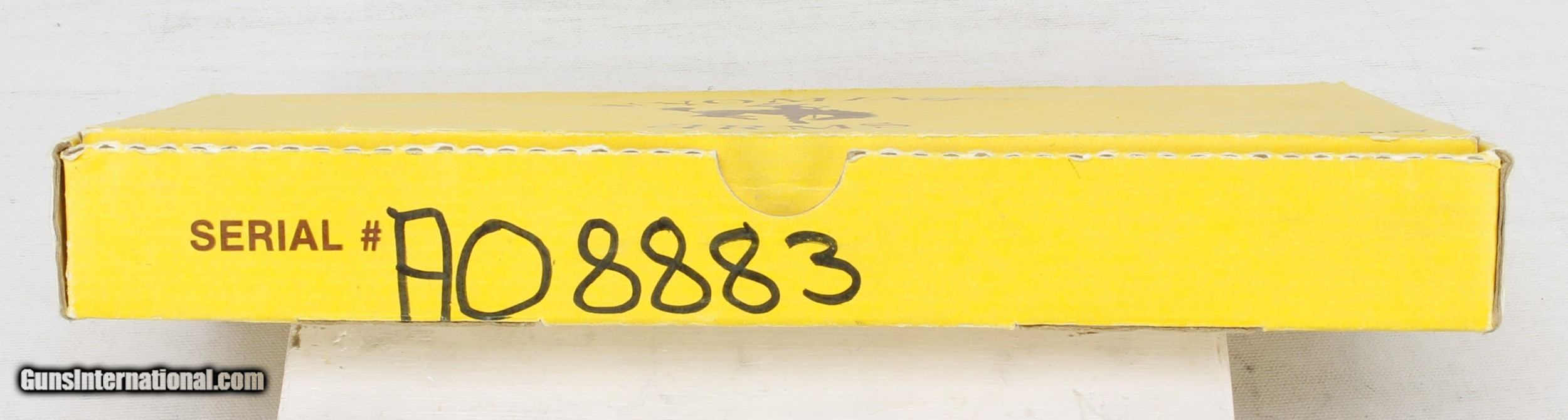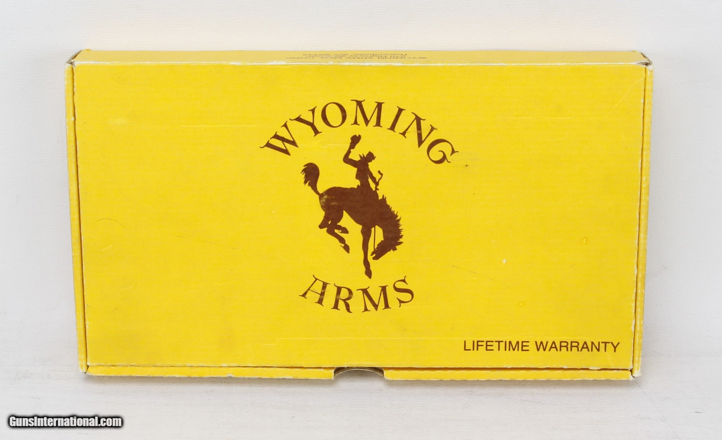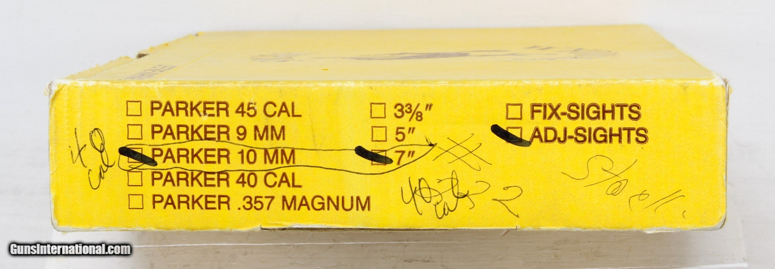 Description: Wyoming Arms Parker 10mm S.S. Pistol. SN #A08883. 7" barrel with an EXCELLENT bore, bright with strong rifling. The Stainless Steel metal finish is in EXCELLENT condition as are the black synthetic grips. Millet adjustable rear sight. Fiber optic front sight. 8 shot magazine. In ORIGINAL BOX with paperwork and hex key. HARD TO FIND ONE IN THIS GREAT CONDITION. Weight: 2.78 lbs. Trigger Pull: 5 1/4 lbs. Ships to Lower 48 W/ Insurance $30.00. SOLD Handgun Caliber: 10mm Auto Manufacturer: Wyoming Arms Model: Parker Serial Number: A08883 Barrel Length: 7 Condition: Excellent Metal Condition: Excellent Bore Condition: Excellent Action: Semi-Auto Finish: Stainless Weight: 2.78 lbs |