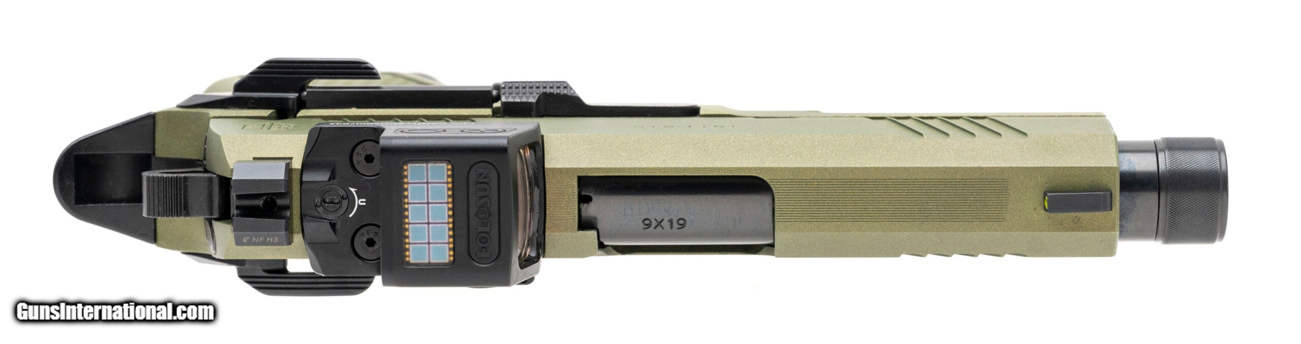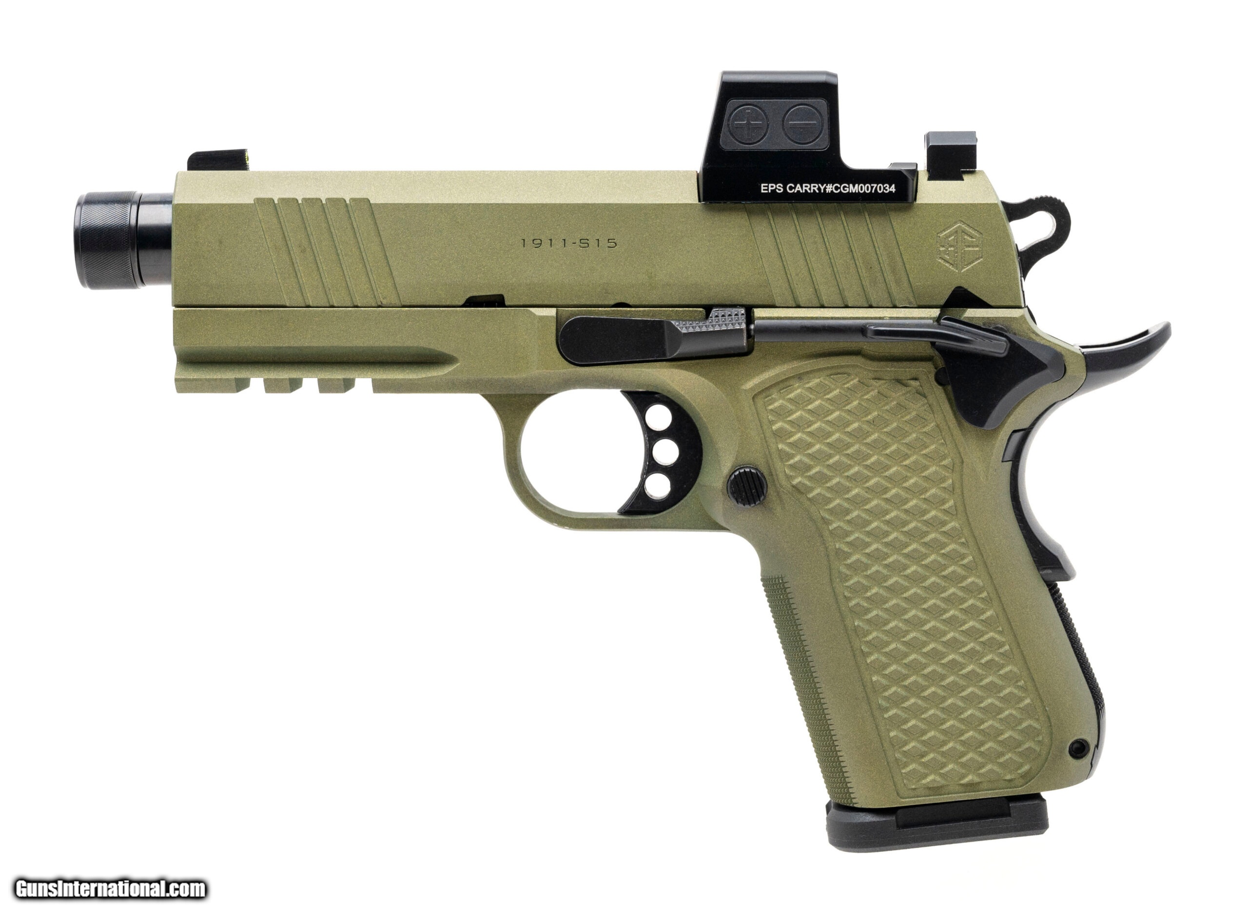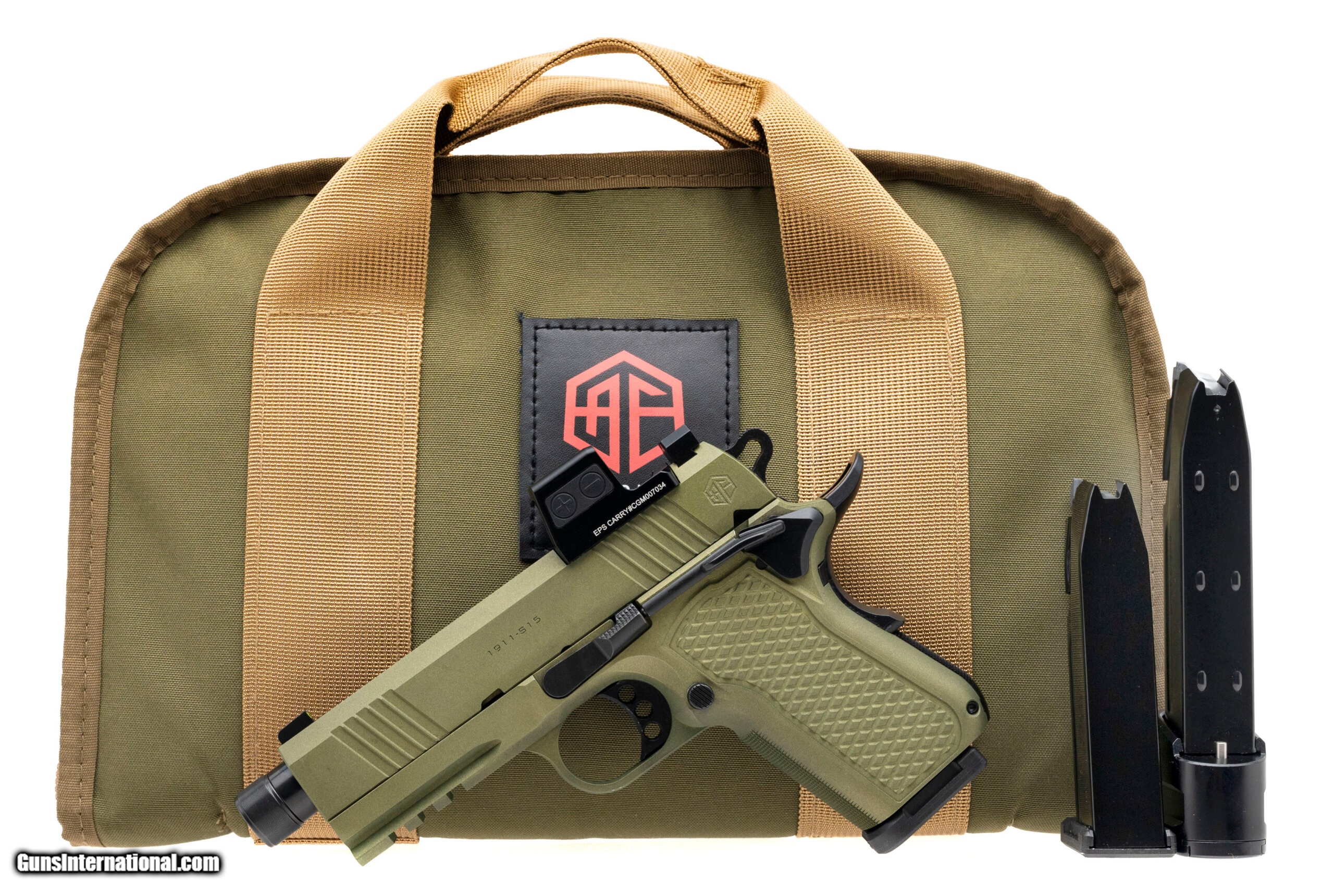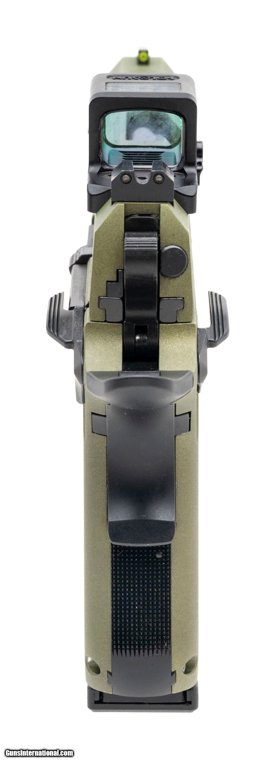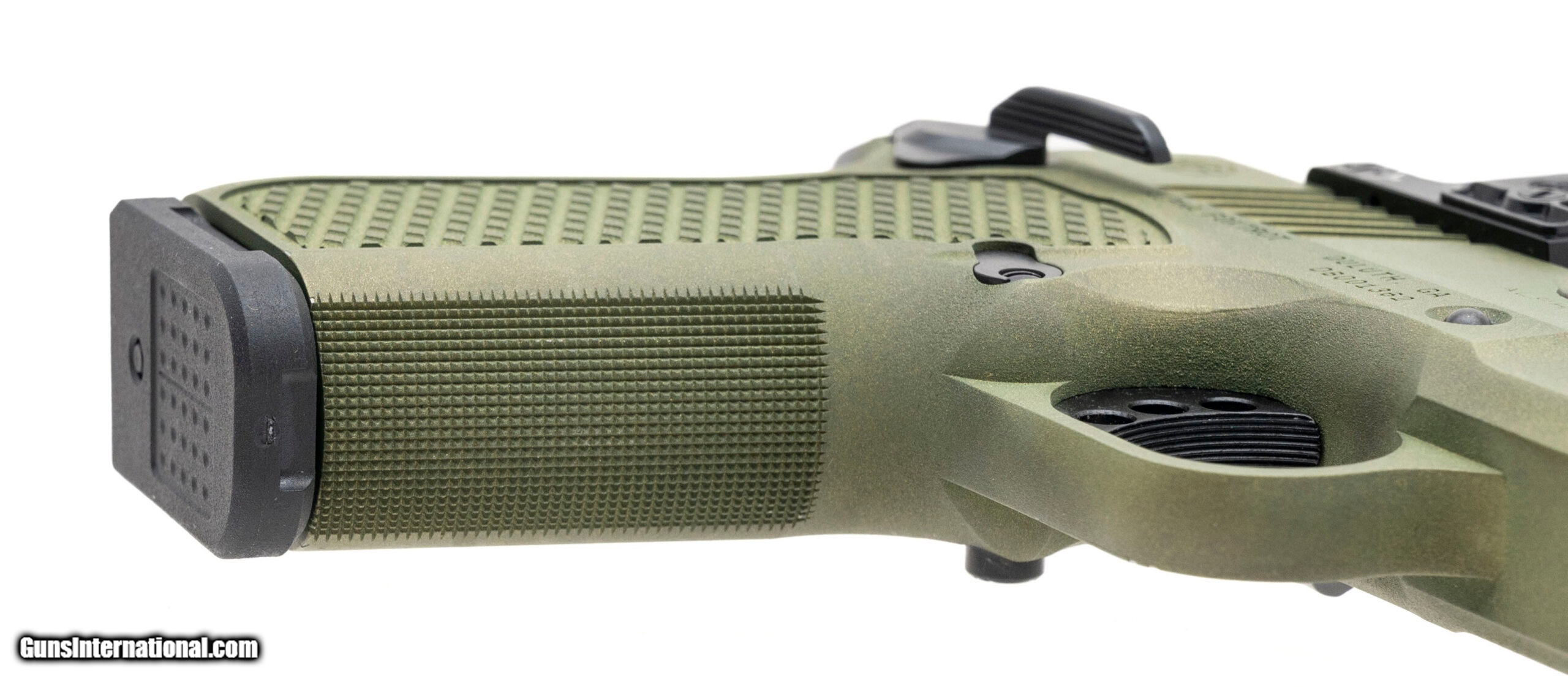 Description: "SN: DB001362. Modern production 9mm with a 4.25"" barrel. Alloy frame double stack 1911-ish pistol with green finish. Uses Shield Arms mags. Has a Holosun RDO. Excellent condition with pouch and 2 extra mags. SOLD |