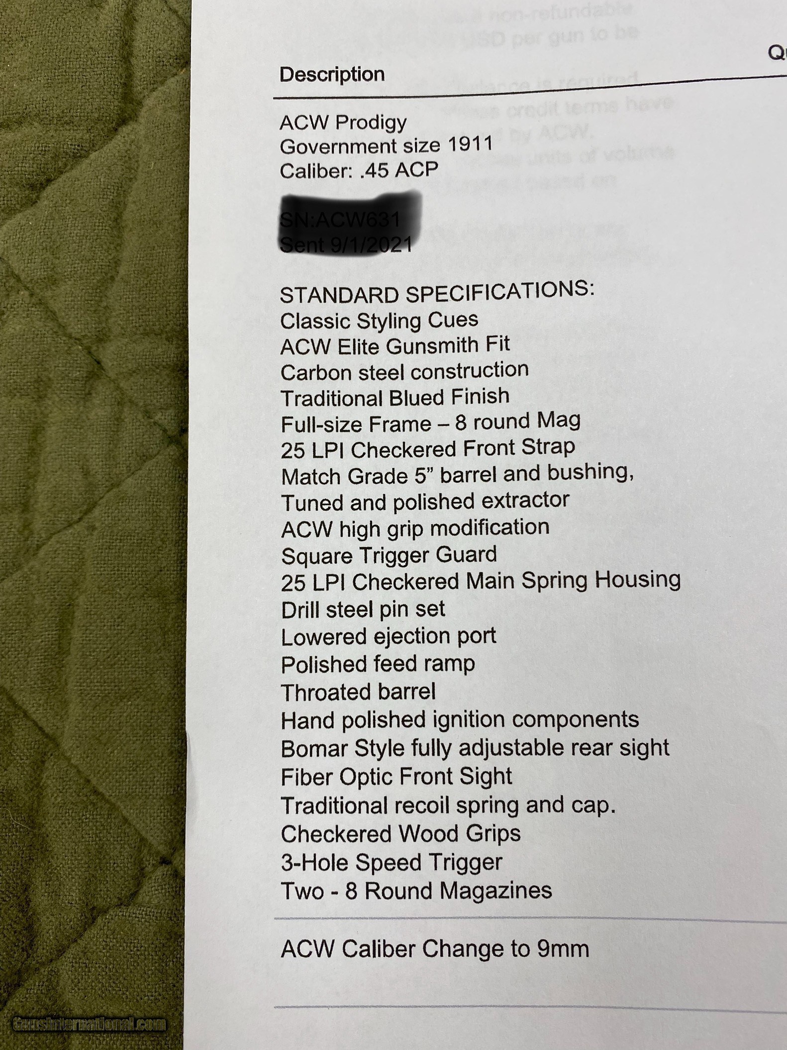 Description: Up for sale is New Alchemy Custom Weaponry Prodigy Chambered in 9mm. This pistol is hard fit and comes with an accuracy guarantee & test target. Better than 1’’25 Yards. I will say this, I sell a few different lines in custom 1911’s new and used. ACW right now is the best gun for the money spent. Rob Schauland and his team have a fiery passion for the 1911 and the final product shows just that. Right now, this has a lead time of 7-11 months depending on the options. This is ready for its new home. We stock a vast array of Caesar Guerini, Fabarm, Syren, Blaser, Merkel, Nighthawk Custom, Cabot Gun, and many more vintage guns too. It is impossible for me to list everything I will special order you anything your heart desires. Thanks for looking. WHY IRON COWBOY? Buying a fine gun is not shopping cart transaction. Buying from Iron Cowboy means buying a gun from me. It means buying from someone as passionate as you about fine guns. I want you to get the right gun both for you and your application, and my advice reflects what I feel is in your best interests. No clerks, no ‘other’ salesman – just me. Odds are we will have a discussion on my shooting experience with the gun you are after, and every transaction gets my personal best. Thank you, as always, for looking. GROWTH THROUGH SERVICE Everyone is a customer at some point. I’ve taken the good from my experiences and apply it to my transactions. I’ve taken the bad and sworn to never pass that same experience on to my customers. I strive to act the way I would respect someone else for acting. In this way, Iron Cowboy differentiates itself with growth through service and repeat business. It’s my commitment to you, my customer. Iron Cowboy Gun Shop, LLC Edward Kondraski III (570) 733-2042 SOLD Handgun Caliber: 9x19mm Parabellum (9mm Luger, 9x19mm NATO) Manufacturer: Alchemy Custom Model: Prodigy Barrel Length: 5 Bore: New Condition: New Finish: Blued Sights: Rear Adj Extras: Hard Fit Item Location: PA |