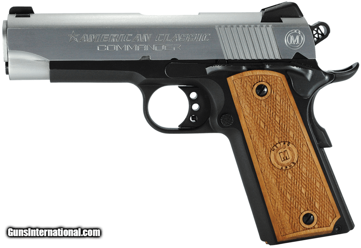 Description: Guns Listing ID: 296909 The American Classic Commander has all the features of the full-size Classic II but is lighter and easier to conceal. American Classic Commanders are a series of 1911 pistols chambered in 9mm (9x19) or 45 ACP. This pistol features a 4140 steel frame hammer forged 4140 steel slide with front and rear cocking serrations and forged steel throated 4.25 barrel. This pistol also offers dovetail front and Novak-style rear sights hardwood grips beavertail grip and thumb safeties extended slide stop lowered ejection port and skeletal combat hammer. Details Action Single Action - Caliber .45 ACP - Capacity 8 - Grips Wood wDiamond Cut - Sights NovakDovetail - Finish ChromeDeep Blue - Barrel Length 4.25 SOLD Manufacturer: AMERICAN CLASSIC Model: 1911 COMMANDER Caliber Info: 45 ACP Condition: new Barrels: 4.3 BARREL |