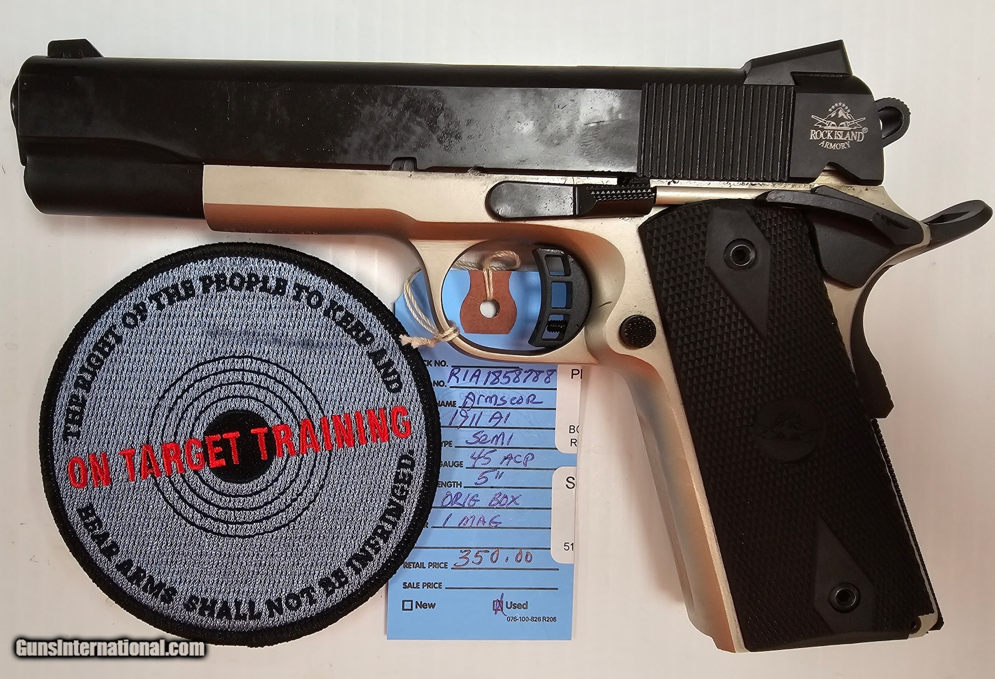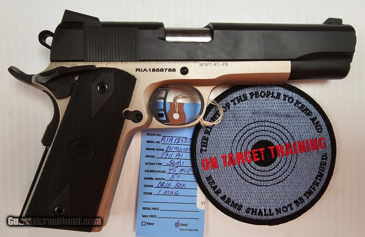 Description: Guns Listing ID: 906048 LIKE NEW BUT PRE-OWNED ARMSCOR 1911 A1 WITH ORIGINAL BOX AND 1 MAGAZINE. THIS IS A MODEL ROCK STANDARD FS 2TONE AND IT‚‚S REALLY SHARP LOOKING. HAS ORIGINAL MANUAL AND OTHER PAPERS. NO DINGS, DENTS OR SCRATCHES, UNBLEMISHED, COULD BE MISTAKEN FOR NEW. We put all the information we have about these guns / items on the blue shop tags and the on-line listing. PRICES ARE FIRM, NO OFFERS ACCEPTED . Not interested in trades. We do not offer layaway. We reserve the right to sell this item in our store or on other s at any time. Please be certain that you want this item as all sales are final. Used guns and parts almost always have some small degree of imperfection visually, and we do not have the ability to test fire, so we are never 100% certain of the functionality. No warranty is stated or implied SOLD Manufacturer: ARMSCOR Model: ROCK SERIES Caliber Info: .45 ACP Condition: Used - Non-Certified Barrels: 5 BARREL |