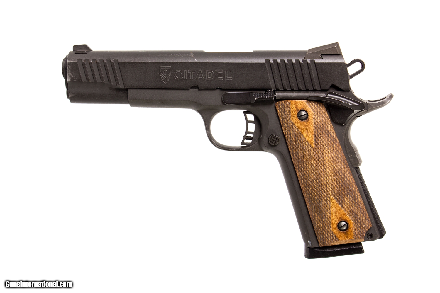 CITADEL 1911 A1-FS 45 ACP 5 INCH BARREL . FIXED FRONT AND REAR SIGHTS. STEEL FRAME . EXTENDED BEAVER TAIL GRIP SAFETY. WALNUT CHECKERED GRIPS. COMES WITH A CASE, AN EXTRA MAGAZINE AND GRIPS.This gun is in excellent condition and is covered by Dury's Lifetime Warranty.