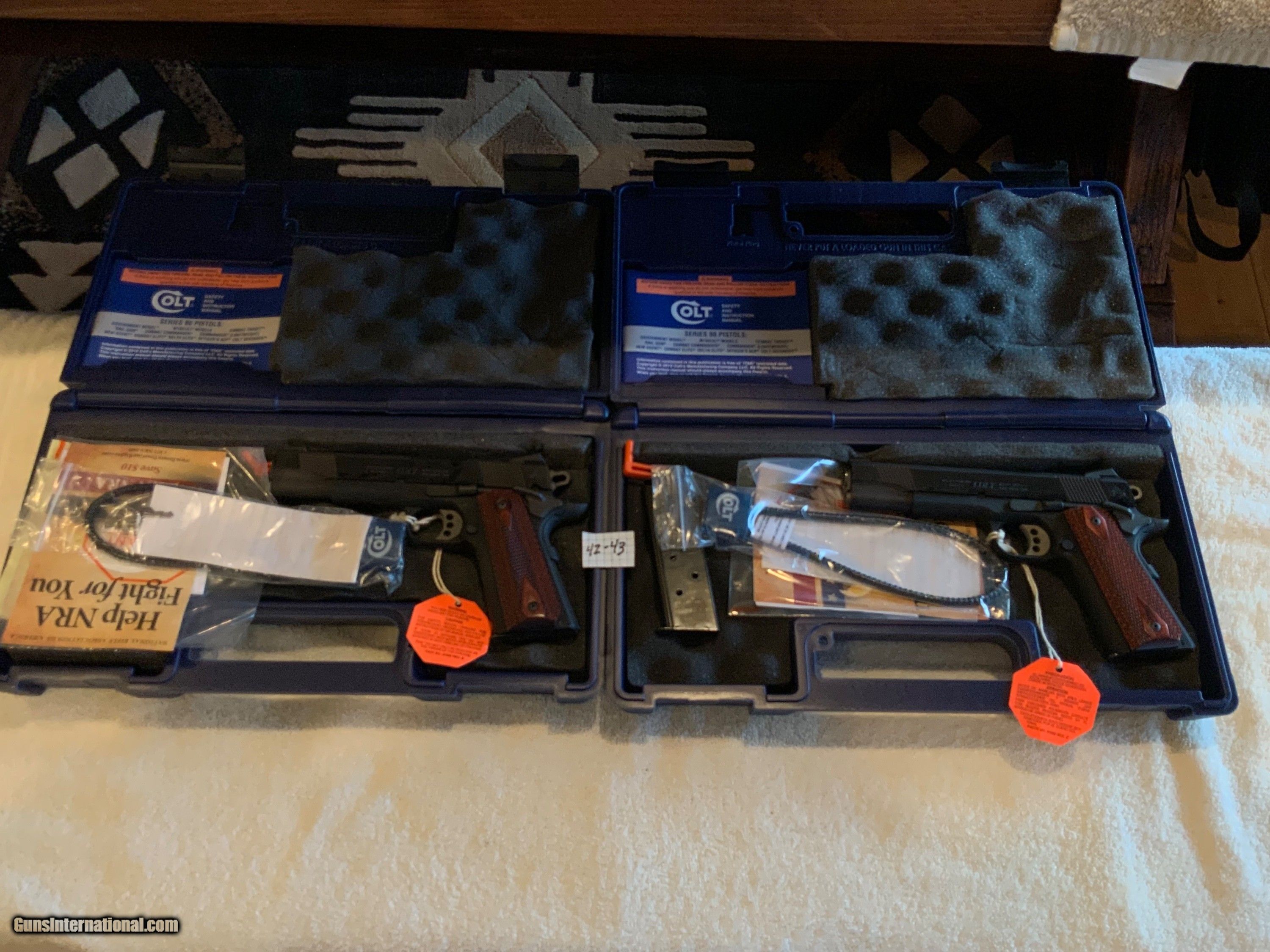 Description: This is a primo Colt 1911 - 100 Year Anniversary edition, Lightweight Government model. This pair also has sequential serial numbers in which you might never find this rareity again. Rifle Caliber: .45 ACP Handgun Caliber: .45 ACP (.45 Auto) Manufacturer: colt Model: 01880XSE Serial Number: LWG-1901-1902 Barrel Length: 5 Condition: Very Great NIB Metal Condition: Very Great NIB Wood Condition: Very Great NIB Price: $2,400.00 Shipping: $50.00 Contact Seller |