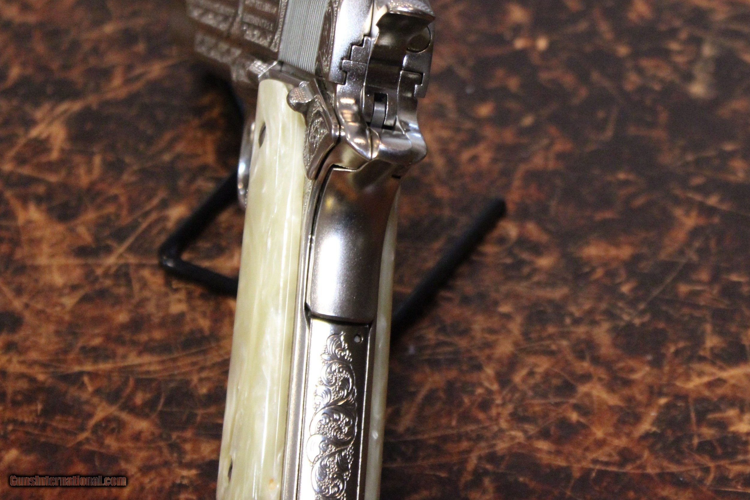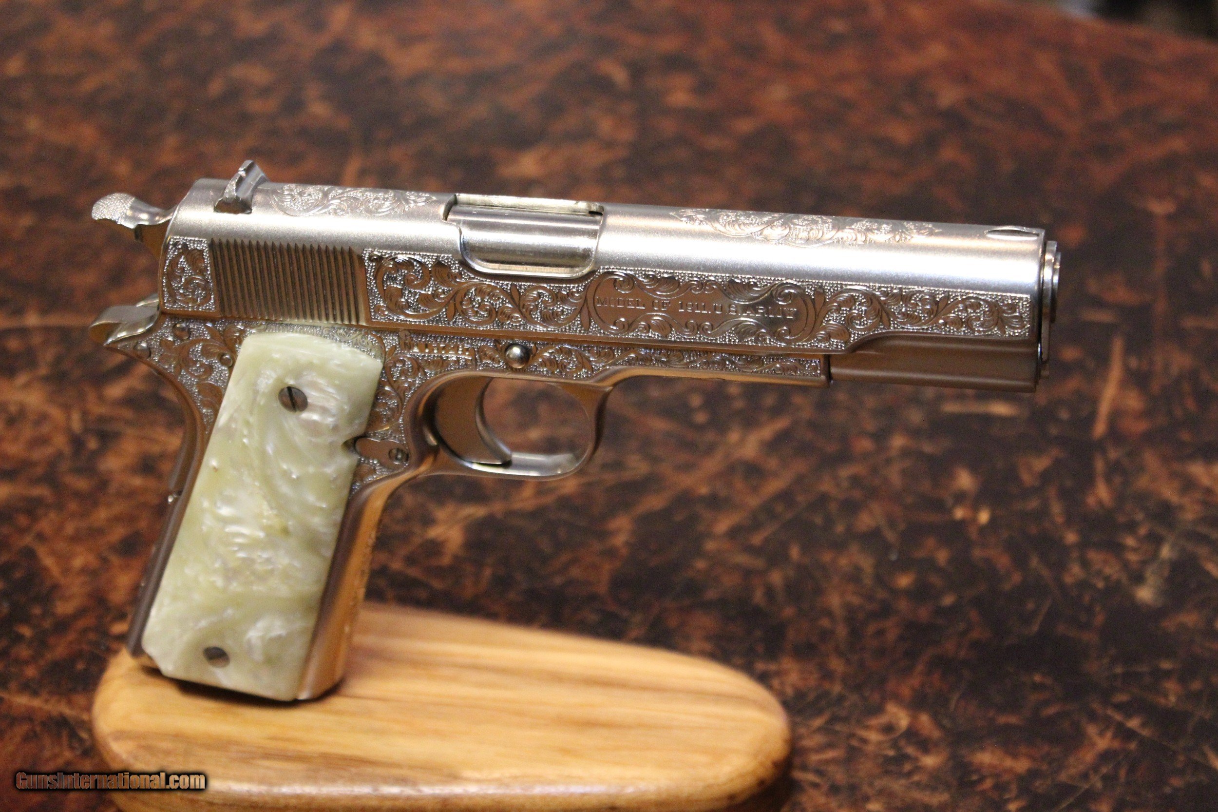 Description: COLT 1911,BUILT IN 1916,ENGRAVED IN FULL COVERAGE AND NICKELED BY ORVILLE MAHAN OF OKLAHOMA IN THE EARLY 70'S. HE WAS KNOWN IN THE MID-WEST AND TEXAS FOR HIS ENGRAVING,HIS WORK IS INITIALED ON THE BOTTOM OF THE TRIGGER GUARD. ALL PARTS ARE ORIGINIAL TO THE GUN. EXCEPT THE MAGAZINE. SOLD |