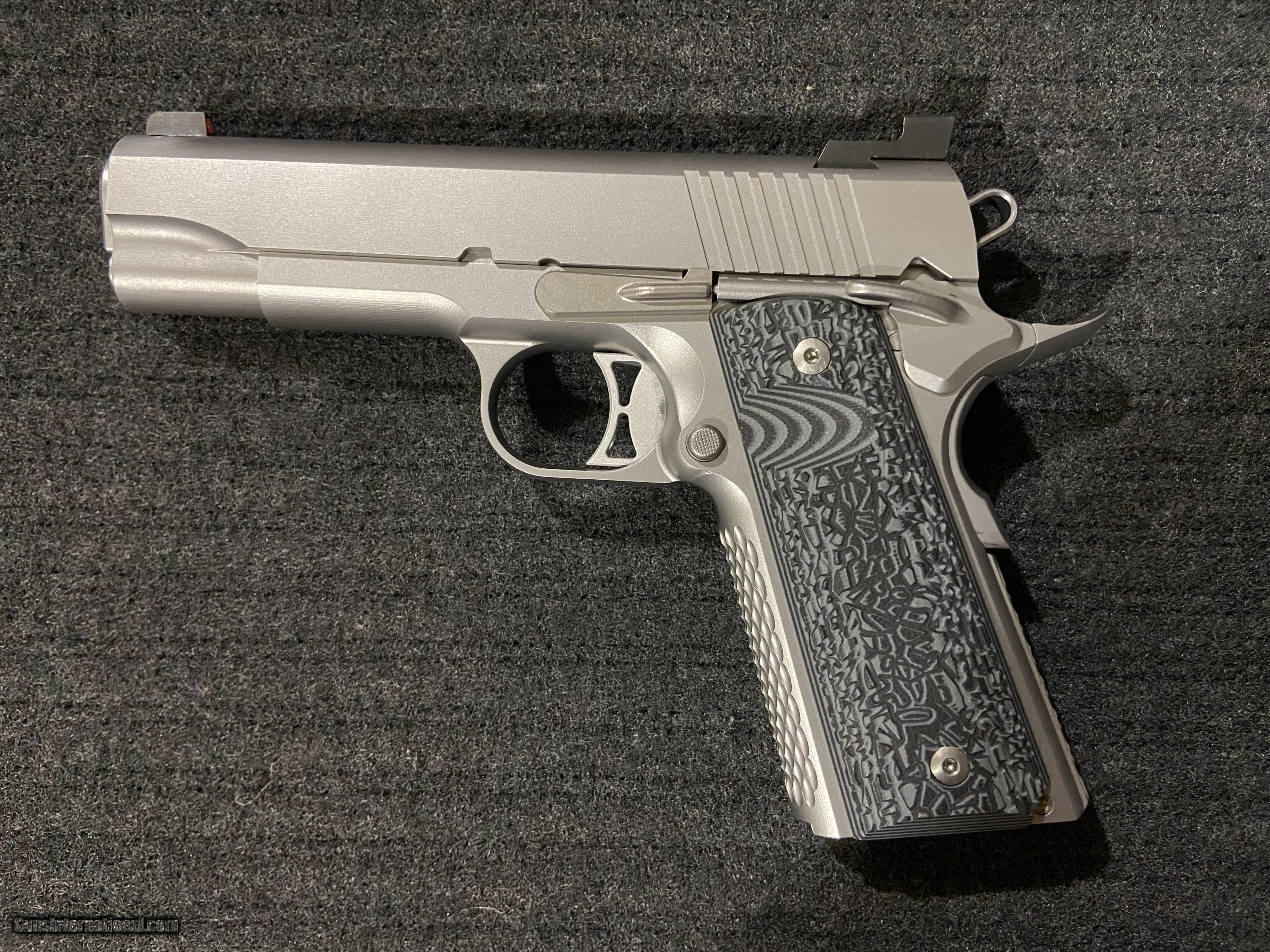 Description: A custom built series 70, 1911 Commander in 45acp. Pistol is based on a forged stainless hand matched Custom Arms frame and slide. Barrel is match grade, small parts are all premium hardened competition quality steels, sights are Trijicon HD Night Sights - 1911 Novak Style Low Mount Dovetail Cut, and the magazines are Wilson Combat Elite Tactical 8 round. All pistols by Custom Arms LLC, Phoenix AZ are test fired with over 100 rounds of various ammo styles and competition validated prior to bead blast and blue. Flawless operation every shot. This is a true custom shop pistol with numerous ergonomic upgrades including a nicely blended beaver tail grip safety, finger relief at back of trigger guard, and flat topped slide with serrations. Comes with Voodoo Tactical soft case, 5 Wilson Combat magazines, wrench. 3K to build SOLD Handgun Caliber: .45 ACP (.45 Auto) Manufacturer: Custom Arms LLC Model: 1911 Commander Barrel Length: 4.25 Condition: Like New Metal Condition: Like New Bore Condition: Like New |