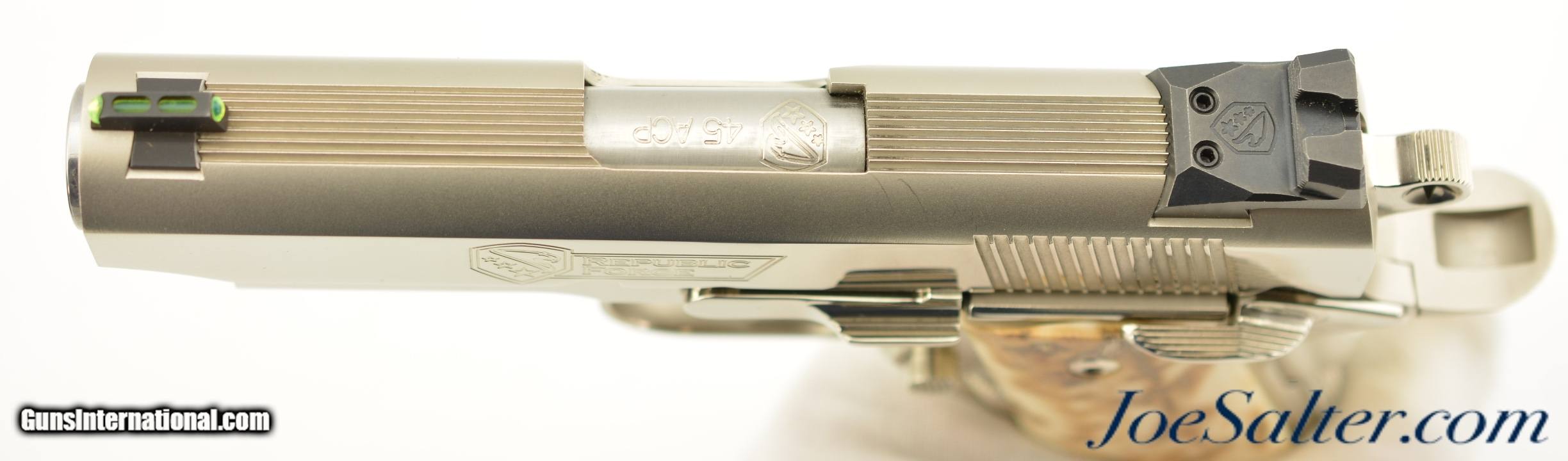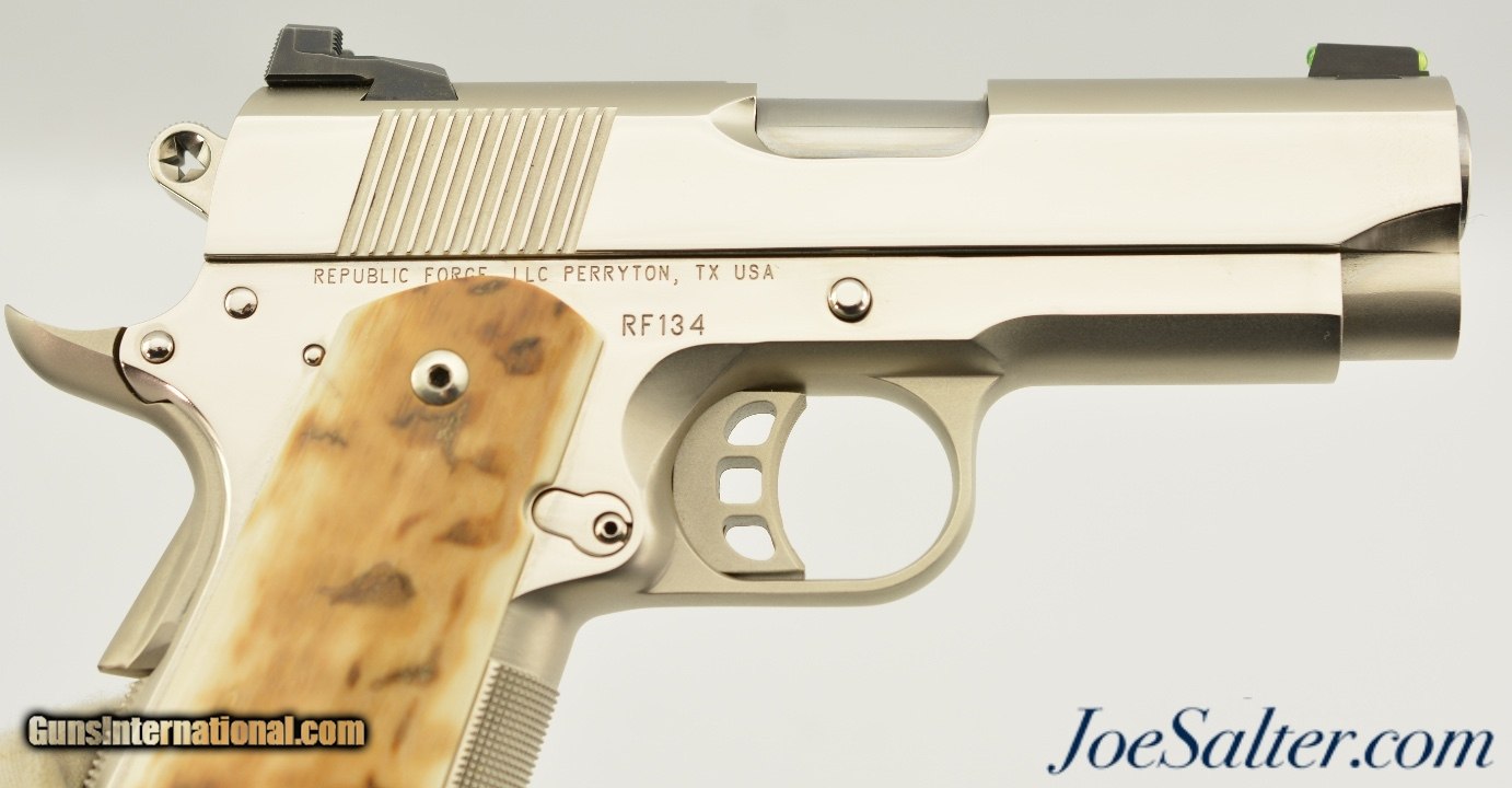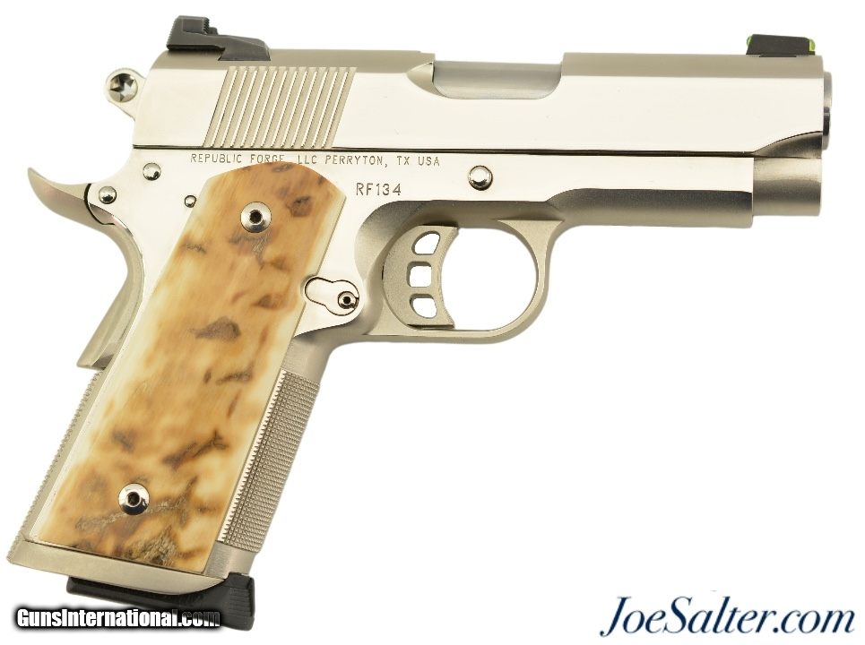 Description: Serial #RF134, .45 ACP, 3 ?? inch barrel with a bright, excellent bore. This is a custom made model 1911 pistol manufactured by Republic Forge, LLC in Perrytown, Texas. The custom compact features an all stainless frame and slide with fiber optic front sight, Texas Star custom hammer and features custom exotic grade Mammoth Tusk with a beautiful cream bark pattern signed by Daniel J. Chinnock with a 10/2015 date. In excellent plus condition the bright stainless finish is 98-99% showing only minor handling blemishes. The grips are likewise excellent showing only the natural inclusions of the ancient ivory. A Beautiful custom Texas made gun in a configuration no longer available from the new ownership of the company. It comes in an original Republic Forge multi pocket zippered range bag with one seven round CobraMag HV magazine plus one unmarked stainless mag, oilers and lock. A beautiful, Custom Republic Forge 1911 in a configuration that is no longer available with exotic grips from a very well known maker. FFL SOLD |