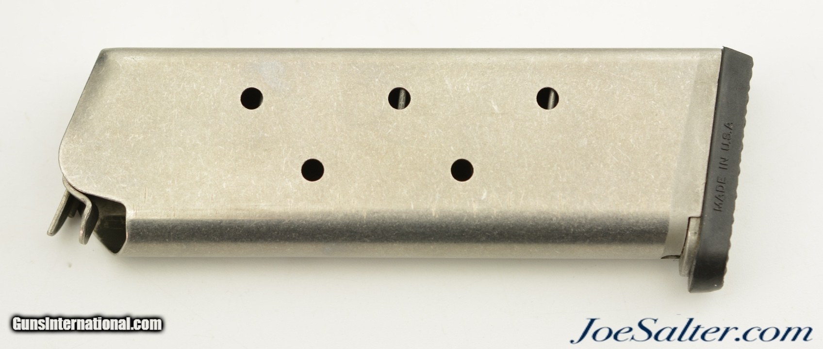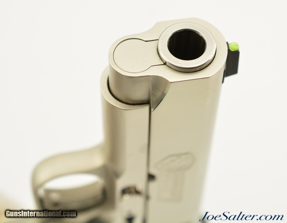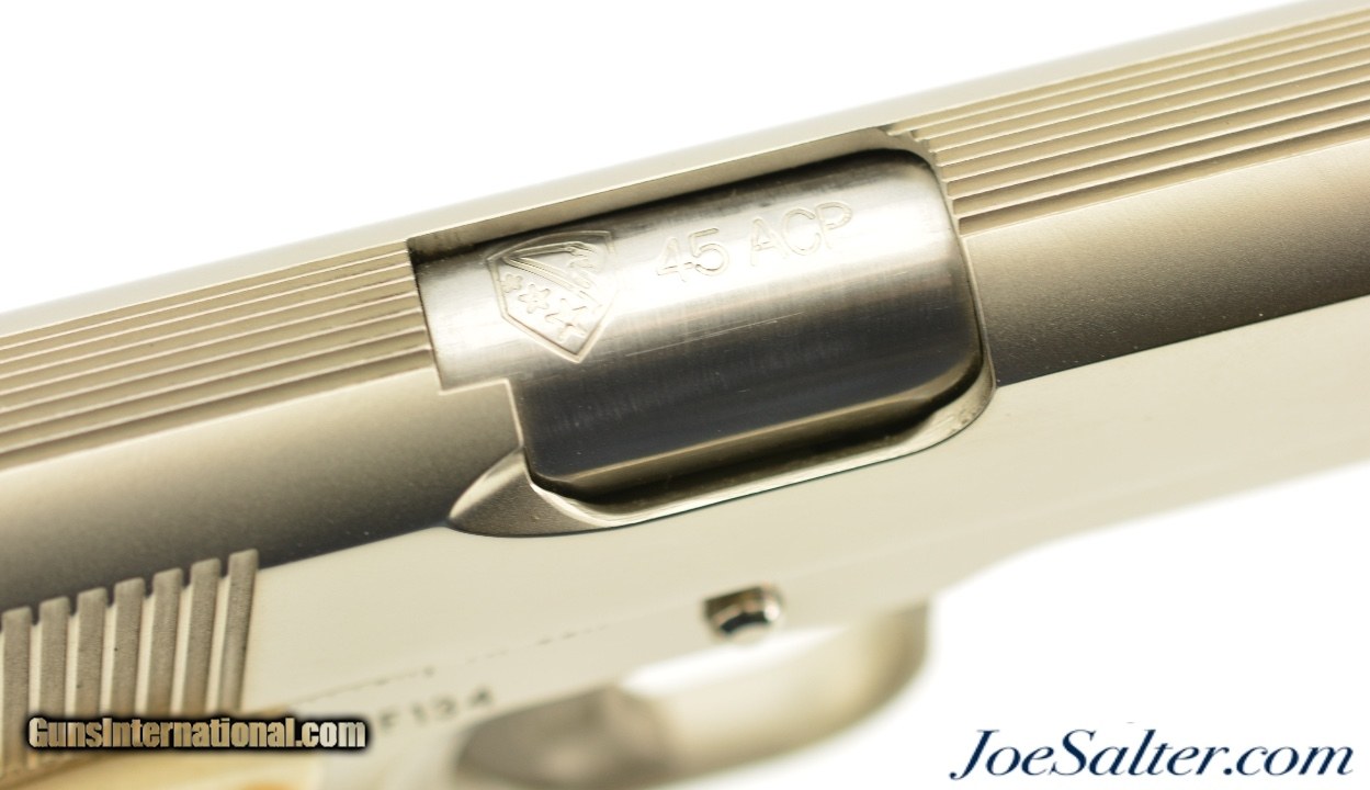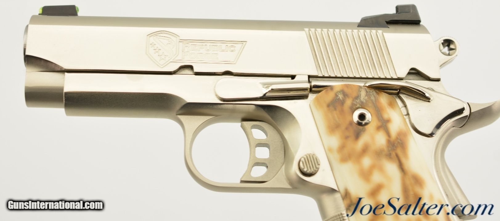 Description: Serial #RF134, .45 ACP, 3 ?? inch barrel with a bright, excellent bore. This is a custom made model 1911 pistol manufactured by Republic Forge, LLC in Perrytown, Texas. The custom compact features an all stainless frame and slide with fiber optic front sight, Texas Star custom hammer and features custom exotic grade Mammoth Tusk with a beautiful cream bark pattern signed by Daniel J. Chinnock with a 10/2015 date. In excellent plus condition the bright stainless finish is 98-99% showing only minor handling blemishes. The grips are likewise excellent showing only the natural inclusions of the ancient ivory. A Beautiful custom Texas made gun in a configuration no longer available from the new ownership of the company. It comes in an original Republic Forge multi pocket zippered range bag with one seven round CobraMag HV magazine plus one unmarked stainless mag, oilers and lock. A beautiful, Custom Republic Forge 1911 in a configuration that is no longer available with exotic grips from a very well known maker. FFL SOLD |