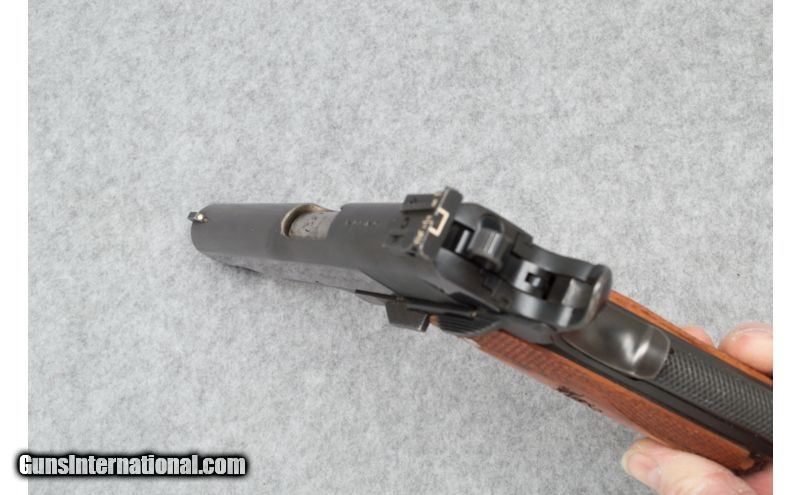Description: Used SOLD Caliber Info: .45 ACP Metal Condition: Good; abrasion around port Wood Condition: Excellent: Original grips have been replaced Bore Condition: Clean & Sharp; bore appears to be rough Barrels: 5 Triggers: Grooved Stock: Checkered hardwood; not original to gun Weight: 38 oz. Sights: Blade Front: White Dot / Rear: Adjustable Target Style Extras: With two mags.; 1911 SA with grip safety Item Location: Sun Prairie, WI |