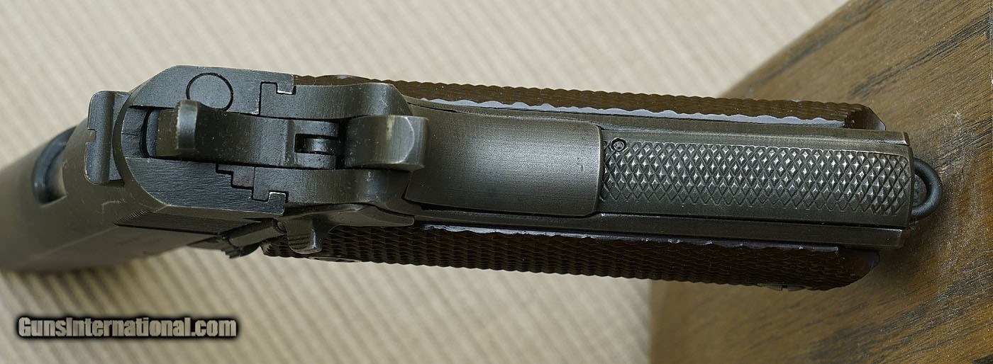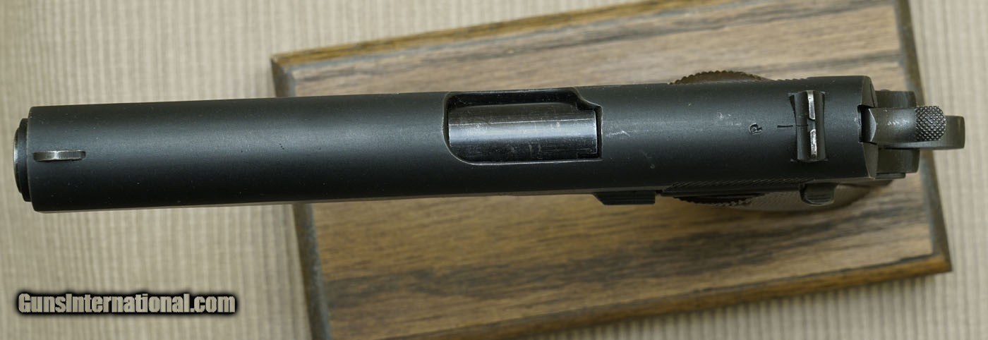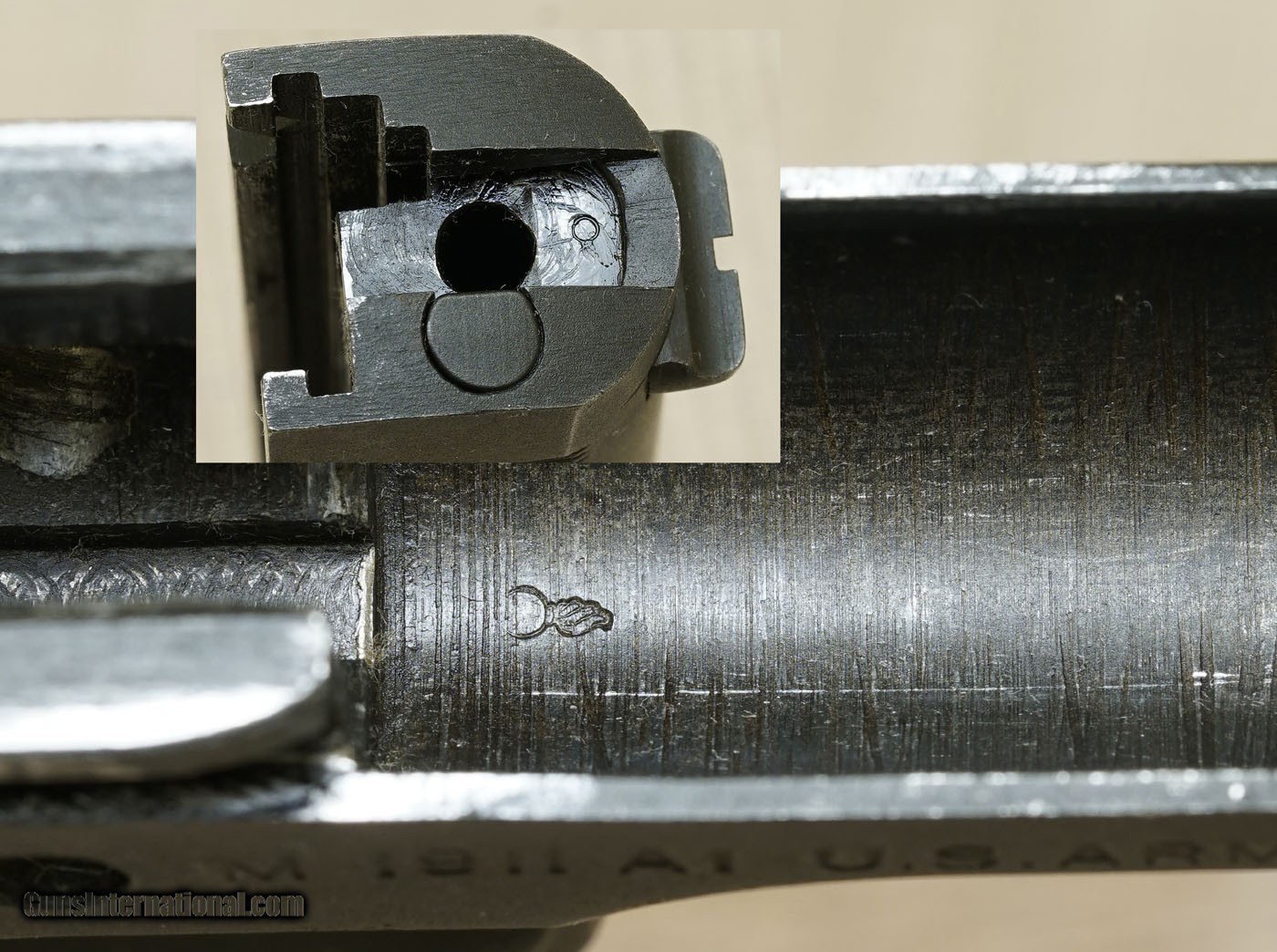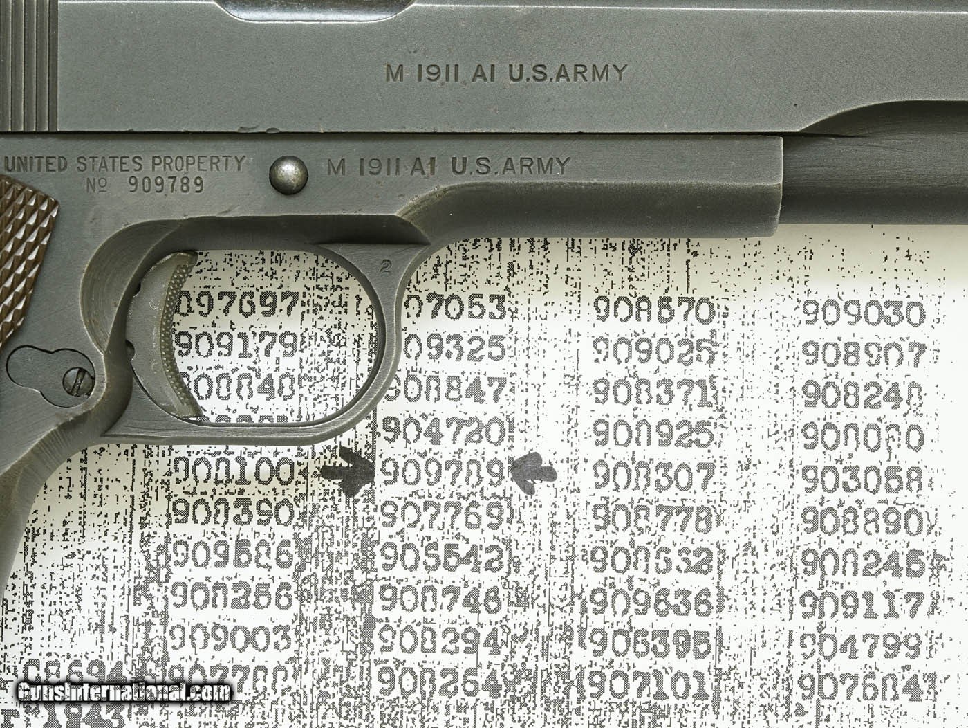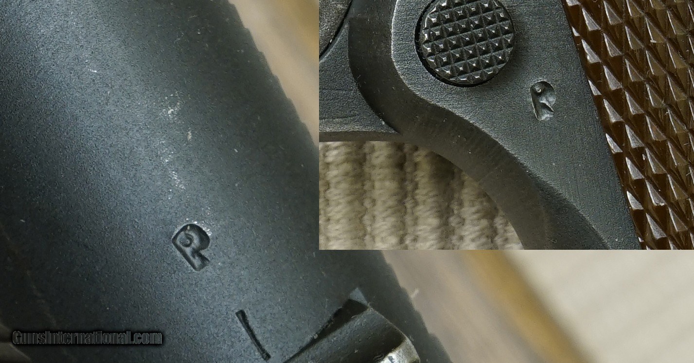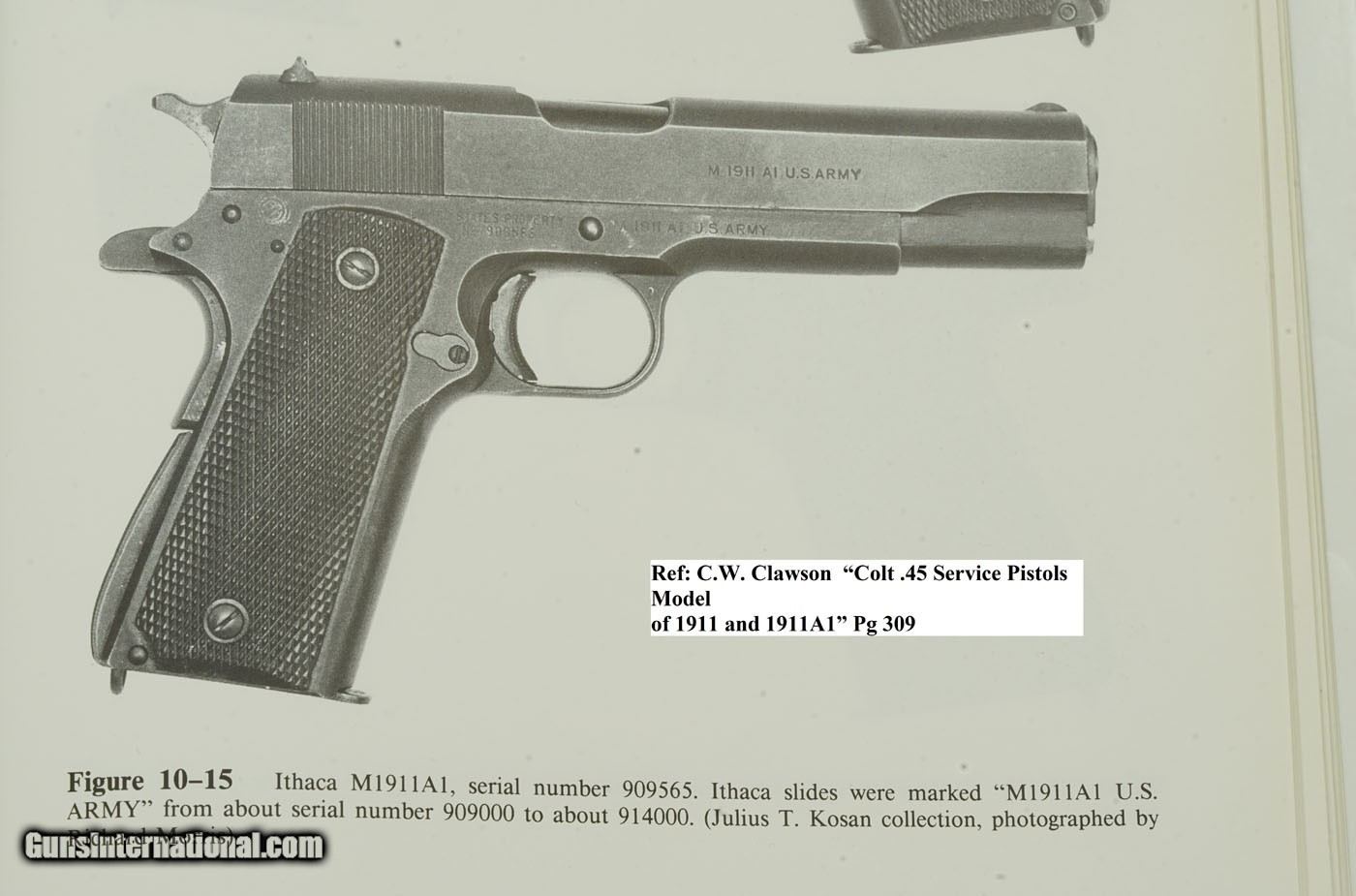 Description: Ithaca made a number of replacement slides in 1943 with slide marking MODEL 1911 A1 U.S. ARMY on the right side. The requirement for this slide marking was discontinued on 10/15/1943, but Ithaca continued to use these slides on hand for regular production. Most of these double stamped Ithacas were found within S/N range of 906753-916404. (Ref: Meadows book “US Mil. Auto Pistols” Pg 109.) Also in Clawson’s “Big Book” on Pg. 309 showing pistol S/N 909565 with double stamp feature. The subject Ithaca listed for sale is 909789 with S/N also found in Ithaca’s shipping records showing delivery on 9/15/1943 to Raritan Ordnance Depot in NJ. Pistol is in excellent mechanical condition, with original parkerized finish. Slide and frame P-proof marks are matching; other Ithaca specific small parts are also correct. HS barrel with excellent bore. Need FFL or C&R license to ship. Seller will include a copy of FFL for buyer’s record. SOLD Curio/Relic: Yes Handgun Caliber: .45 ACP (.45 Auto) |