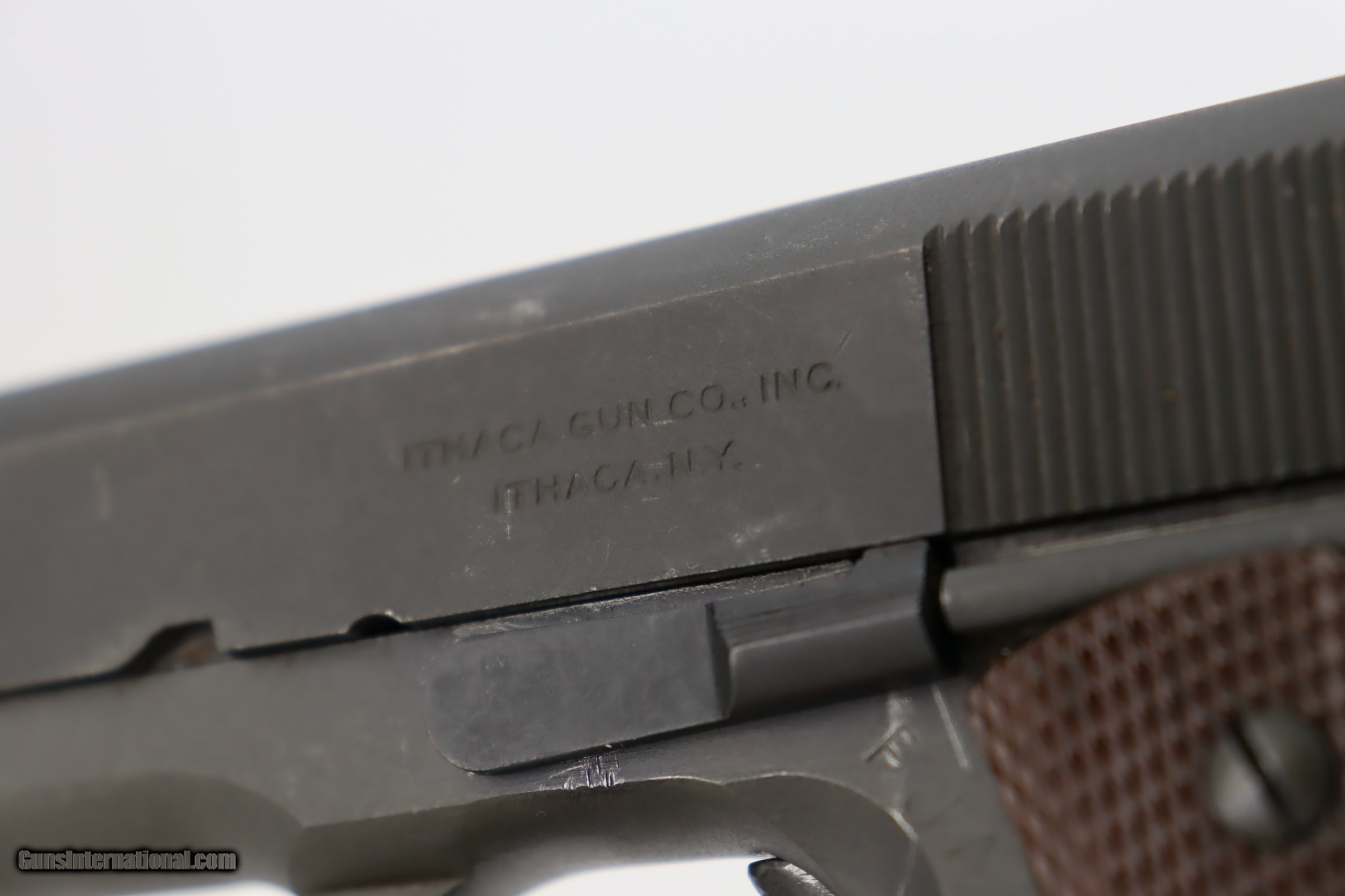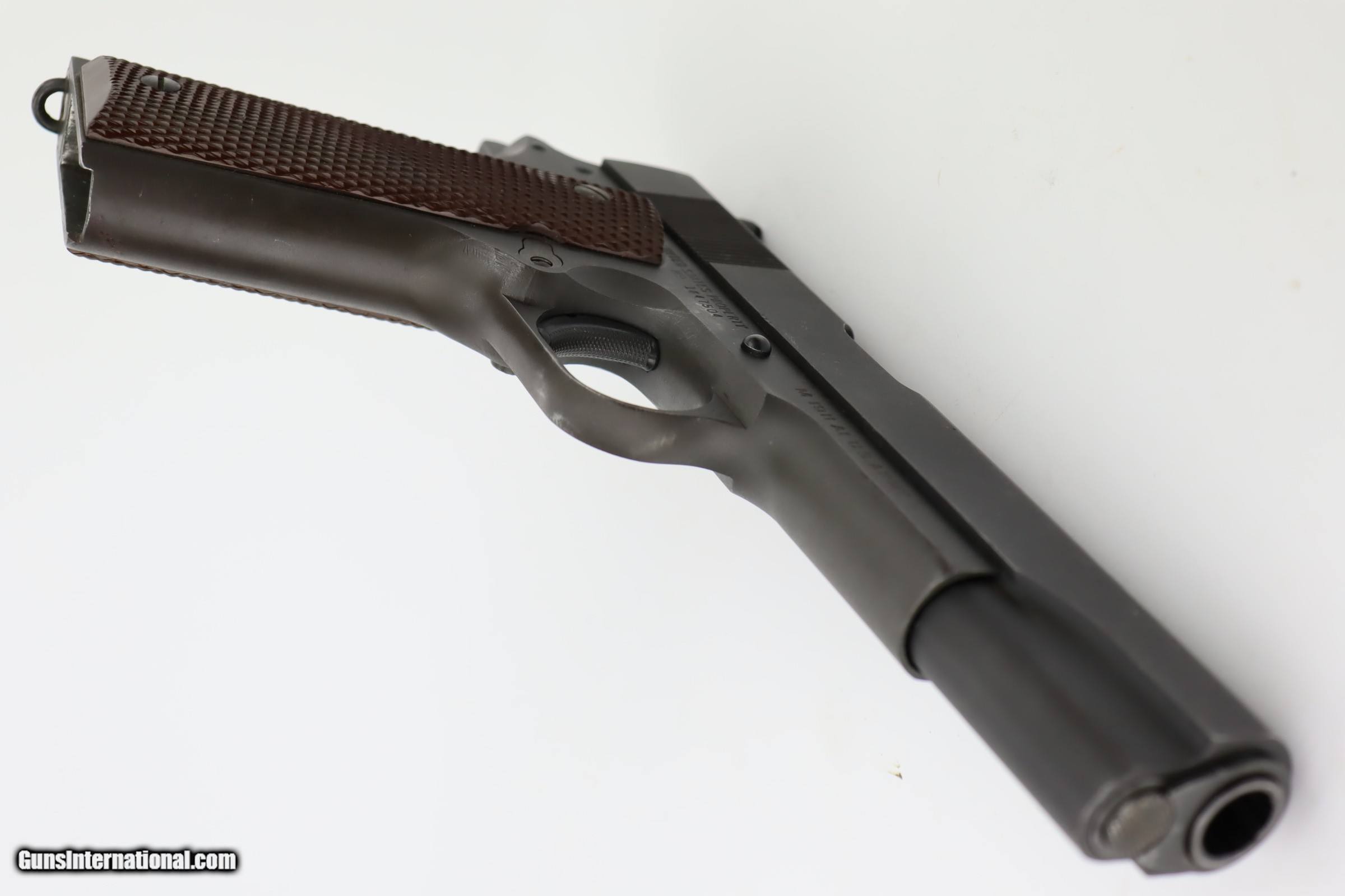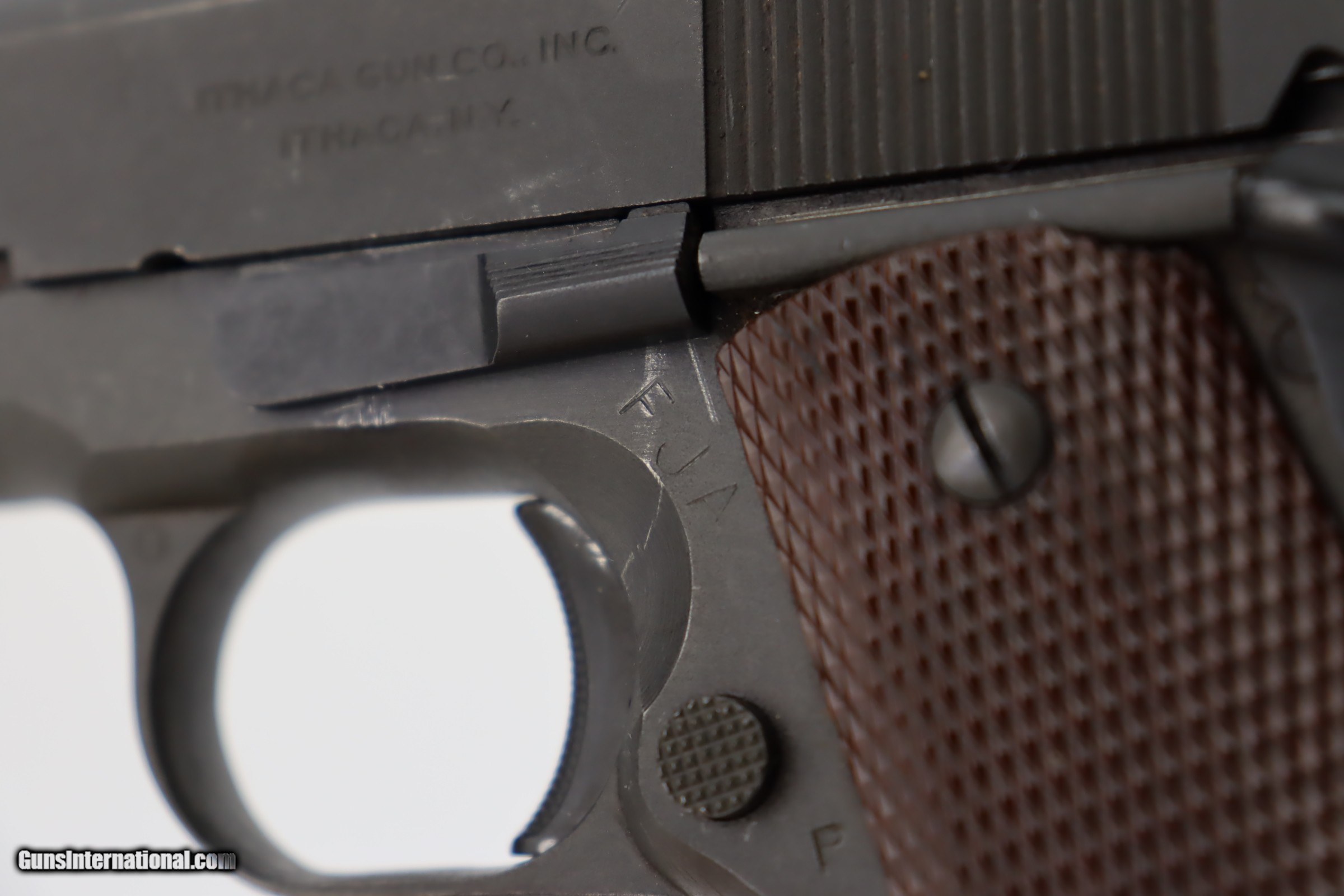 Description: This is an excellent, original Ithaca 1911A1 from early in 1945. It has about 95% of the original finish remaining, with wear on the forward high edges of the frame and around the muzzle, and a spot of wear around the serial number. Proper Flannery barrel with excellent bore. Excellent grips with sharp checkering and no notable defects. Risdon magazine. SOLD Curio/Relic: Yes Handgun Caliber: .45 ACP (.45 Auto) |