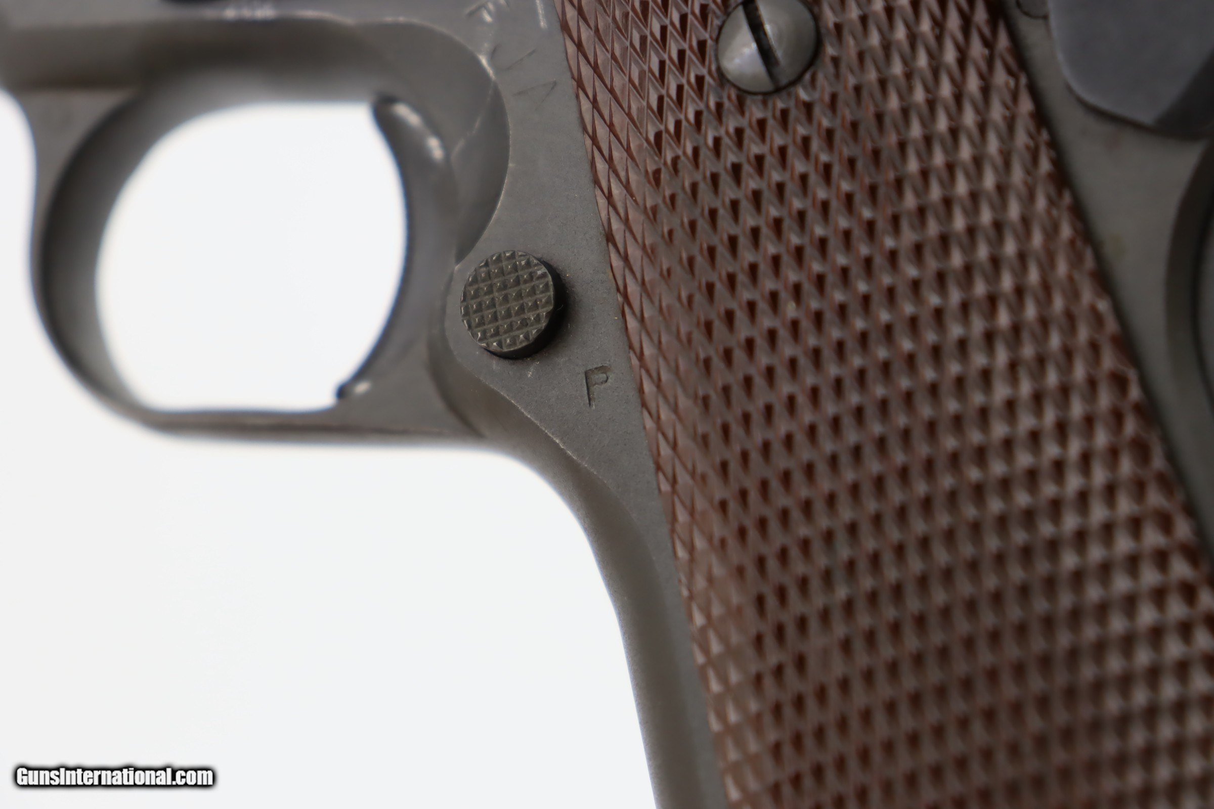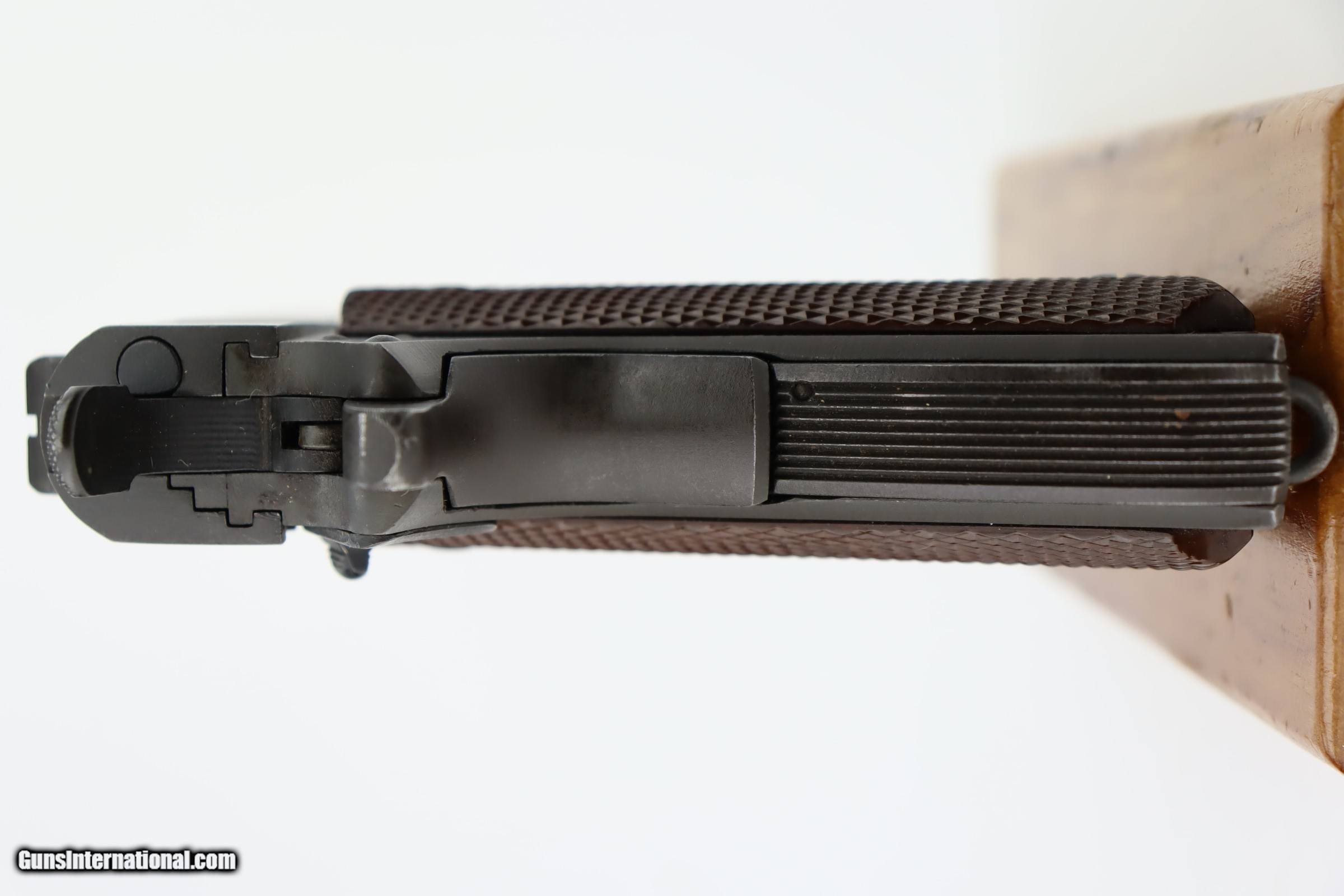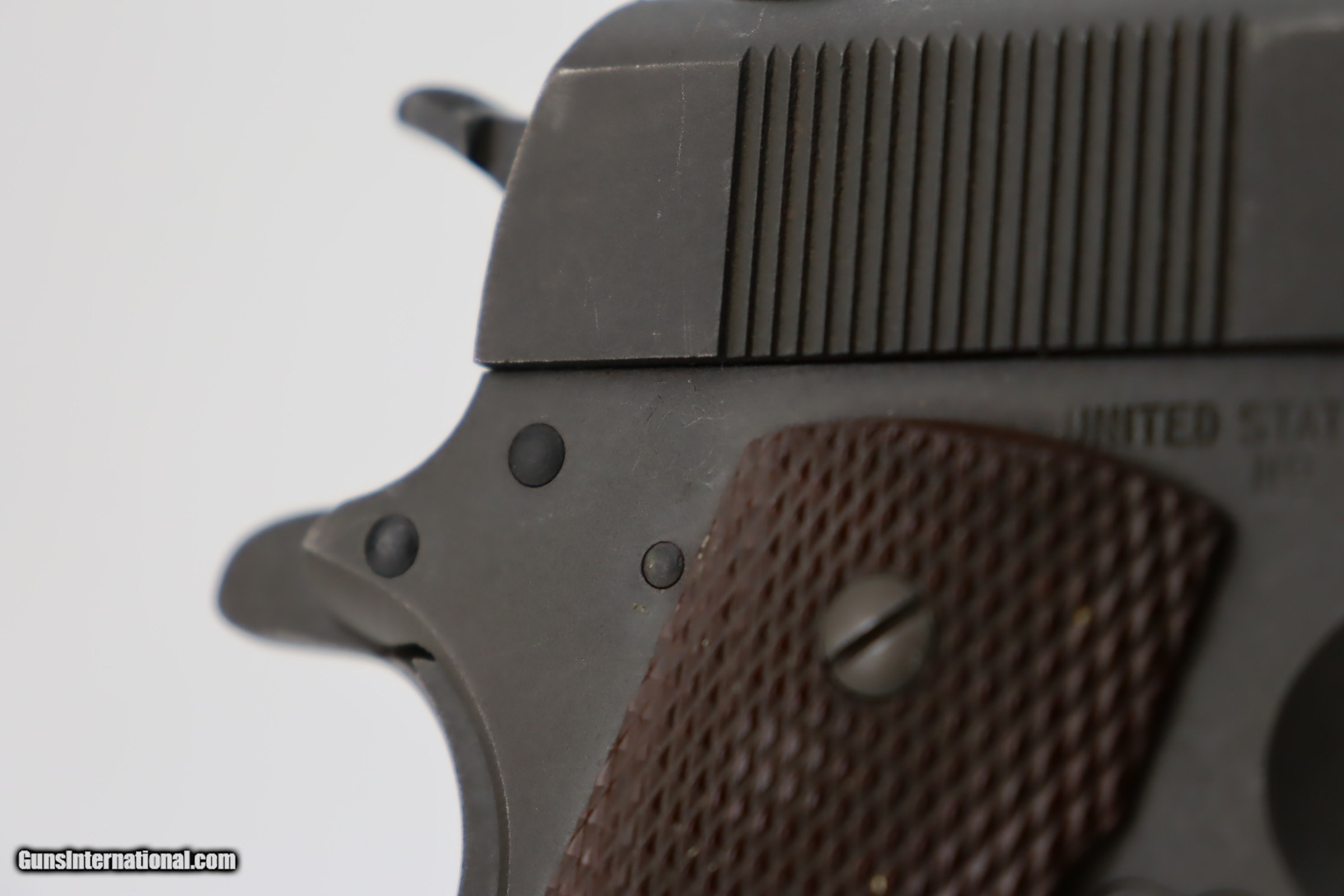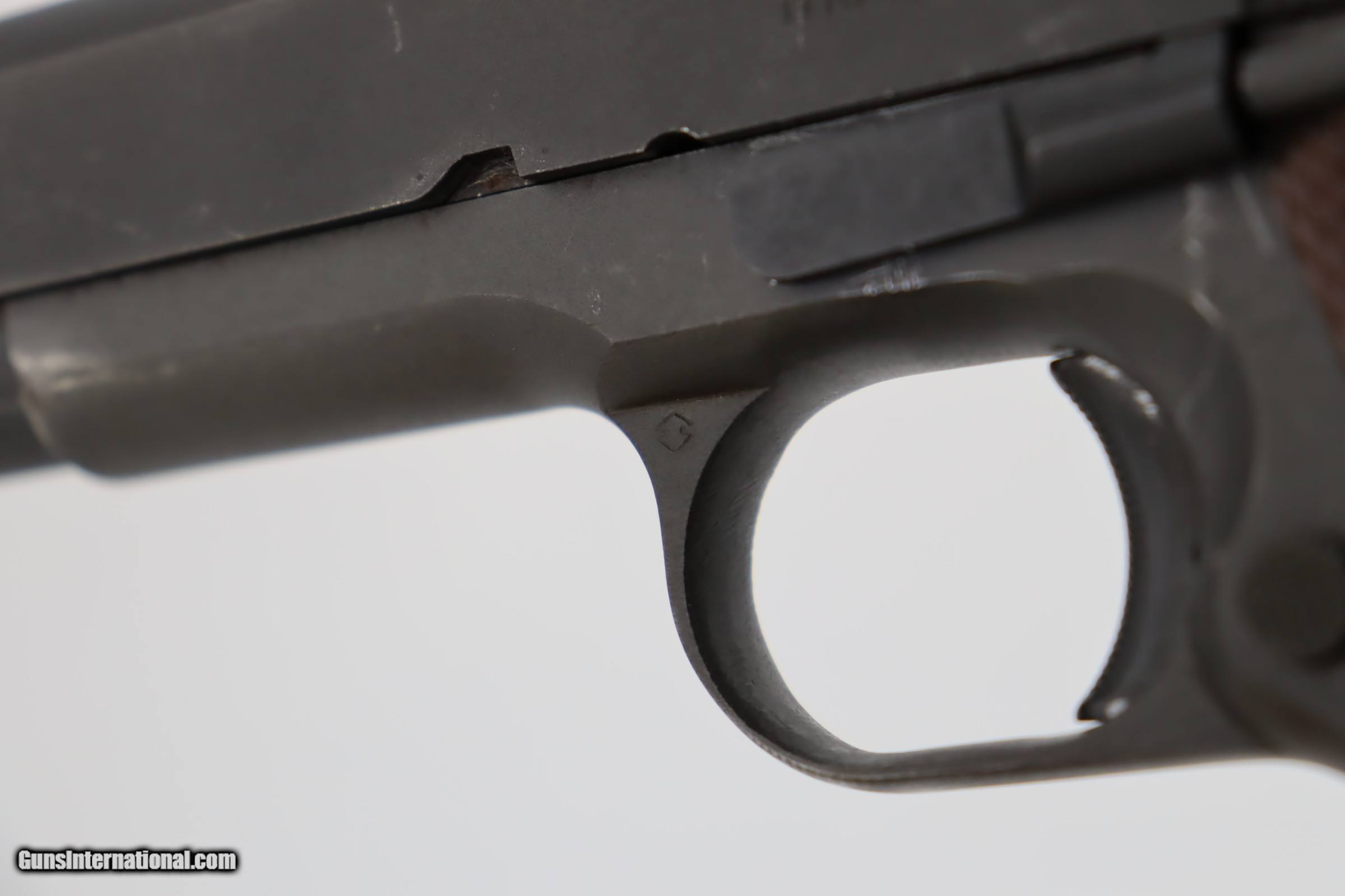 Description: This is an excellent, original Ithaca 1911A1 from early in 1945. It has about 95% of the original finish remaining, with wear on the forward high edges of the frame and around the muzzle, and a spot of wear around the serial number. Proper Flannery barrel with excellent bore. Excellent grips with sharp checkering and no notable defects. Risdon magazine. SOLD Curio/Relic: Yes Handgun Caliber: .45 ACP (.45 Auto) |