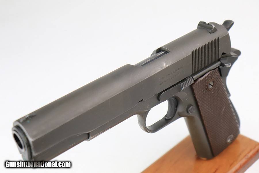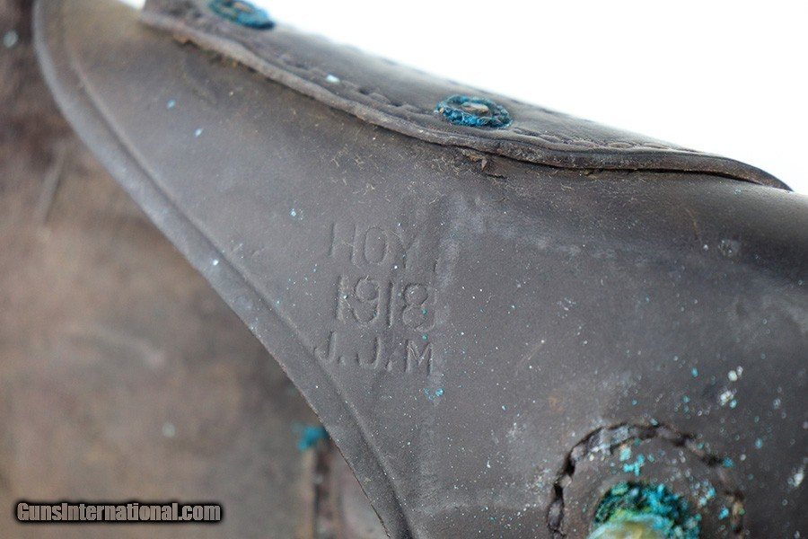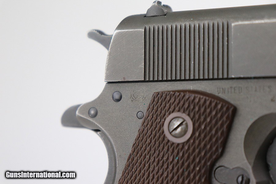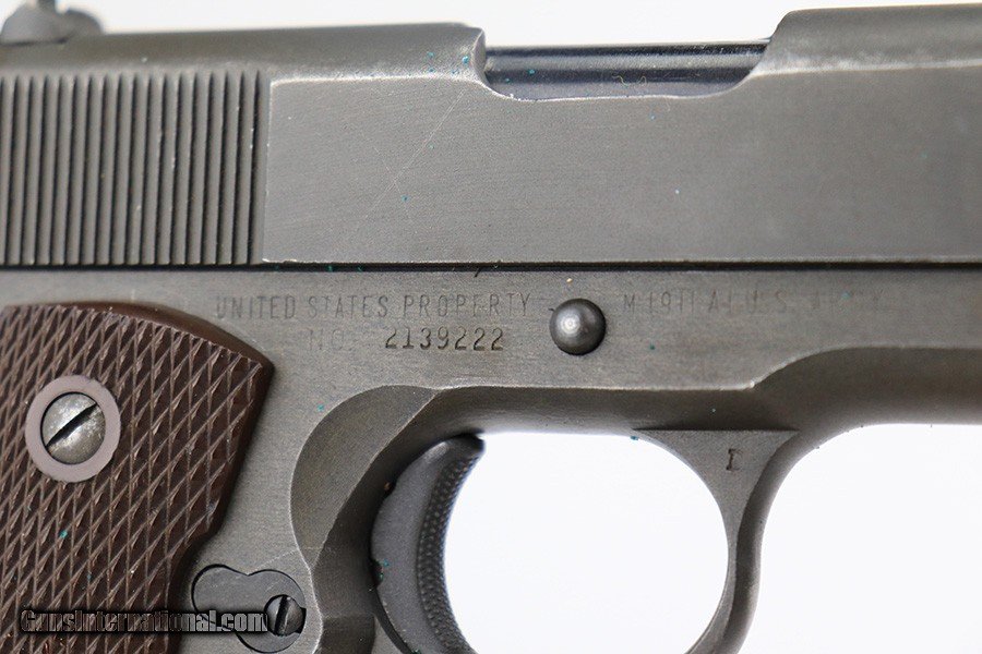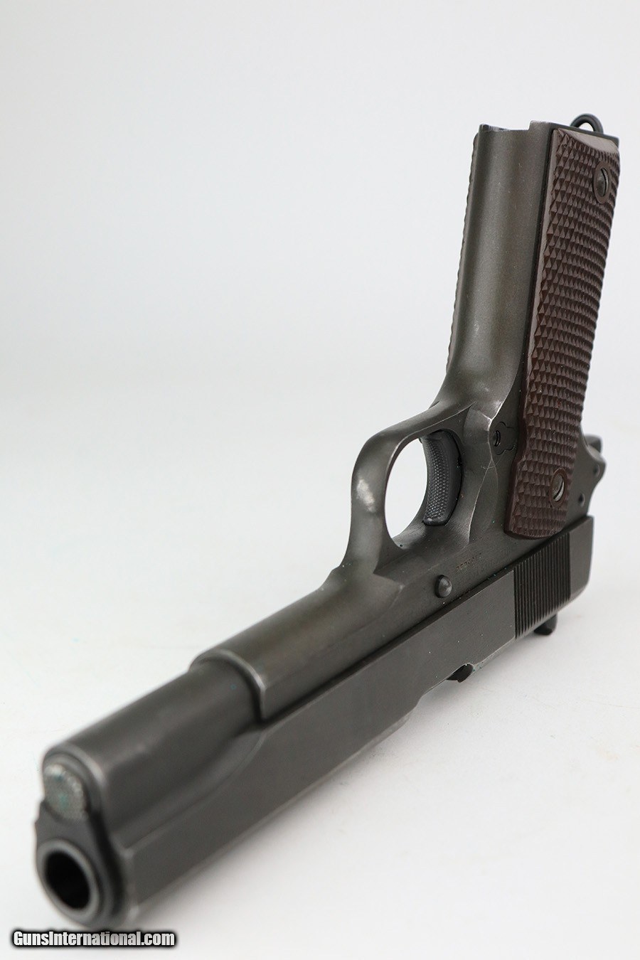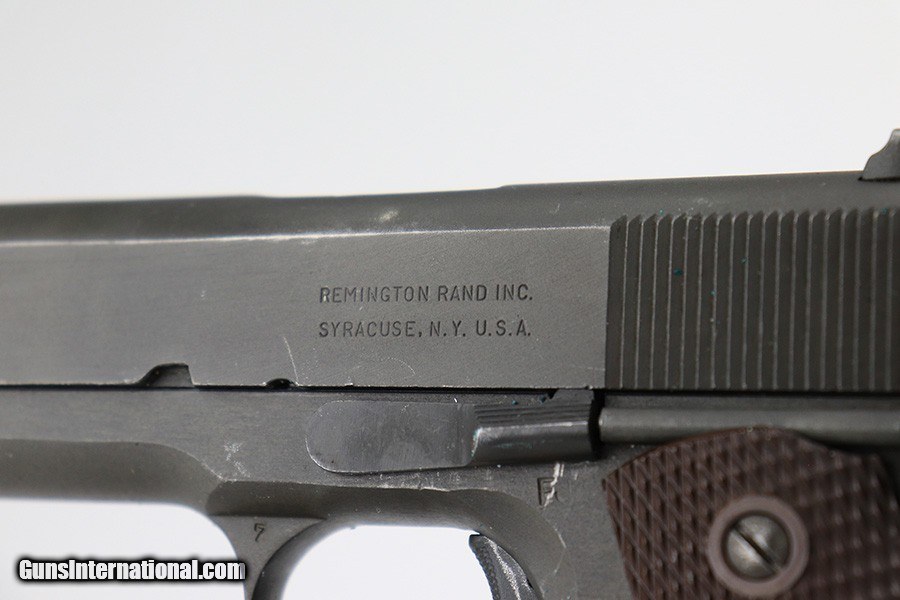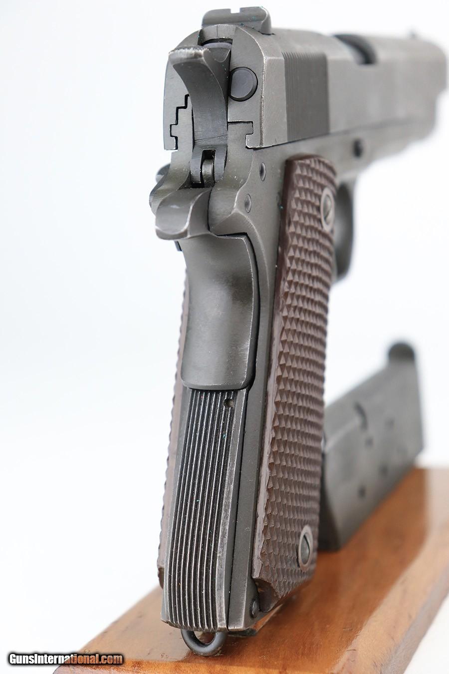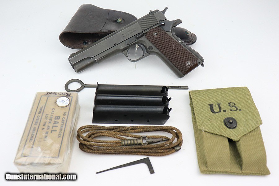 Description: This is a minty example of a Remington Rand Model 1911A1 issued to the US military in 1945. The gun is "United States Property" marked, has the proper "FAJ" inspection marking, and has a cross-cannon military cartouche. Flannery barrel. The gun comes as a rig with a nice 1918-dated Hoyt holster, an original rope lanyard, one box (50 cartridges) of original ammo, a cleaning rod, a 1943-dated canvas ammo pouch, and three period-correct magazines. The holster looks like the stitching was reinforced on the top flap. There is blue-green verdigris on all of the brass fittings. We recommend cleaning this off before putting the gun in the holster, so as to protect the finish. The gun itself is excellent, retaining about 97% of its original parkerized finish. There is very minor wear around the high edges in general and around the muzzle. Hints of thinning on the grip straps. Comes with excellent period original plastic grips, though they are Colt grips. Minty bore. SOLD Curio/Relic: Yes |