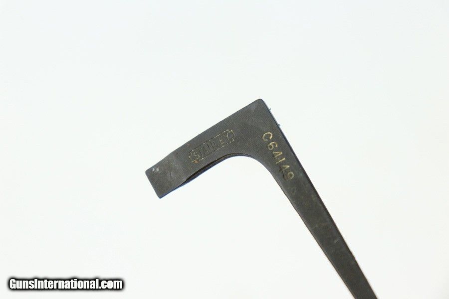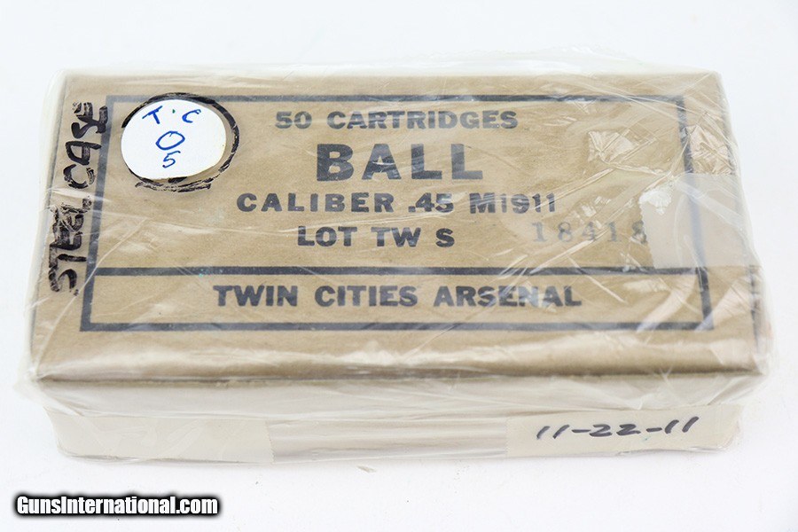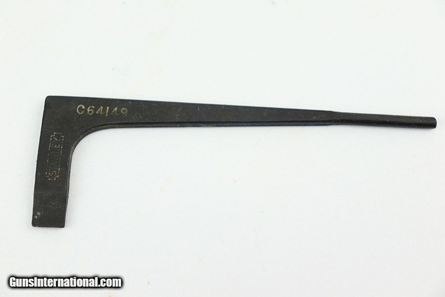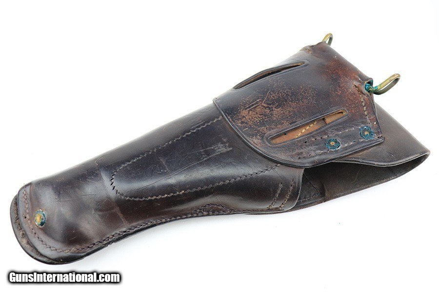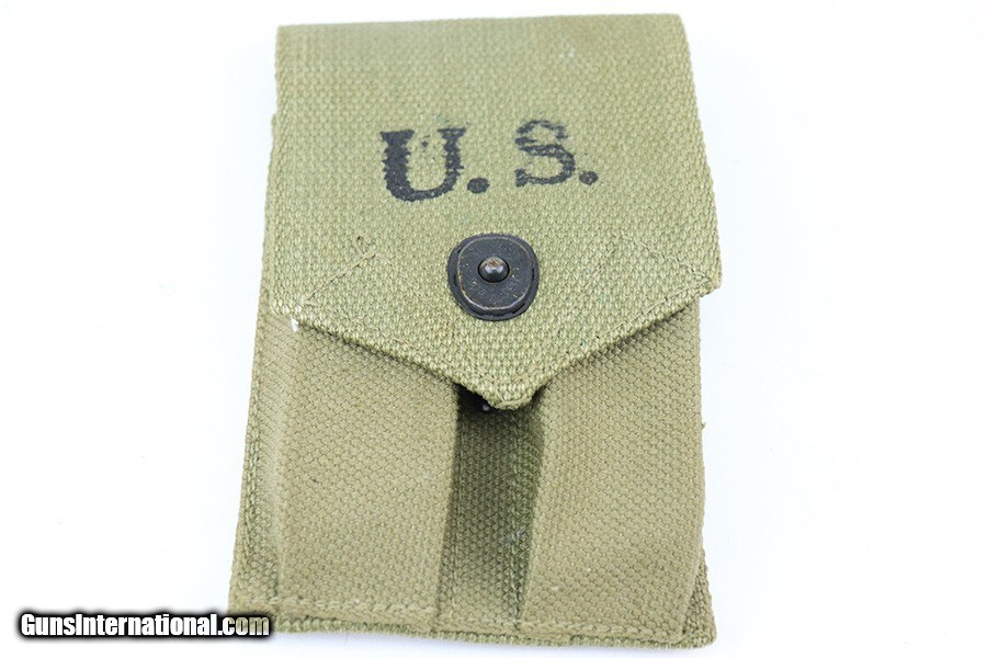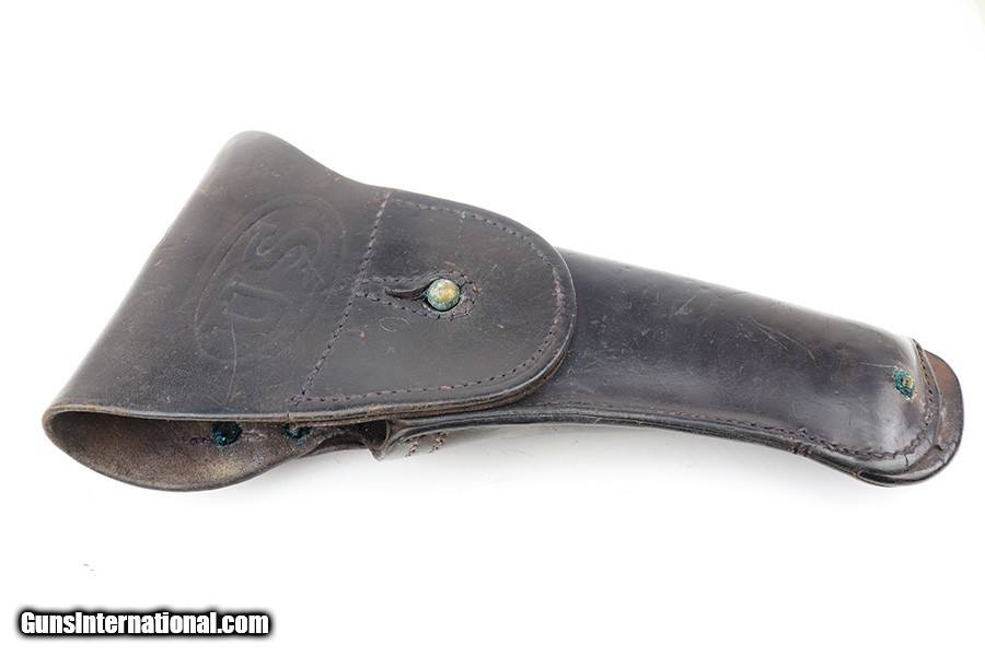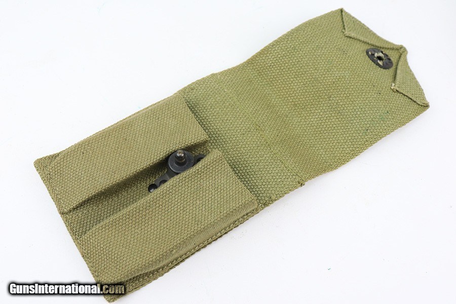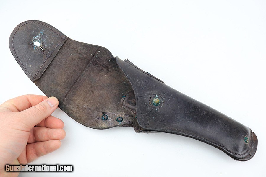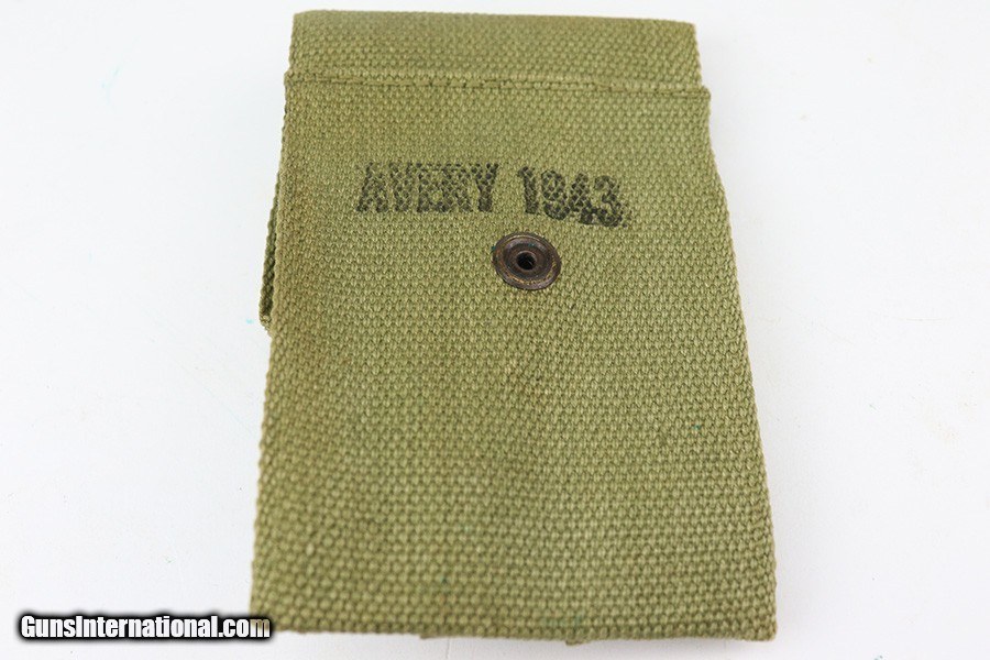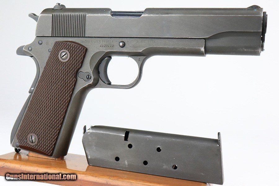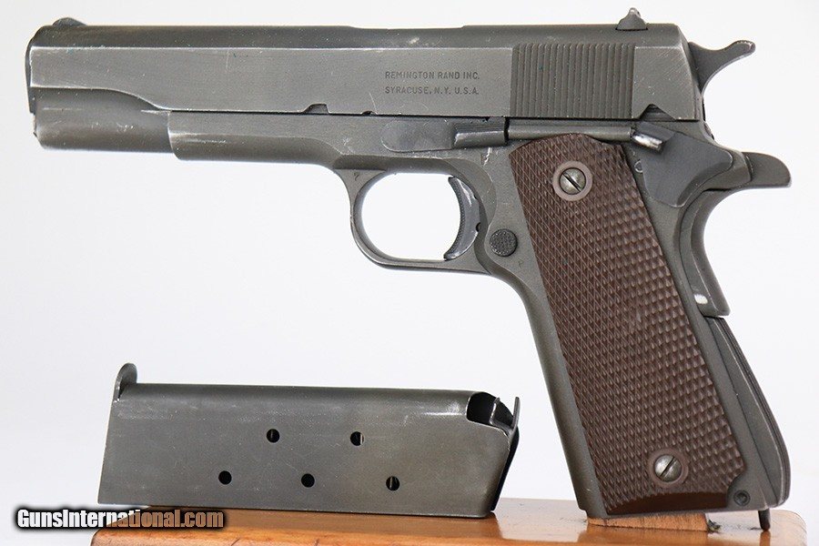 Description: This is a minty example of a Remington Rand Model 1911A1 issued to the US military in 1945. The gun is "United States Property" marked, has the proper "FAJ" inspection marking, and has a cross-cannon military cartouche. Flannery barrel. The gun comes as a rig with a nice 1918-dated Hoyt holster, an original rope lanyard, one box (50 cartridges) of original ammo, a cleaning rod, a 1943-dated canvas ammo pouch, and three period-correct magazines. The holster looks like the stitching was reinforced on the top flap. There is blue-green verdigris on all of the brass fittings. We recommend cleaning this off before putting the gun in the holster, so as to protect the finish. The gun itself is excellent, retaining about 97% of its original parkerized finish. There is very minor wear around the high edges in general and around the muzzle. Hints of thinning on the grip straps. Comes with excellent period original plastic grips, though they are Colt grips. Minty bore. SOLD Curio/Relic: Yes |