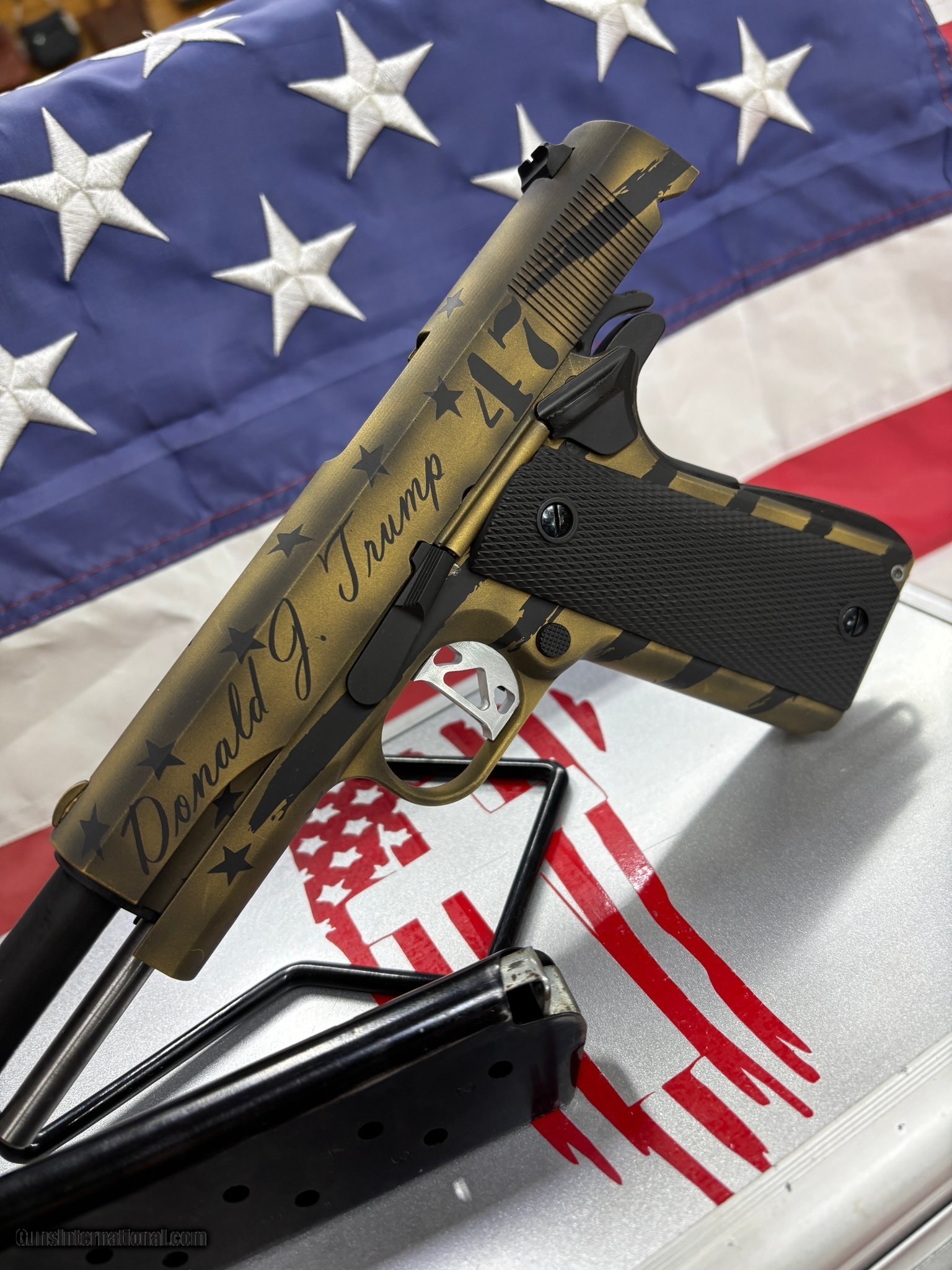 Description: Guns Listing ID: 480961 One of a kind custom cerakoted MAGA 45/47. Burnt bronze distressed flag, hard case, one magazine. Perfect addition to any patriots collection. SOLD Manufacturer: FOSTER IND. Model: 1911 Caliber Info: .45 ACP Condition: Used - Non-Certified Barrels: 5 BARREL Finish: cerakote |