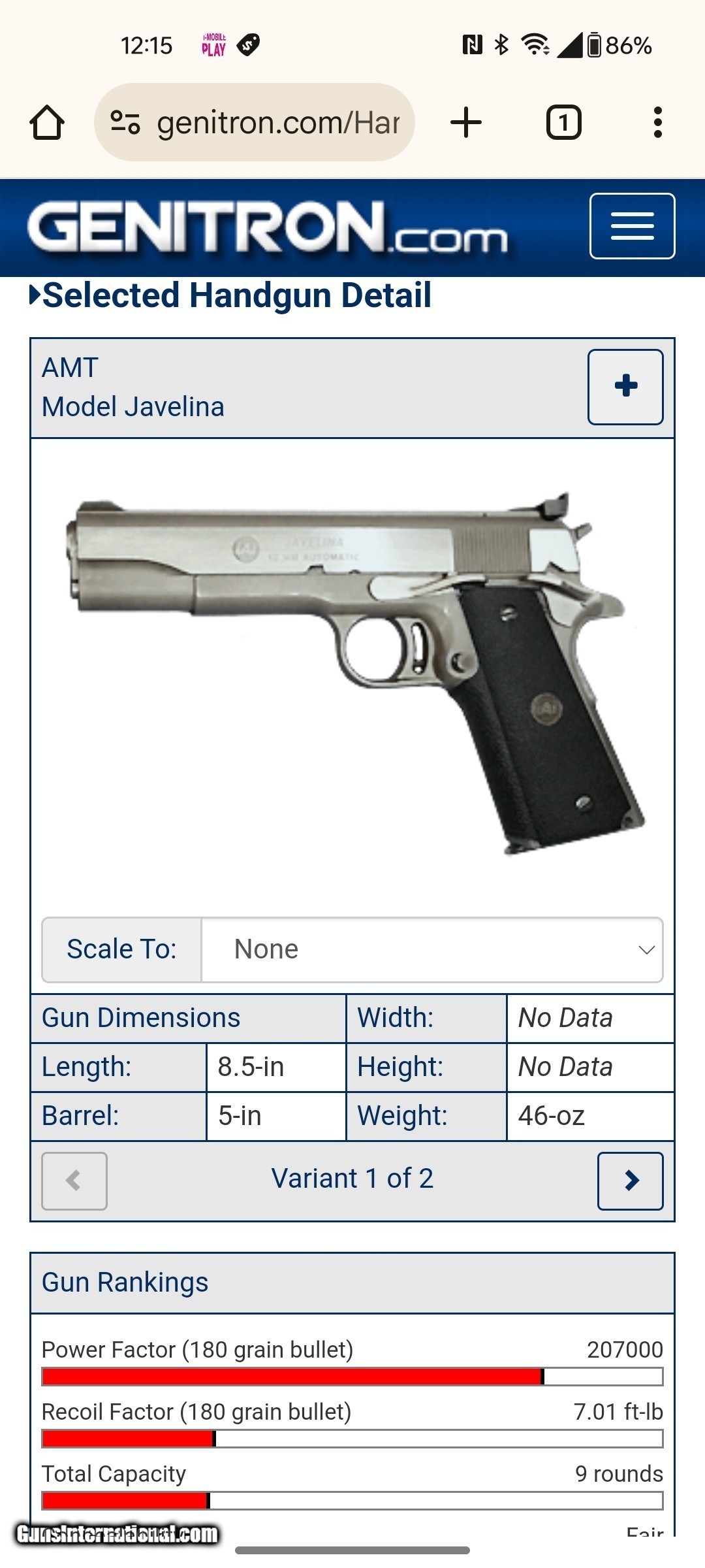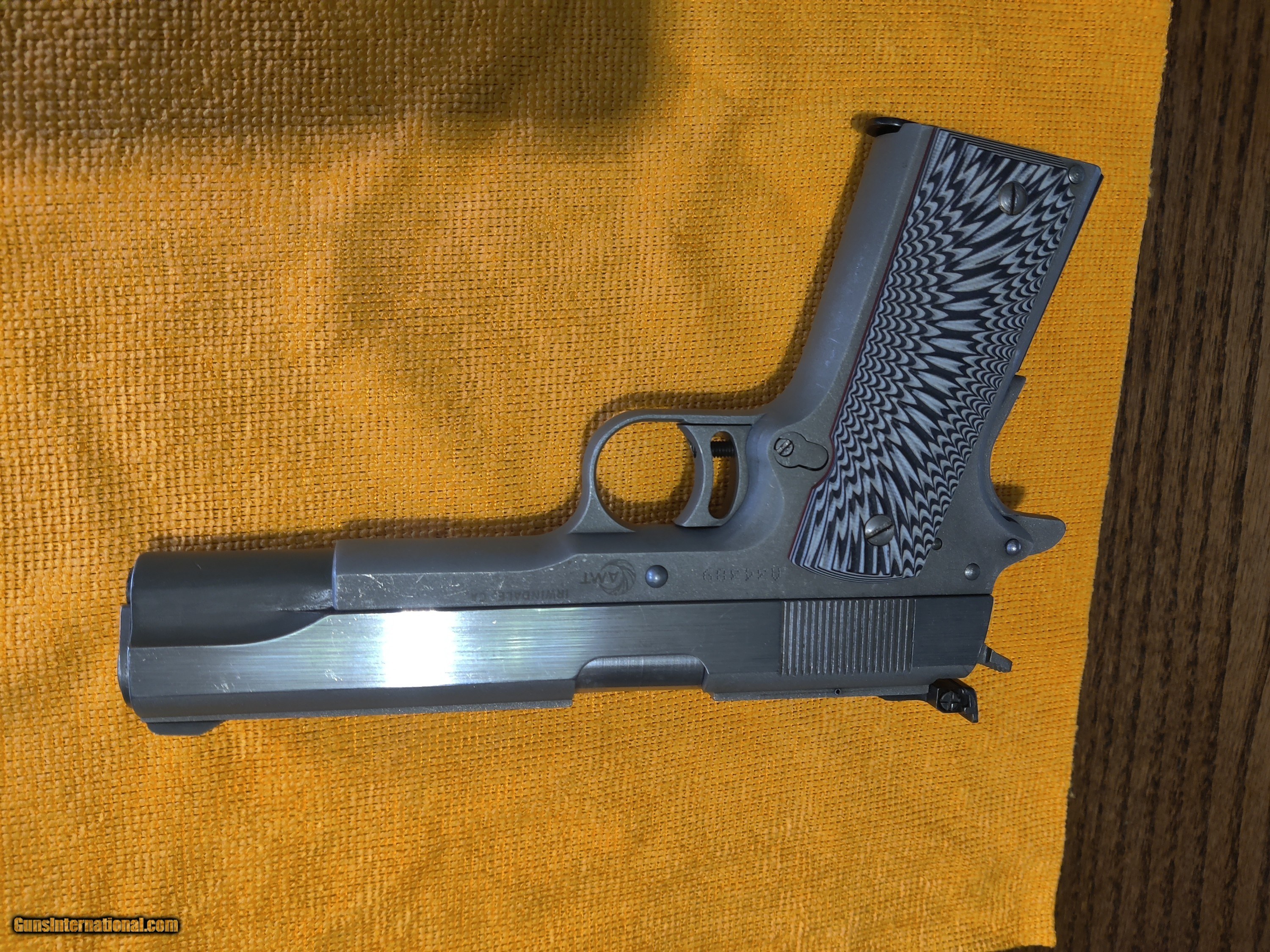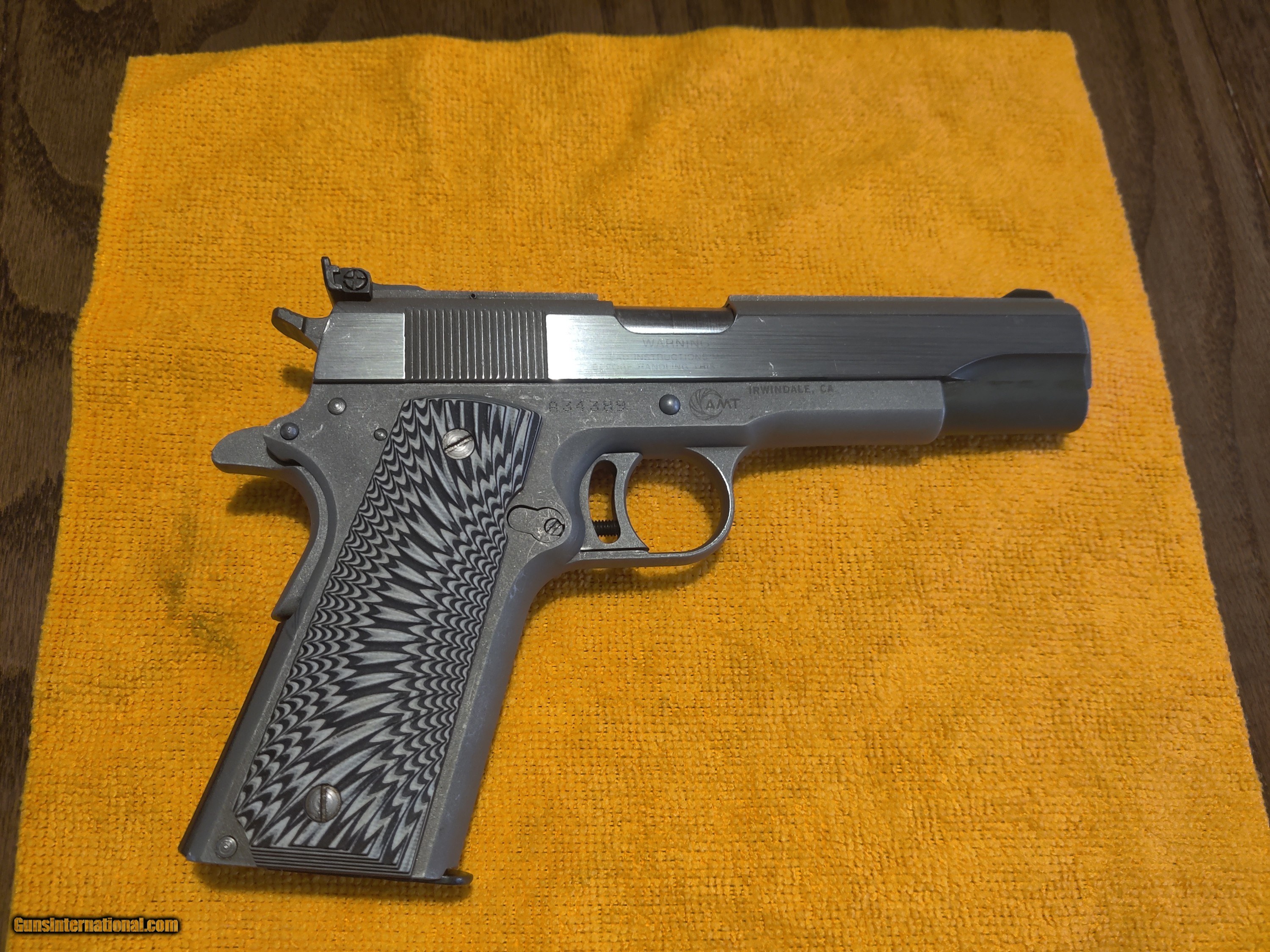 Description: Made one year only 1996 AMT javelina excellent condition fires flawlessly perfect boar no scratches or dents custom grips 10 mm auto free shipping Make an offer negotiable beautiful stainless steel as far as I can tell this is the only one for sale anywhere extremely rare also fires 40 caliber every available option is on this pistol extended slide release extended safety extended dovetail safety adjustable trigger SOLD Handgun Caliber: 10mm Auto Manufacturer: Amt Model: Javelina Condition: Excellent Metal Condition: Excellent Bore Condition: Excellent Triggers: Adjustable |