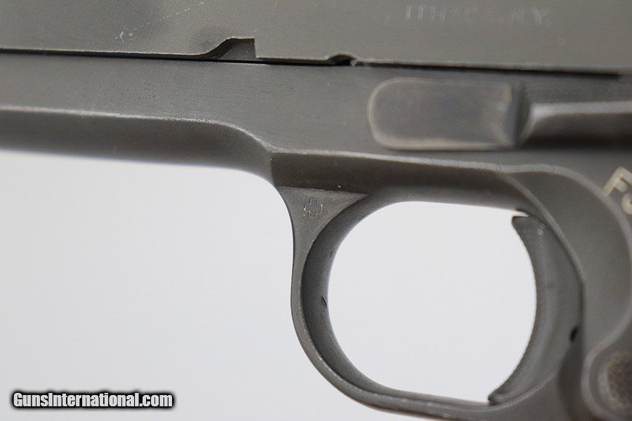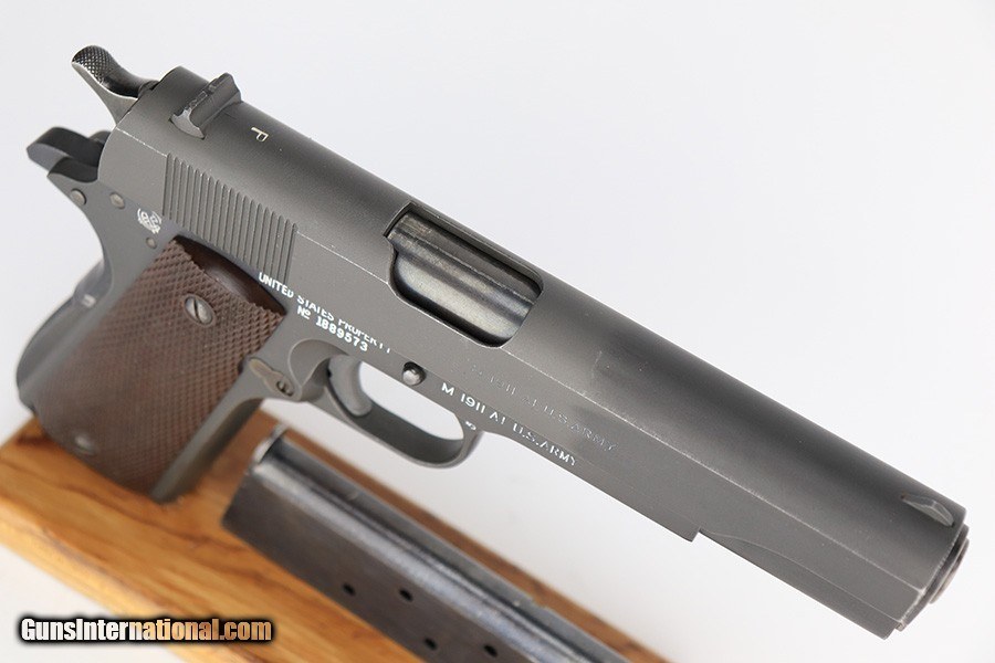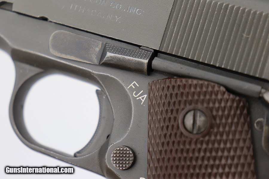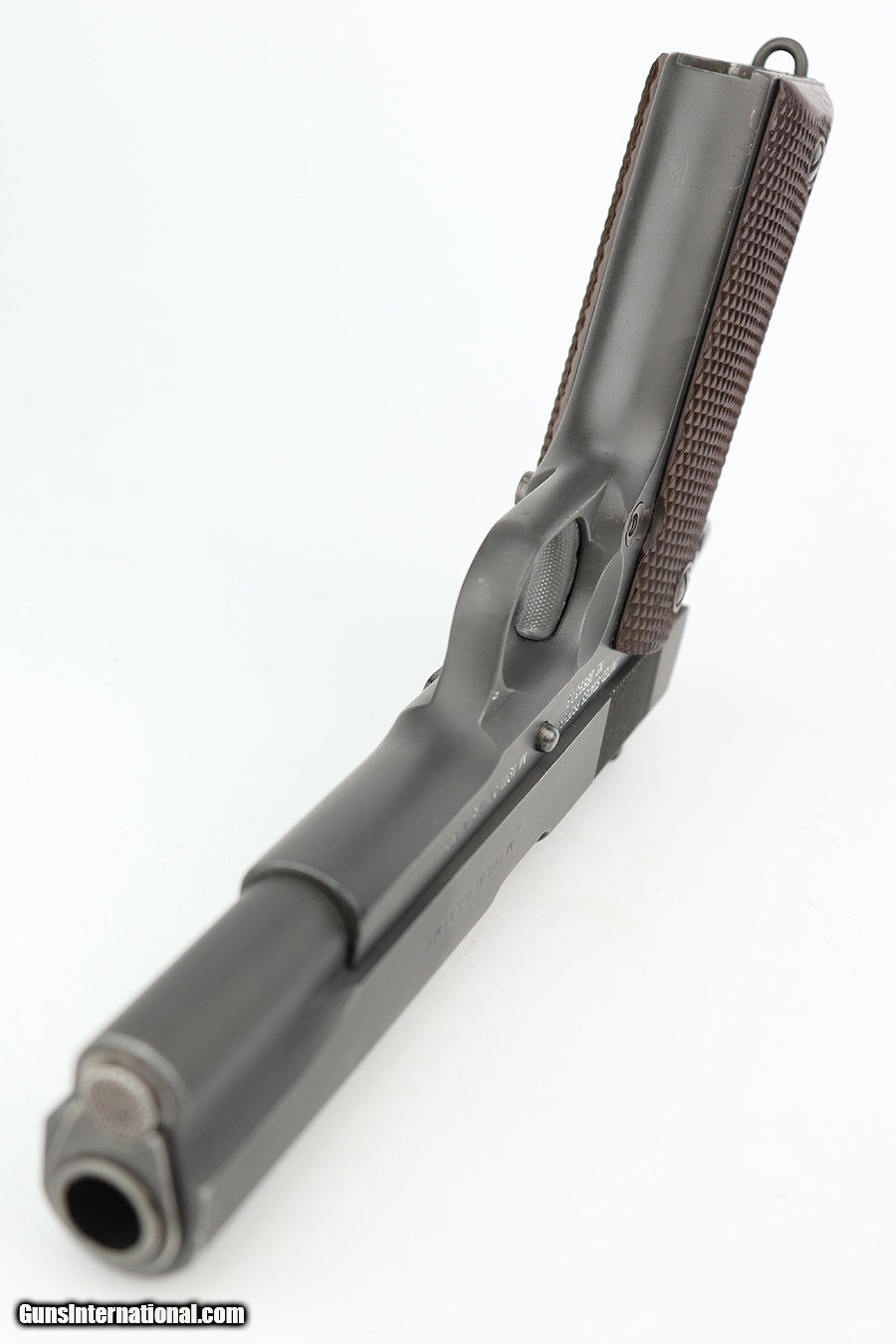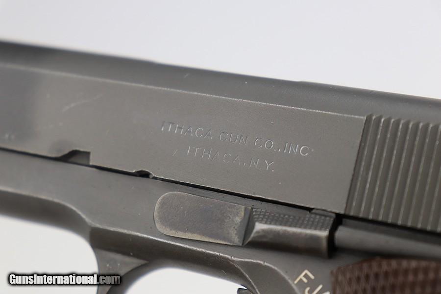Description: This is a scarce Ithaca 1911A1 variation with "M1911A1 U.S. ARMY" replacement slide in proper serial range. The pistol is in excellent condition but was reparkerized. Proper HS barrel with strong, shiny bore. Nice grips with only minor handling wear/smoothing. Risdon magazine. SOLD Curio/Relic: Yes Handgun Caliber: .45 ACP (.45 Auto) |