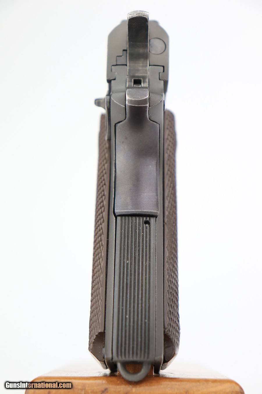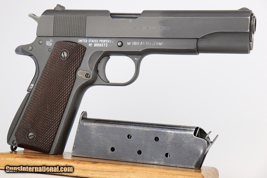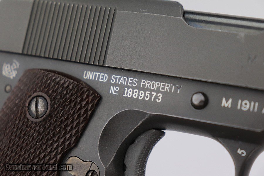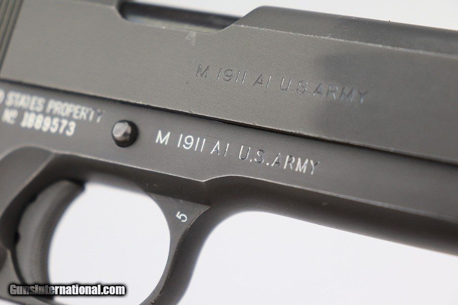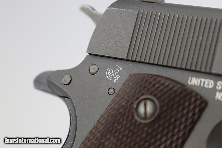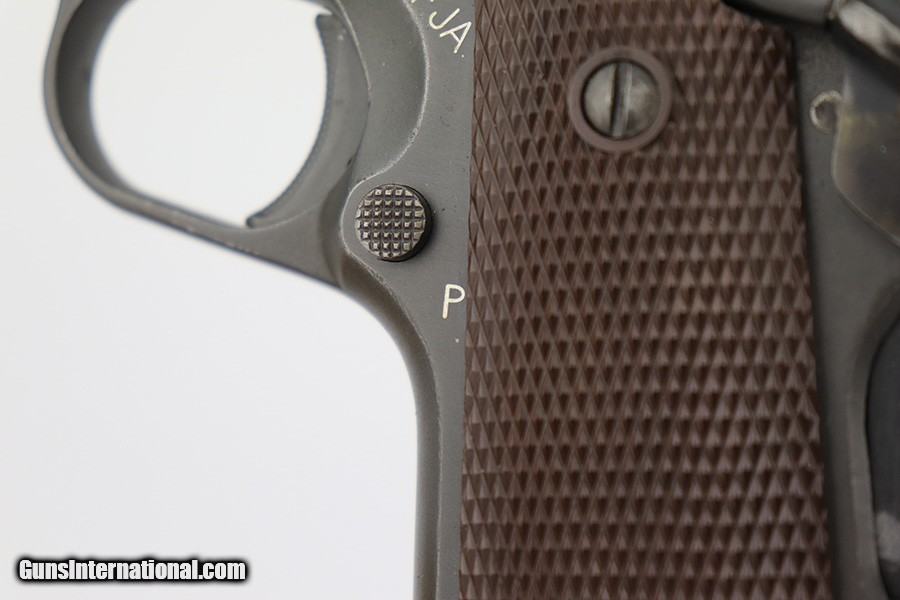 Description: This is a scarce Ithaca 1911A1 variation with "M1911A1 U.S. ARMY" replacement slide in proper serial range. The pistol is in excellent condition but was reparkerized. Proper HS barrel with strong, shiny bore. Nice grips with only minor handling wear/smoothing. Risdon magazine. SOLD Curio/Relic: Yes Handgun Caliber: .45 ACP (.45 Auto) |