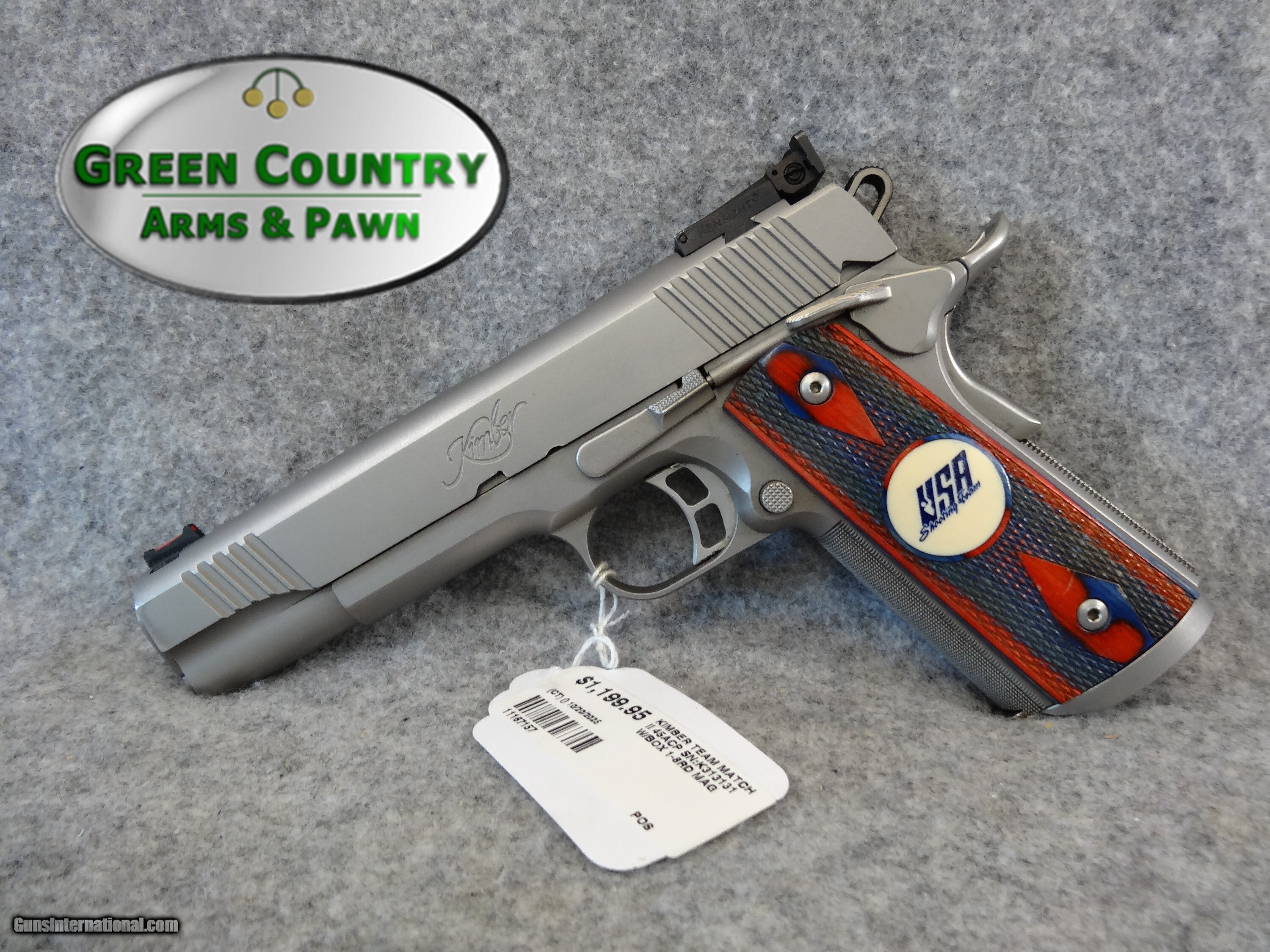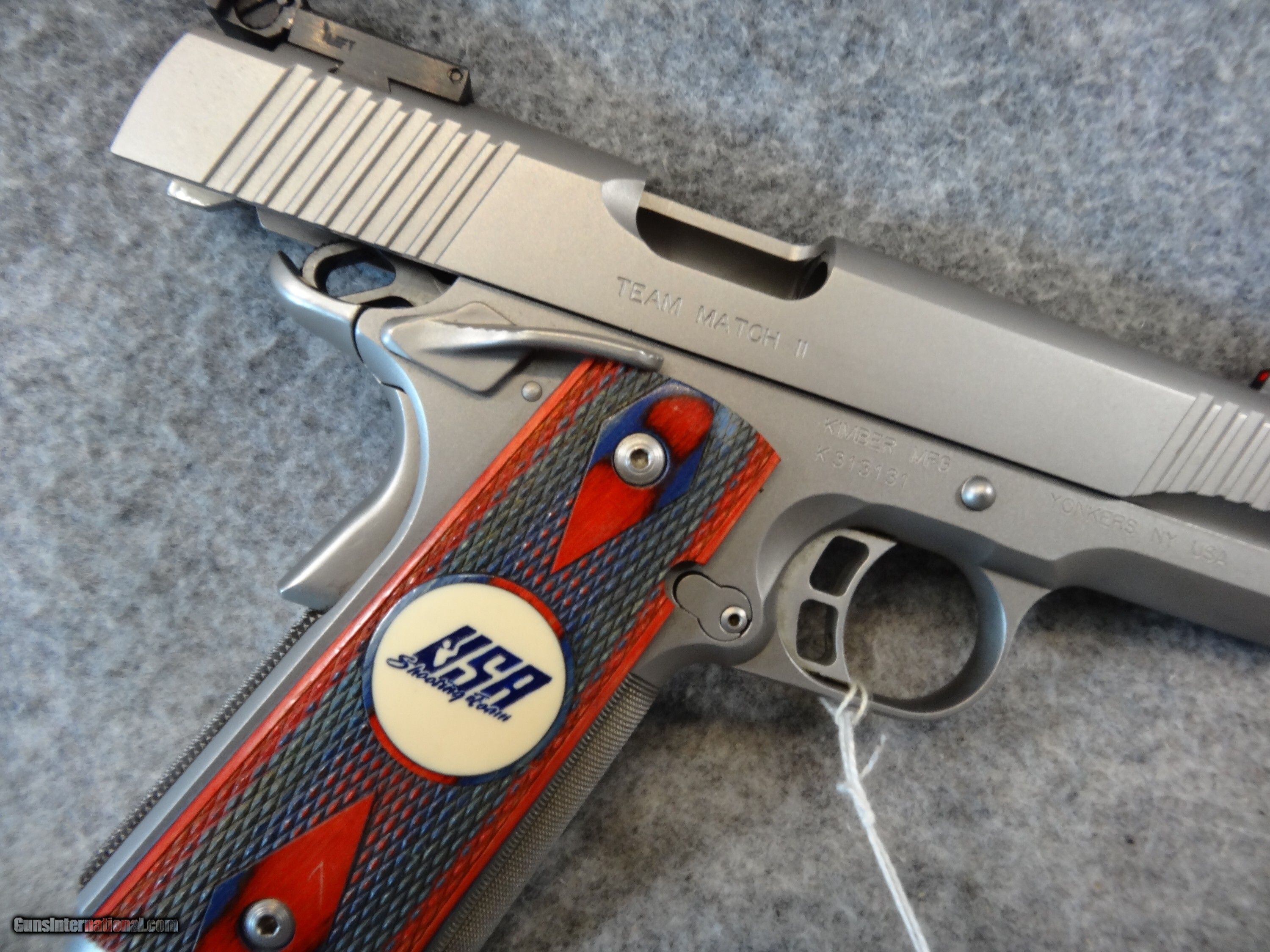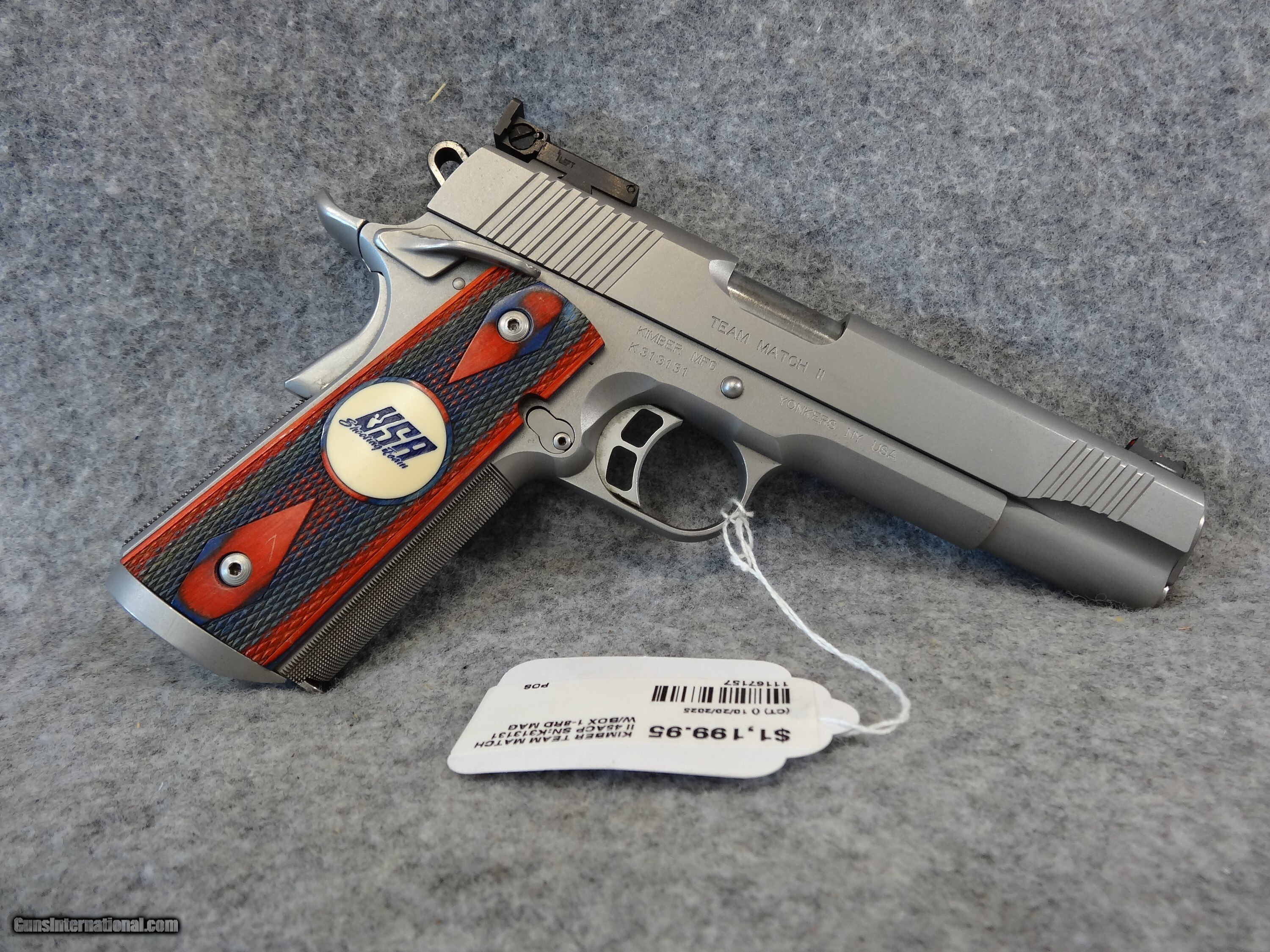 Description: Inventory#: 11167157 Make: KIMBER Model: TEAM MATCH II Condition: USED This 1911 is designed for accurate competition shooting and self defense. The match grade barrel provides tight tolerances and consistent accuracy. The grip features a magwell for intuitive and faster reloads. Features skeletonized trigger and hammer. Has an ambidextrous safety. Boasts wood-checkered "USA Shooting Team" grips. This government sized, 8rd 45acp pistol provides reliability across all 45 Auto loads. Handgun Caliber: .45 ACP (.45 Auto) Price: $1,199.95 Shipping: $35.00 Contact Seller |