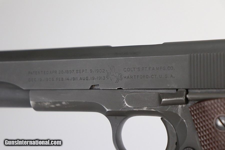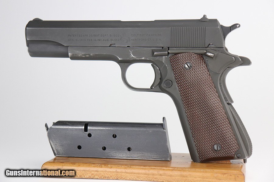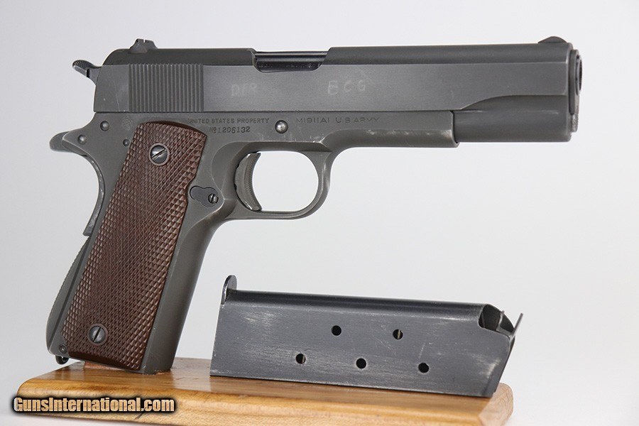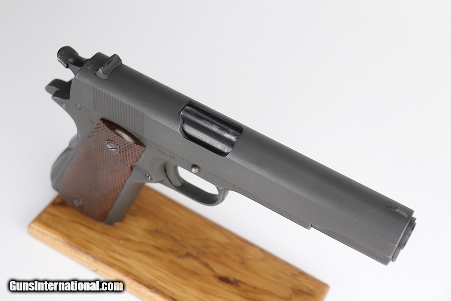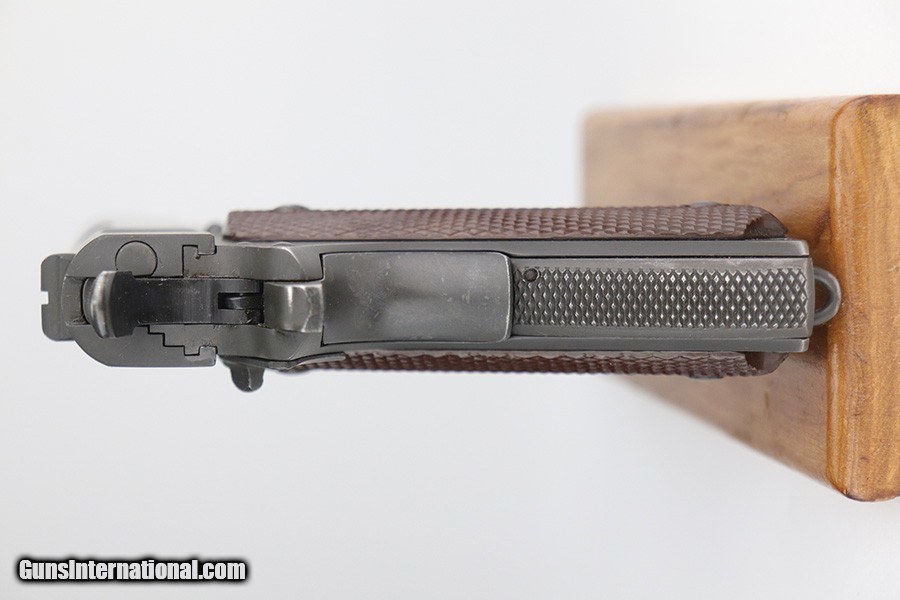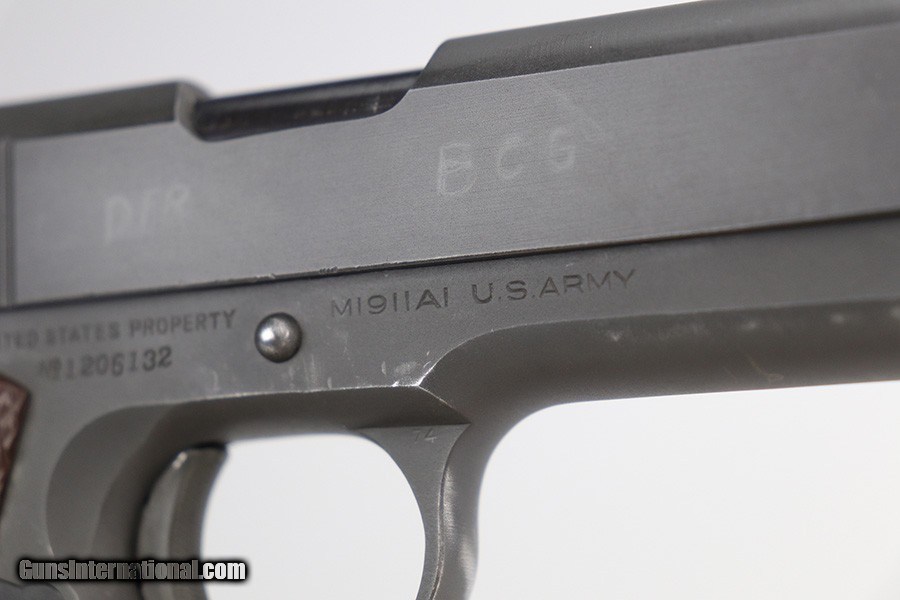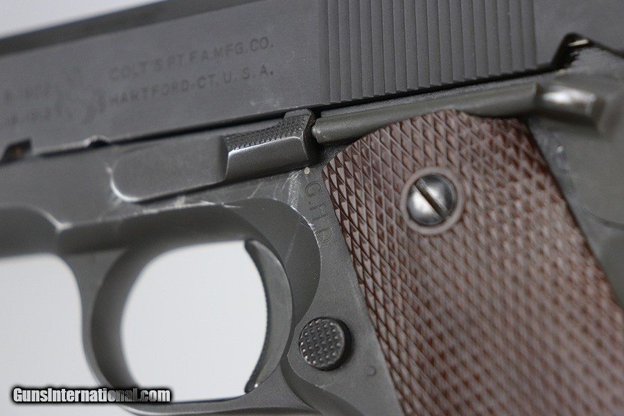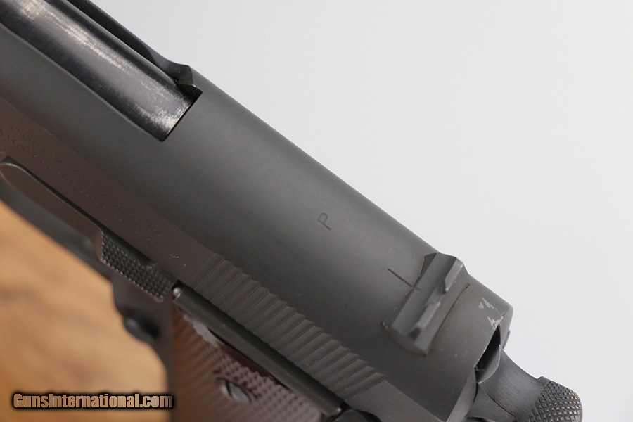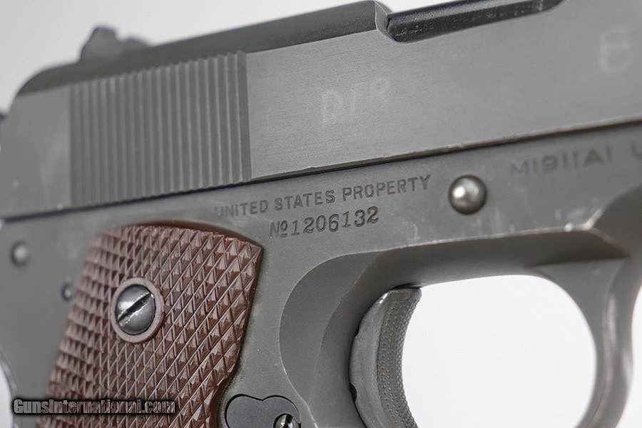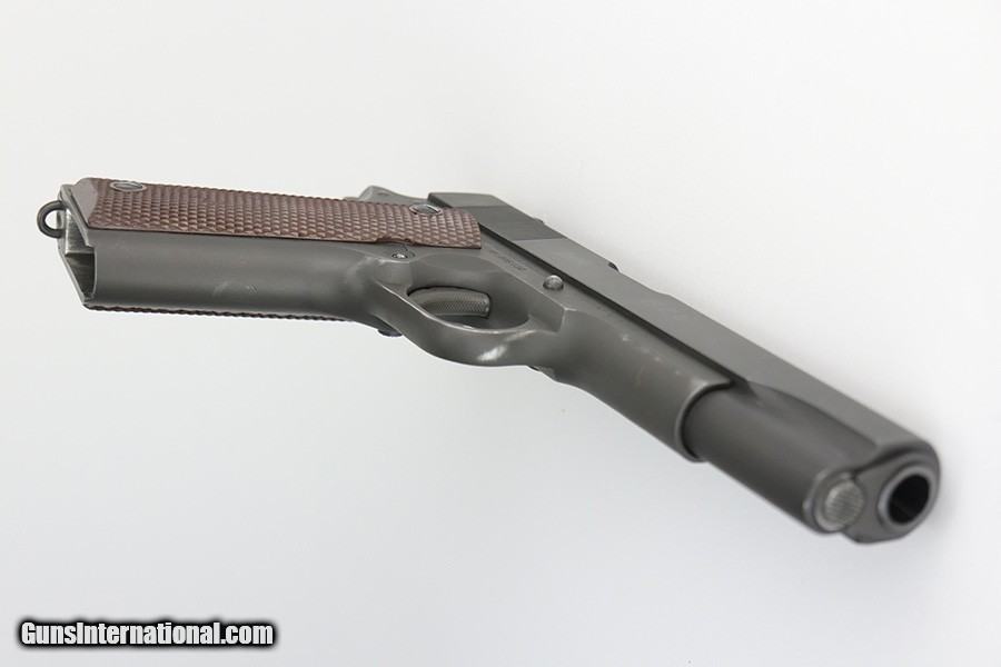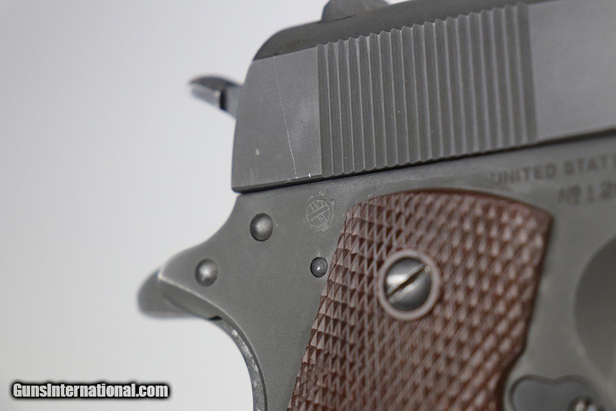 Description: This is a minty example of a Colt Model 1911A1 issued to the US military in 1943. It is "United States Property" marked, has the proper "GHD" inspector initials, and has the correct cross-canon military cartouche. It also has a proper Colt barrel. The gun has retained about 97% of its parkerized finish. Unfortunately, someone scratched "DFR" and "BCG" initials lightly into the right side of the slide. There are a few small spots of wear on the very front edge of the frame and some handling marks around the takedown lever. There is some spotty wear on the grip safety and one or two small handling marks on the front strap. Comes with excellent plastic grips and a period-correct unmagazine. The bore is mint. SOLD Curio/Relic: Yes Handgun Caliber: .45 ACP (.45 Auto) |