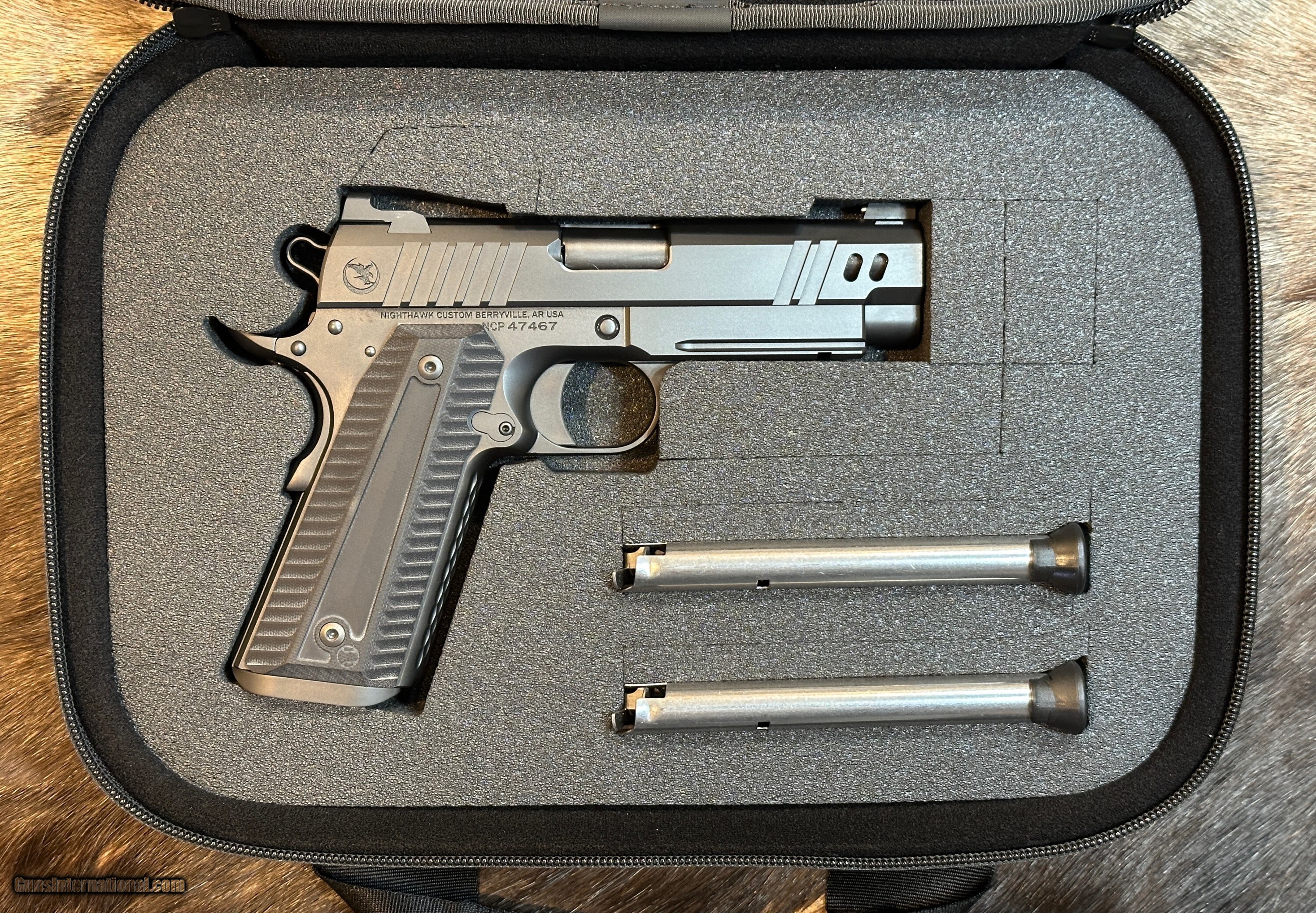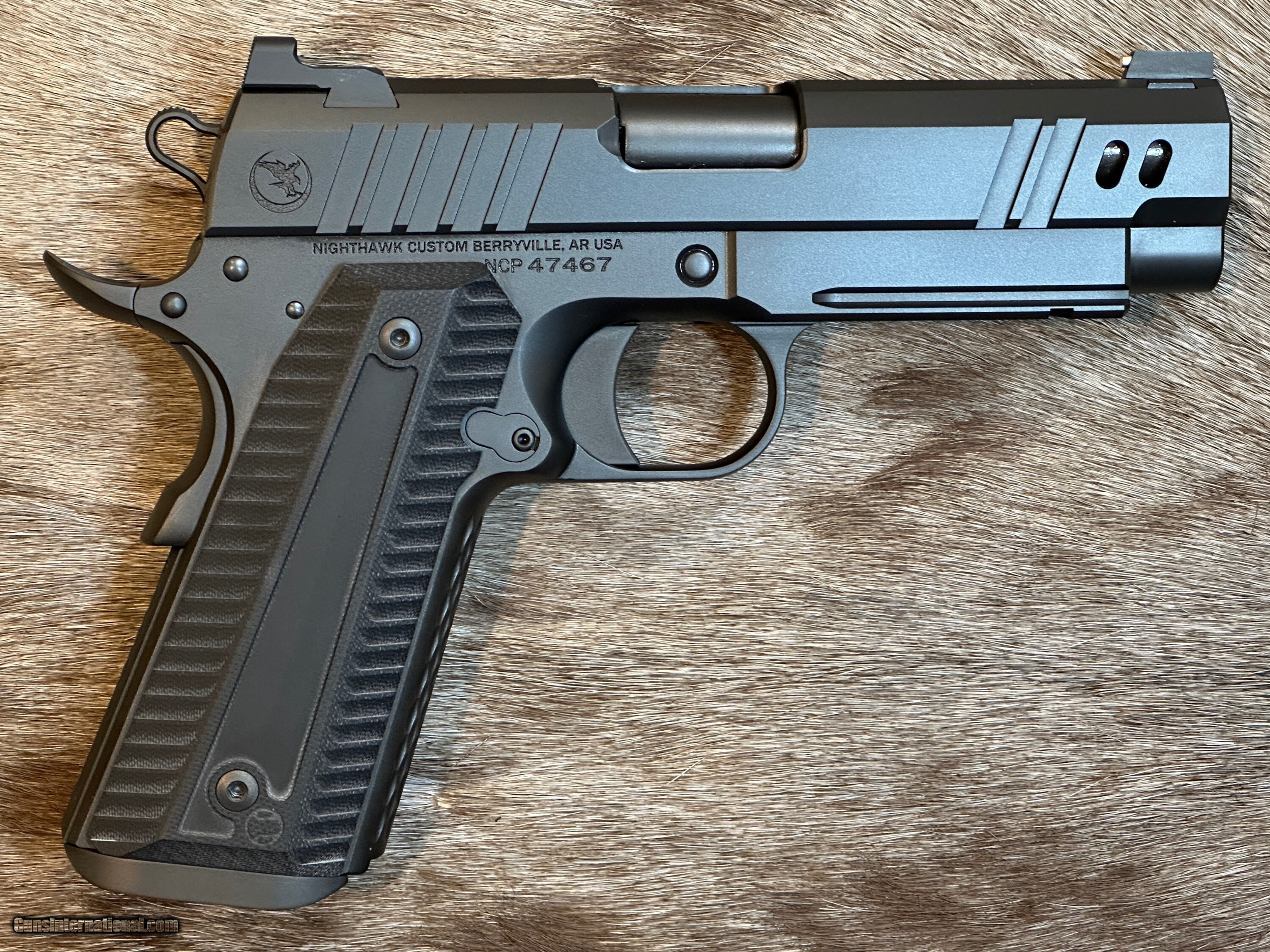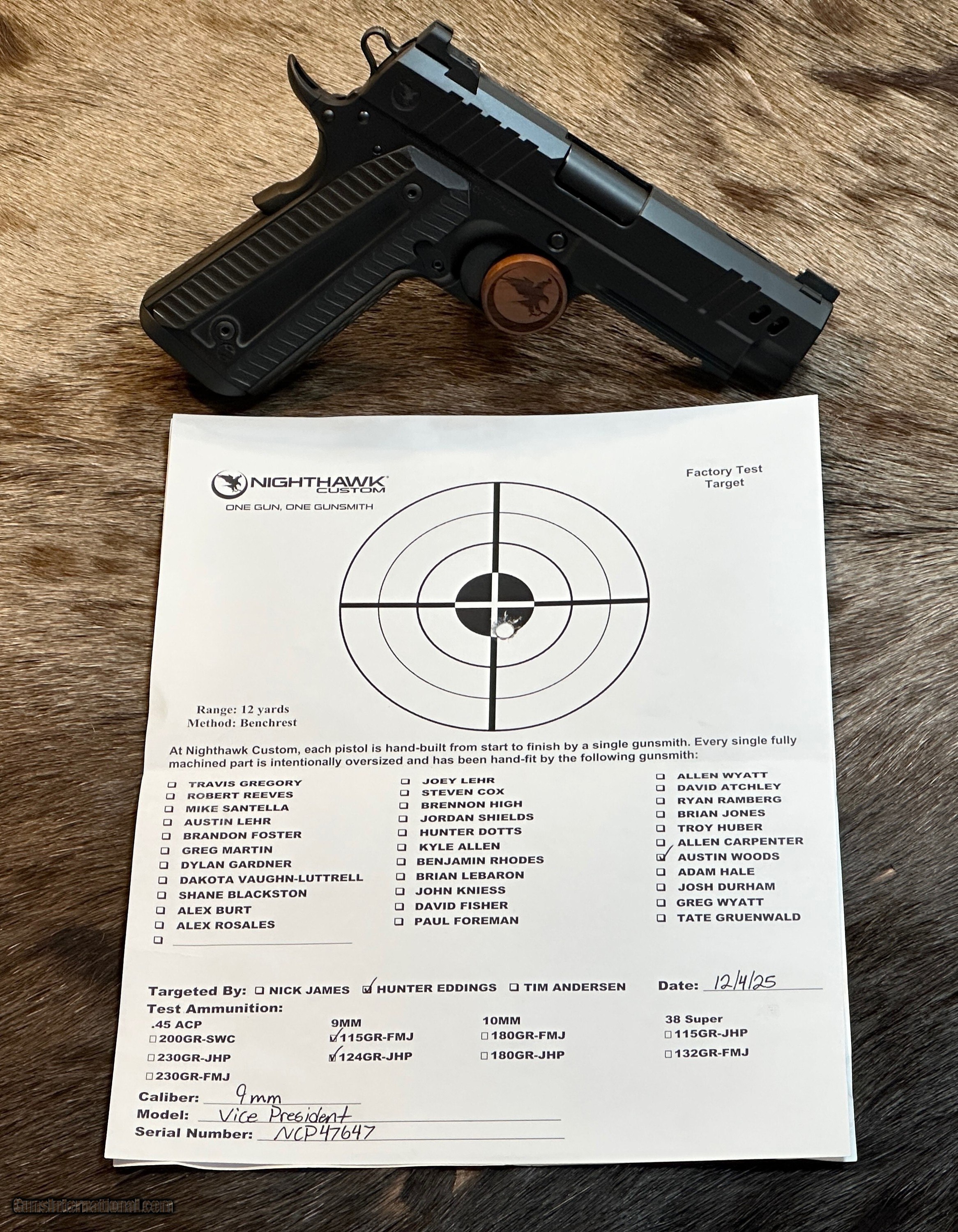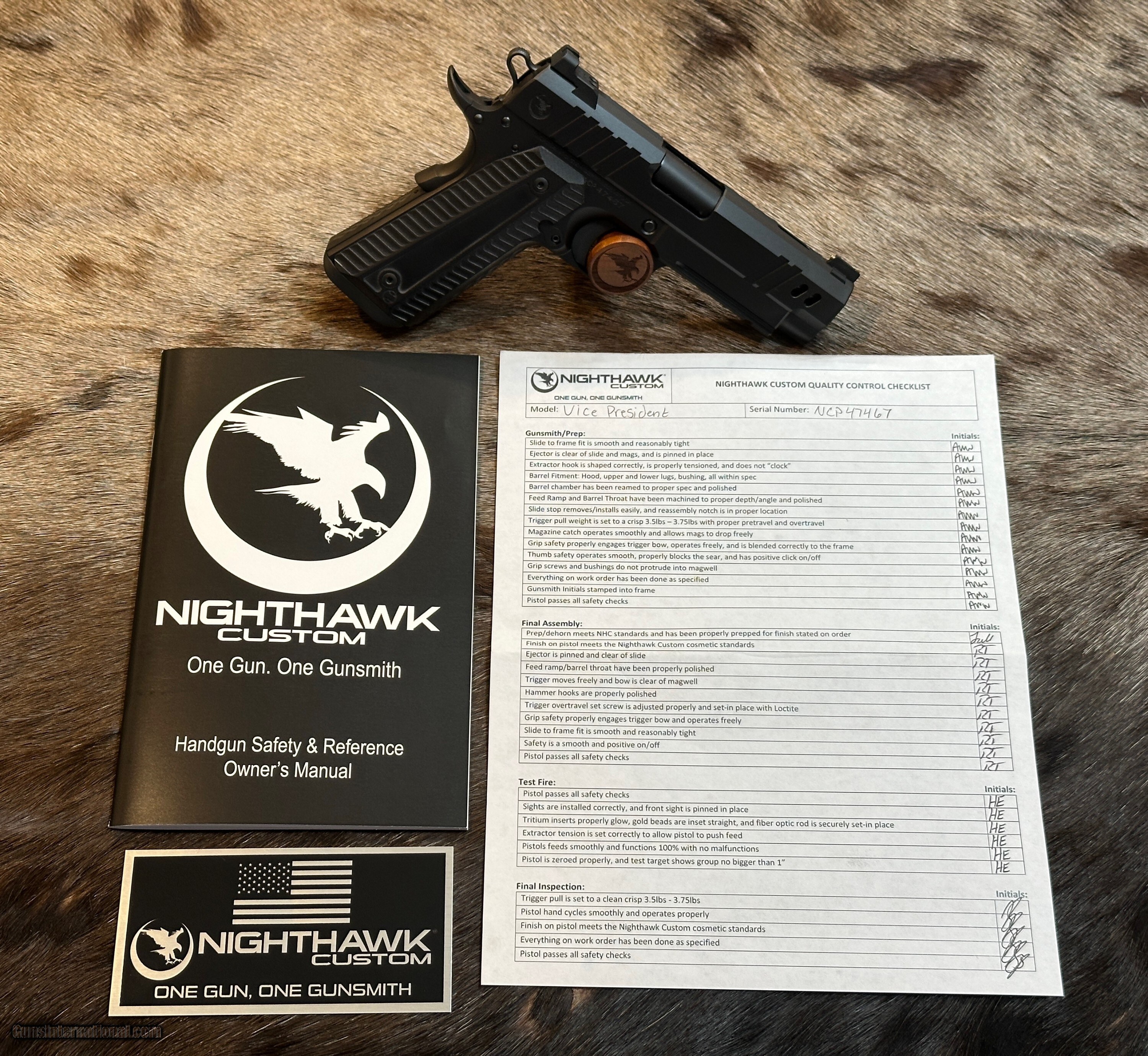 Description: NEW NIGHTHAWK CUSTOM VICE PRESIDENT COMMANDER 1911 9MM PISTOL W/ UPGRADES - LAYAWAY AVAILABLE One of the standout features of the Vice President is its heavy angle cuts in the slide, which not only enhance the pistol's aesthetics but also aid in faster cycling, catering to the needs of competitive shooters who demand rapid and precise performance. Adding to its visual appeal, the Vice President boasts windows in the slide that showcase this pistol's crowned bull barrel, a distinctive touch that reflects the precision engineering and attention to detail that went into its design. For rapid target acquisition, the Vice President features a Heinie Ledge rear sight paired with a 14k gold bead front sight, providing shooters with a clear and precise sight picture. Enhancing both grip and aesthetics, the Vice President is equipped with custom Railscales Ascend grips, which offer excellent feel in the hand and a bold, aggressive look. Finished with a durable DLC finish, the Vice President not only exudes toughness but also boasts a sleek and sophisticated appearance that is sure to turn heads on the range or in competition. The Vice President combines high-performance features with exceptional craftsmanship, making it a standout choice for shooters who demand the best in both form and function. With its blend of precision engineering, premium materials, and attention to detail, the Vice President sets a new standard of excellence in the Boardroom Series of 1911 pistols. FEATURES OF THIS GREAT CUSTOM 1911 INCLUDE: