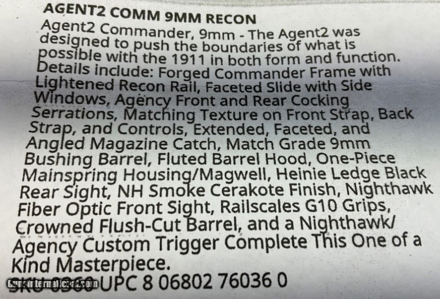 Description: NIGHTHAWK CUSTOM Agency Arms AGENT 2 COMMANDER 1911 9MM Threaded NHC IOS