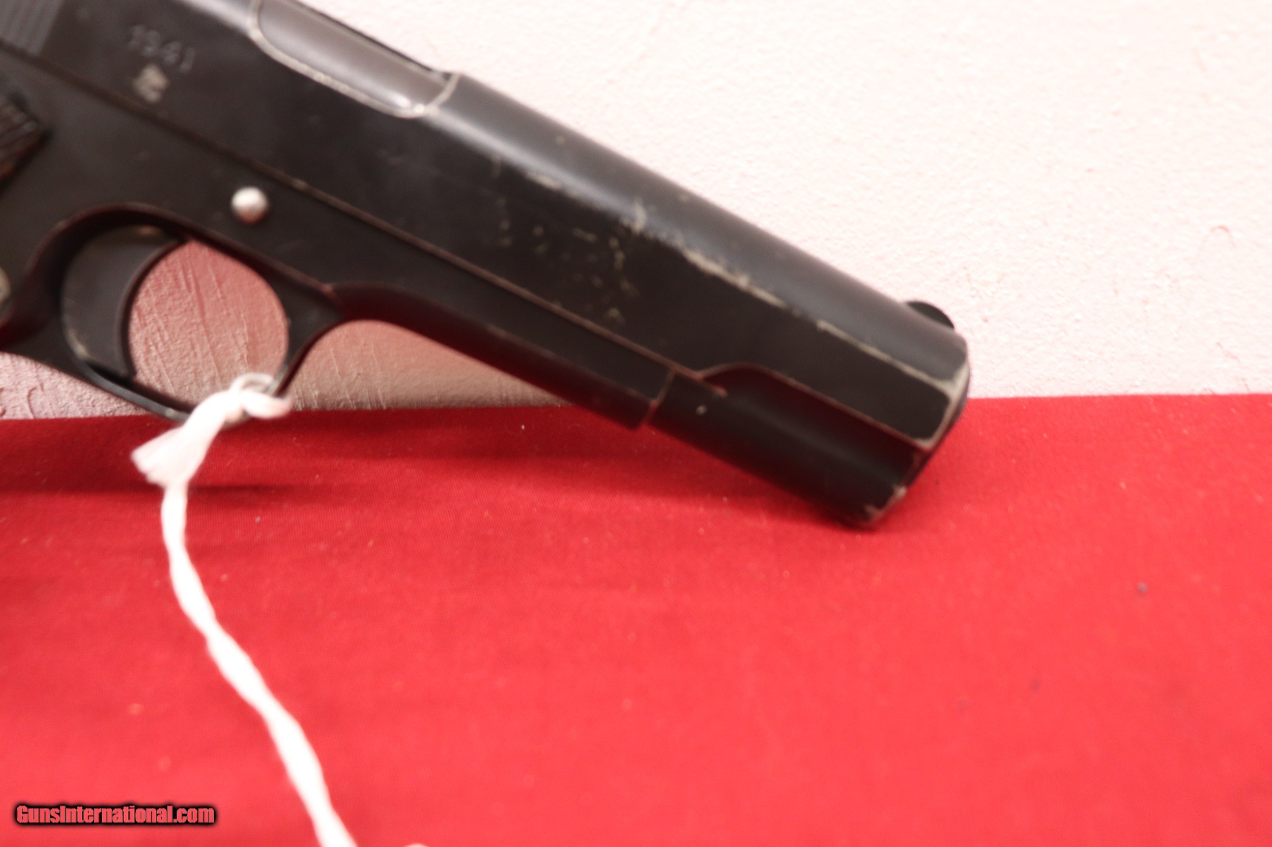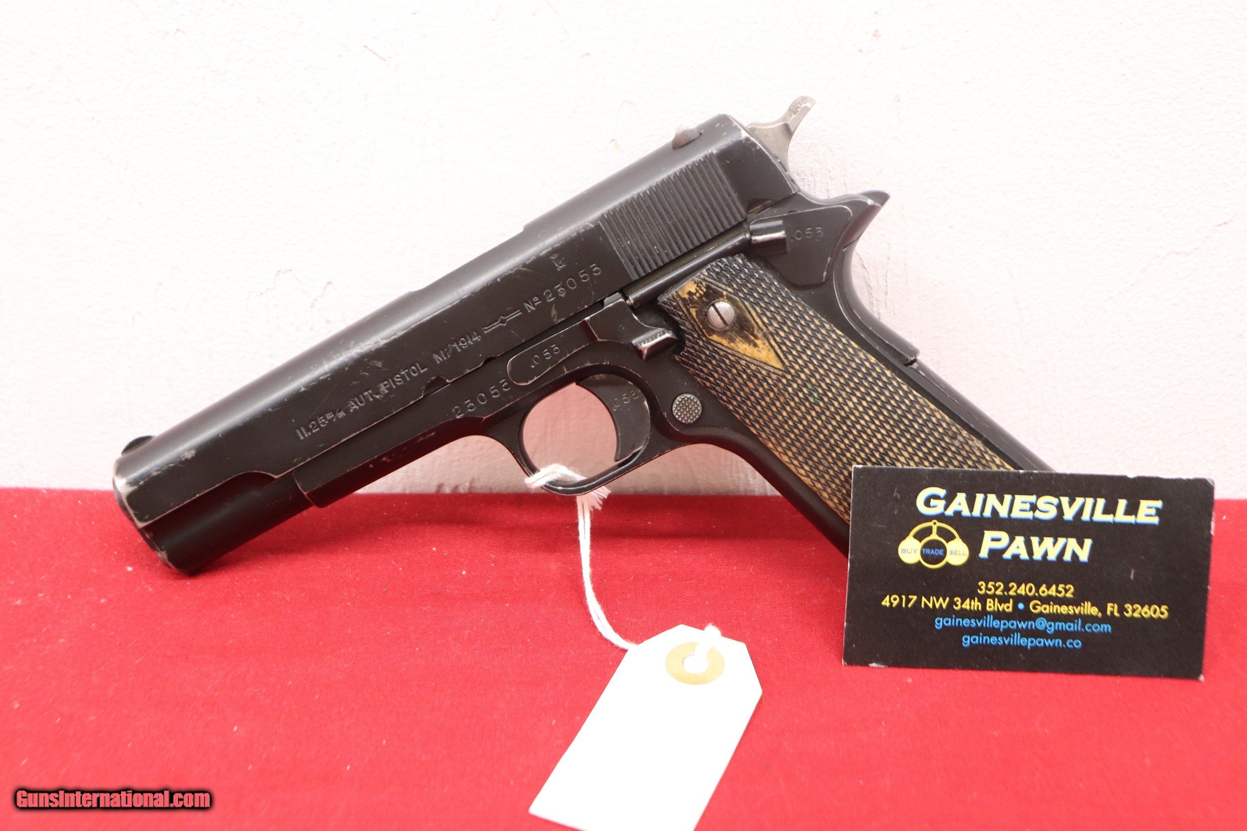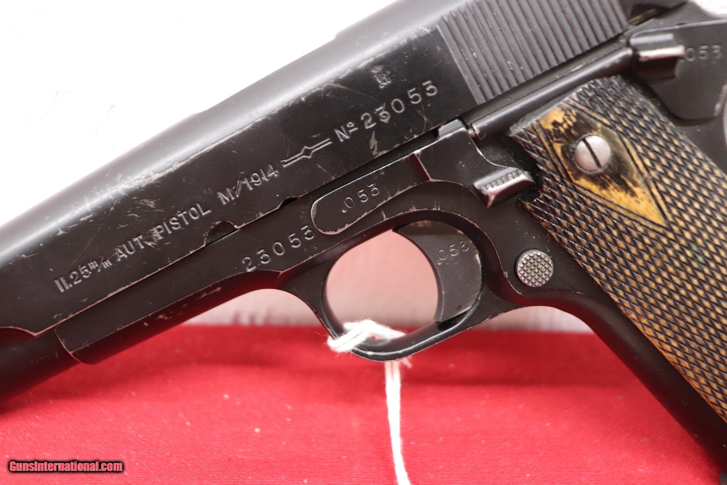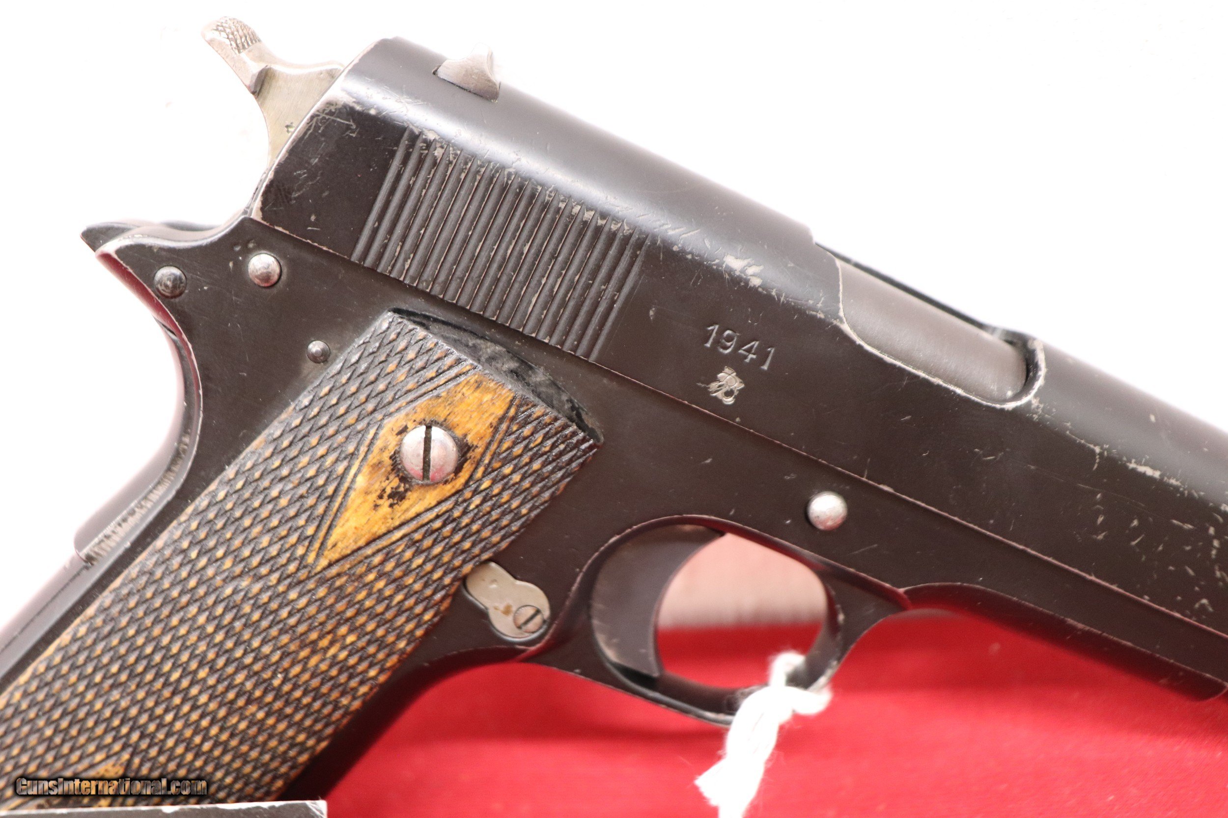 Description: Another great item from Gainesville Pawn! Up for sale is a Norwegian Kongsberg 1914. In 1914 Norway Adopted the Colt 1911 pistol. Norway obtained a license to produce the pistols at the Kongsberg Vaapenfabrikk facility. These are Scarcely seen in the U.S. This one is wartime being produced in 1941. Nice condition proper baked on black finish. The barrel, front bushing and trigger were replaced post war. Small import mark.*Please be aware that all items are sold “AS IS”. Feel free to call us at our store (352) 240-6452 or email us at Gainesvillepawngmail with ANY questions. We do not accept trades or offers through through Guns International We only entertain trades and offers through our store. $35 shipping and handling. Insurance extra. We only accept USPS money orders and major credit cards for payment. 3% convenience fee for credit cards. WE collect Florida state sales tax for in state sales. Please be aware that this item is for sale in our store as well as the occasional gun show so it may be sold there at any time. We will not ship the item until you have your dealer/receiving store email us a signed copy of their FFL to gainesvillepawngmail. SOLD Curio/Relic: Yes Handgun Caliber: .45 ACP (.45 Auto) Manufacturer: Kongsberg/ Colt Model: 1914 Serial Number: 23053 Barrel Length: 5 inch Condition: very good Metal Condition: very good Wood Condition: very good Bore Condition: excellent |