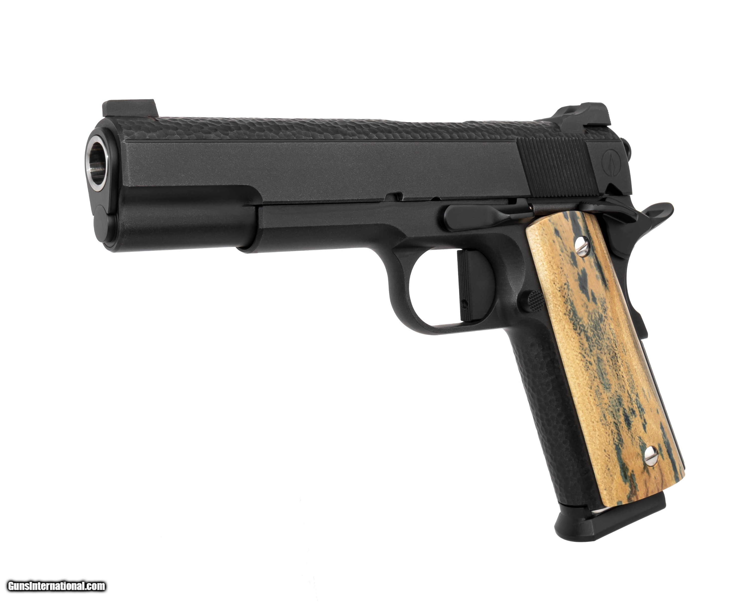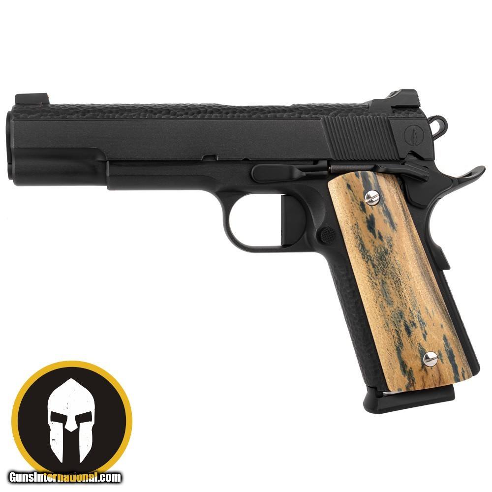 Description: Ozark Custom Gunsmiths Government - 5" Barrel (.45 ACP) Distressed Black - Mammoth Ivory Grips NEW-IN-BOX: This item is factory new, in stock and ready to ship. KJ Phillips, a Master Gunsmith, opened Ozark Custom Gunsmiths in late 2022 outside of Berryville, Arkansas. This has created a unique opportunity to acquire a custom 1911 pistol with a very low serial number. KJ started Ozark Custom Gunsmiths because it has always been a dream for him to design and build the finest 1911 pistols. KJ grew up in Berryville, Arkansas, and has a great appreciation for living in the Ozark Mountains (hence the company name). KJ has always had an interest in firearms since a very young age. He started his career in 2011 at Wilson Combat and then moved to Nighthawk Custom thereafter. At Nighthawk Custom, KJ had the opportunity to train with some of the most skilled gunsmiths in the world. Those gunsmiths include Bob Marvel, Richard Heinie, and Bill Laughridge. In his growth to becoming a Master Gunsmith, he always strived to learn more every day. KJ built hundreds of 1911s over the years utilizing the knowledge built from his experience working with the mentioned gunsmiths. His talent did not go unnoticed by Nighthawk Custom and KJ was tasked with creating a prototype for a new model to add to their line. Sadly, this new model was determined by Nighthawk Custom to be too costly and never went into production. This custom build containing serial number: OCG00023 is one of these 1911 custom pistols built at Ozark Custom Gunsmiths. Ozark Custom Gunsmiths took the approach to find the best frames, slides, and small parts in the USA for their custom builds. At OCG, there are no CNC machines. The pistol started with an oversized forged frame, an oversized slide, and all oversized small parts. KJ then spent over 30 hours hand-fitting every part, hand-textured slide, frame, and small parts. Many times, during the build process, KJ had to hand file rather than use a mill. Normally, some stages of a 1911 build can be done on a mill, but without the use of a mill, KJ had to hand file everything to a perfect fit. Features: