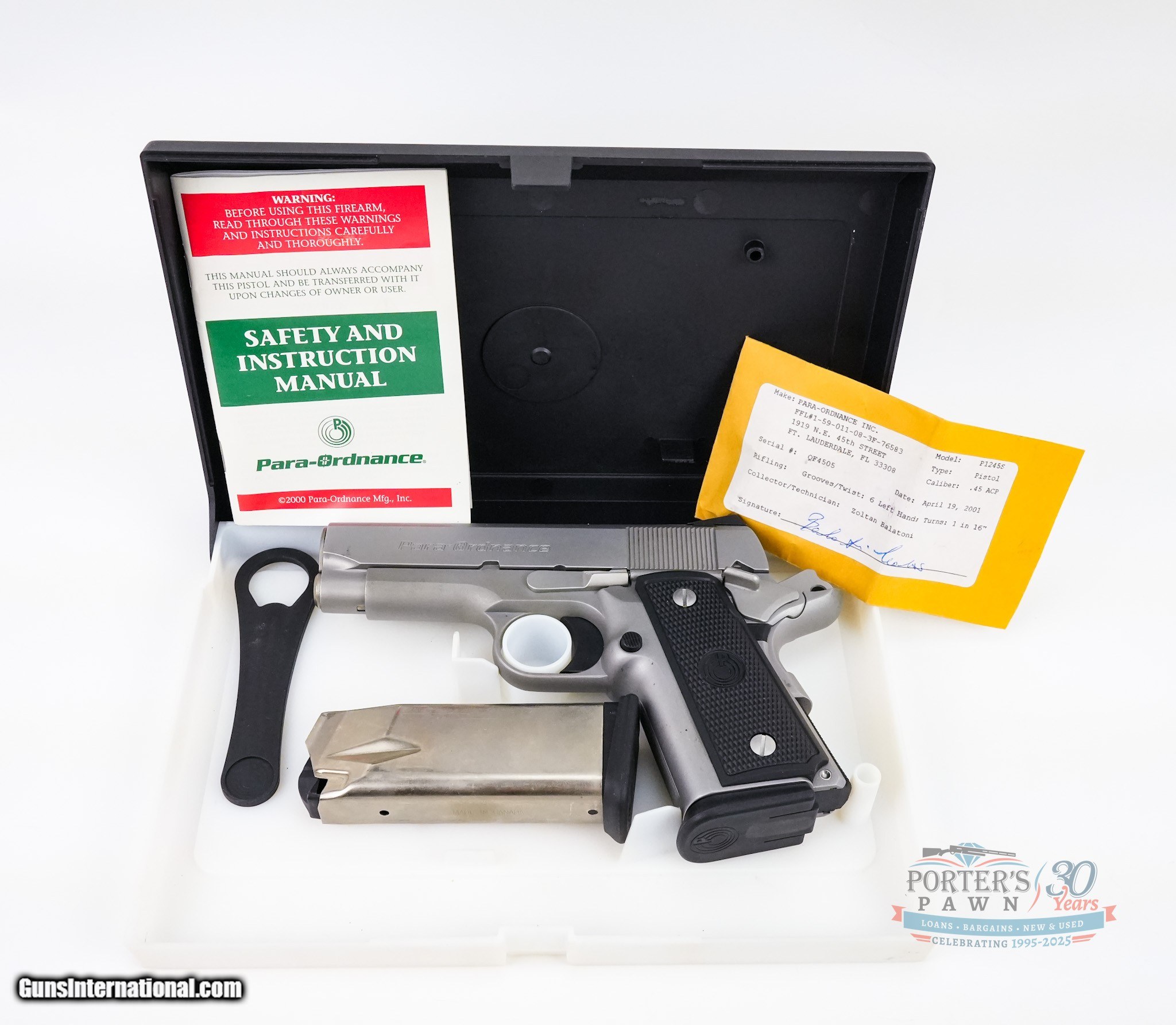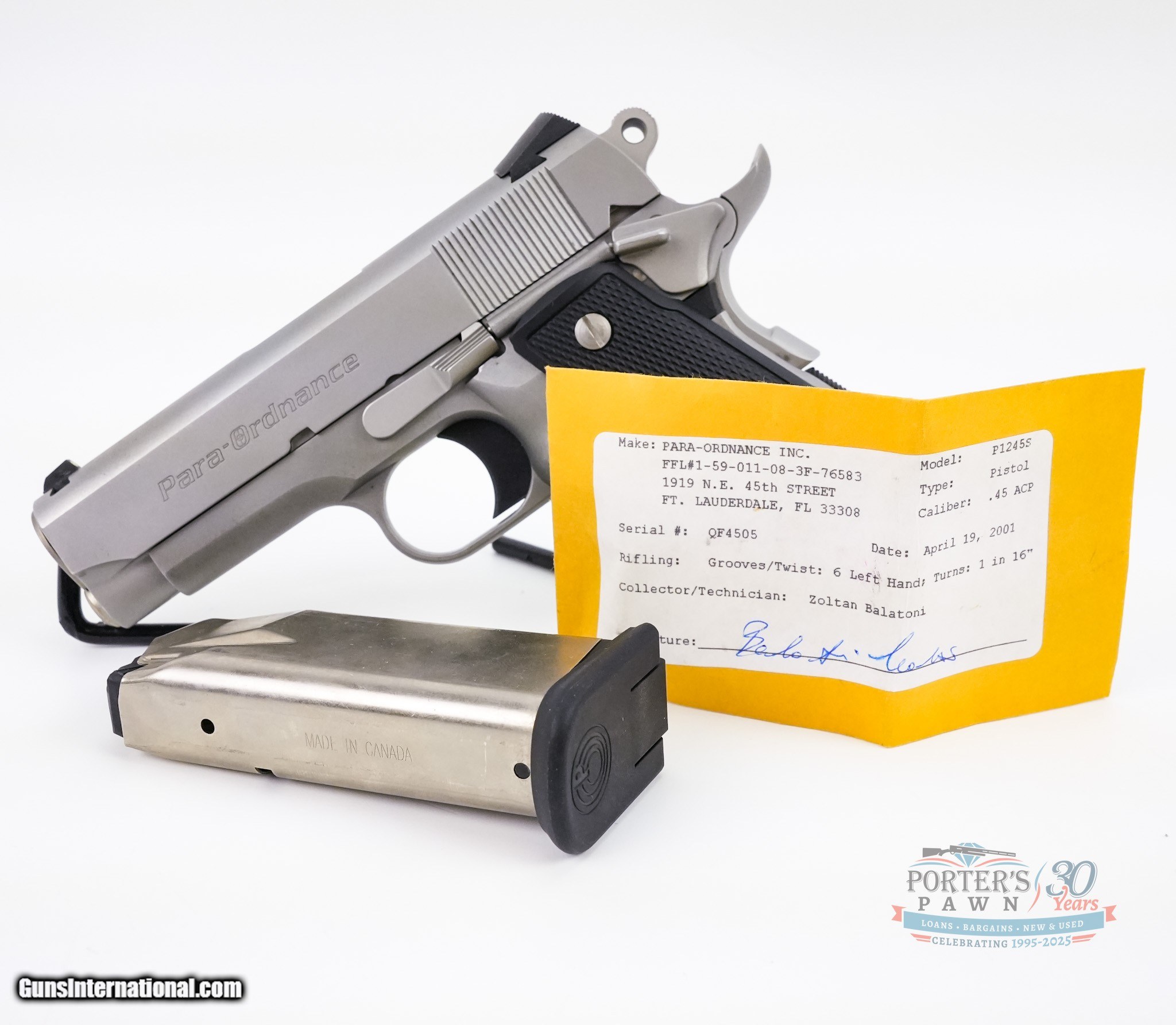 Description: Para Ordnance P12-45 – .45 ACP – Pre-Owned – Excellent Condition Para Ordnance P12-45 Up for sale is a Para Ordnance P12-45, chambered in .45 ACP. This classic, high-quality 1911-style pistol is in excellent condition and offers a great balance of size, power, and reliability. The P12-45 is known for its high magazine capacity (10+1 rounds) in a compact frame, making it ideal for both carry and defense applications. This pistol features a steel frame and stainless steel slide for durability and strength. It also comes with two 10-round magazines and the original case, lock, and documentation. The pistol’s ergonomics and precision engineering make it an excellent choice for those looking for a dependable .45 ACP handgun in a compact design. Specifications