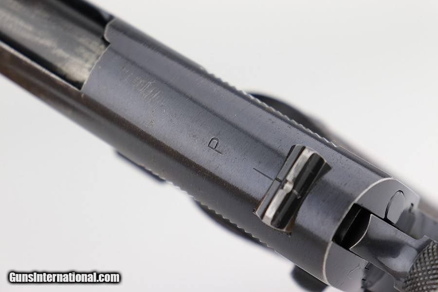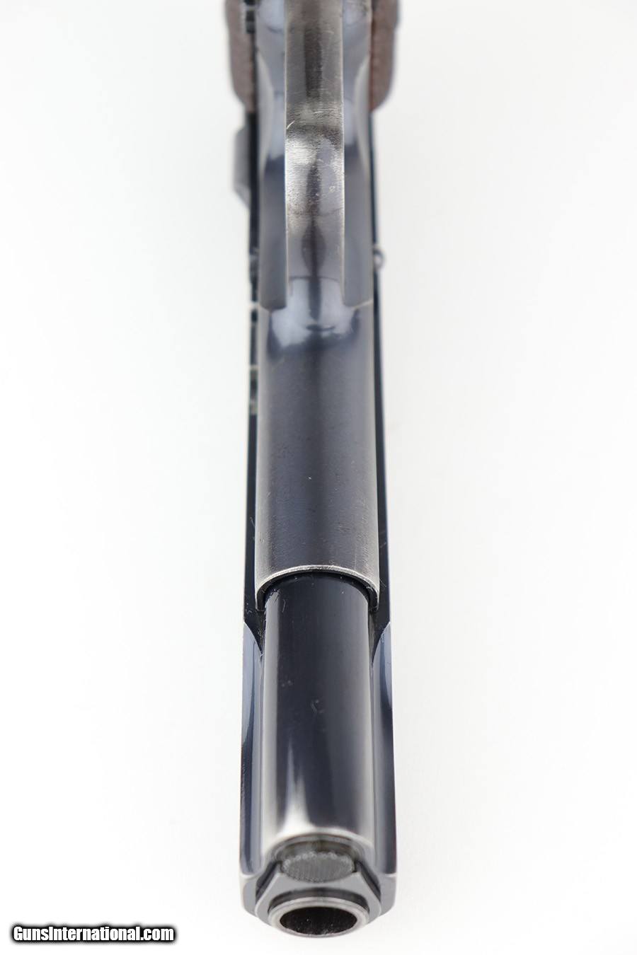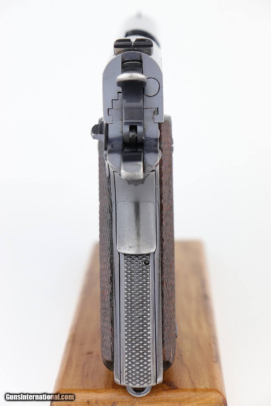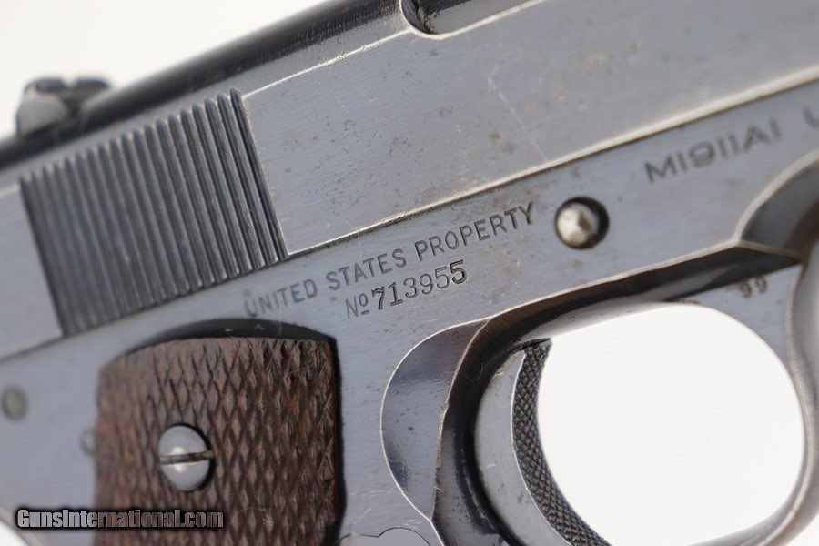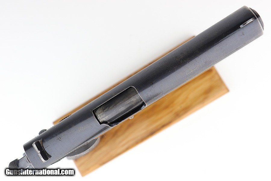 Description: This a rare and desirable Colt 1911A1 that was manufactured in 1939 and issued to the U.S. Navy. Roughly 3,500 total 1911A1s were produced for the armed forces in 1939, with all going to the Navy. This pistol is all matching and correct, with about 75-80% of the gorgeous and famed Colt brushed blue remaining. The profile view is very nice with only minor edge wear, but the front strap is thin throughout and there's additional finish loss on the trigger guard. The slide is numbered and matching to the frame. Proper Colt barrel with 'G' under the lug. The rifle is fair but there is some pitting throughout. Excellent and correct wood grips. Commercial Colt magazine though. SOLD Curio/Relic: Yes Handgun Caliber: .45 ACP (.45 Auto) |