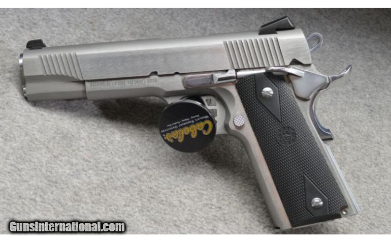 Description: SOLD Caliber Info: .45 ACP Metal Condition: Very good, some minor handling marks Wood Condition: Very good, some minor handling marks Bore Condition: Shiny and bright Barrels: 5 Inch - Stainless Steel Stock: Checkered Dark Brown rubber Weight: 37 Oz. Sights: 3-dot sight system Extras: Case, Three Magazines Item Location: Rogers, MN, MN |