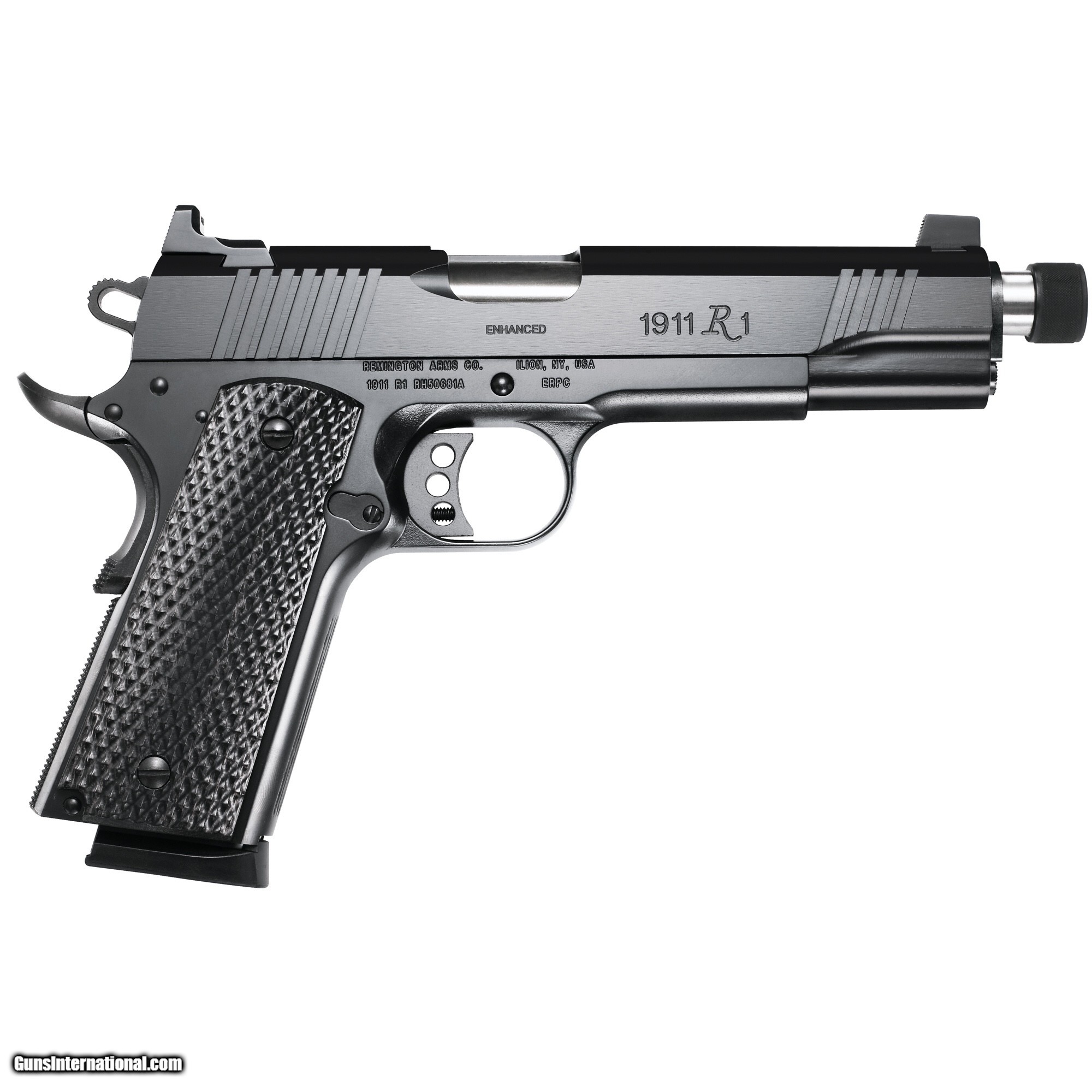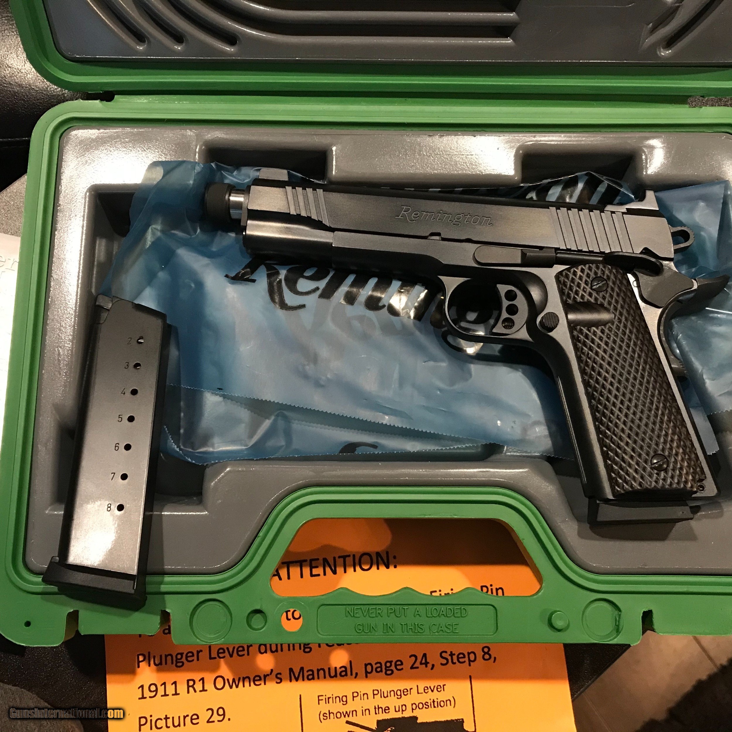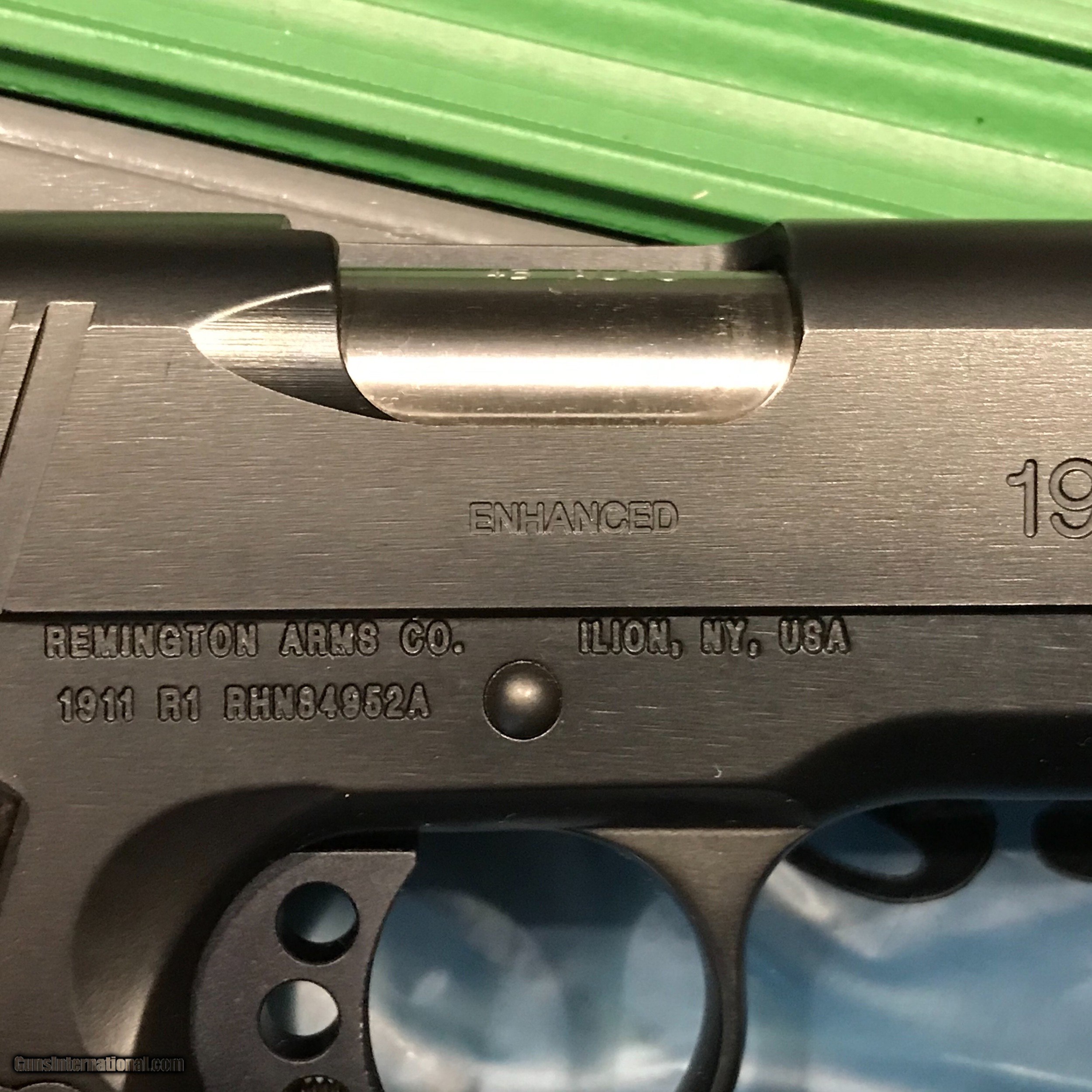 Description: BRAND NEW IN THE BOX A 2017 REMINGTON ENHANCED T B W/THREAD PROTECTOR 45ACP PISTOL NIB JUST REDUCED IN PRICE! Remington, R1 Enhanced, 1911, Full Size, 45ACP, 5.75" Threaded Barrel, Steel Frame, Black Satin Finish, Laminate Grips, Tall 2-Dot Sights, 8Rd, 2 Magazines