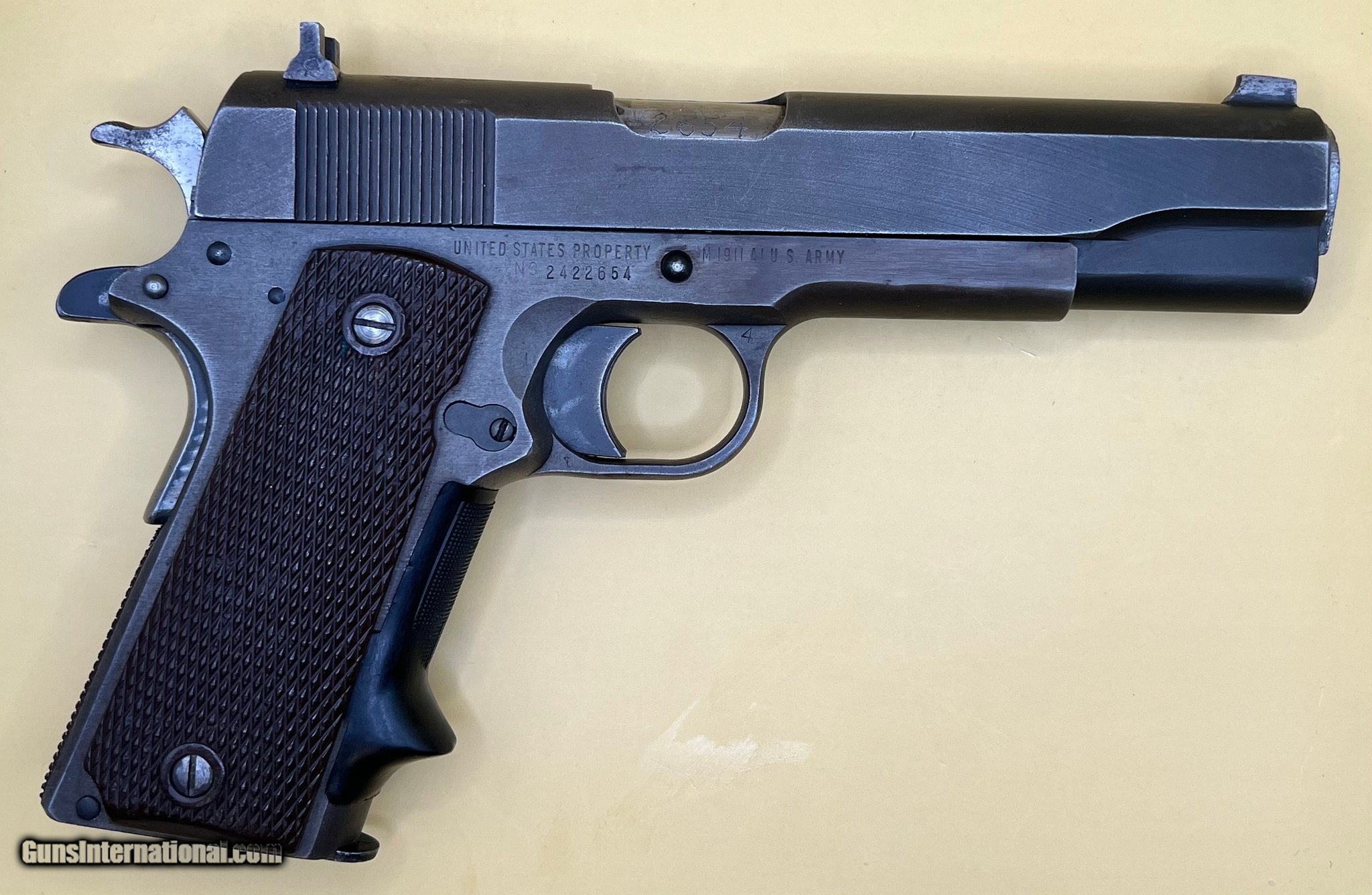 Description: Guns Listing ID: 467513 U.S. Army marked Remington-Rand M1911A1 semiautomatic pistol chambered in .45 Auto. \"United states Property\" marked, the serial number suggests that the pistol was produced in 1945. Comes with a single 7-round magazine and no other accessories. .45 Auto SOLD Manufacturer: REMINGTON Model: RAND 1911A1 Condition: Used - Non-Certified Barrels: 5 Gauge Info: .45 ACP Finish: parkerized |