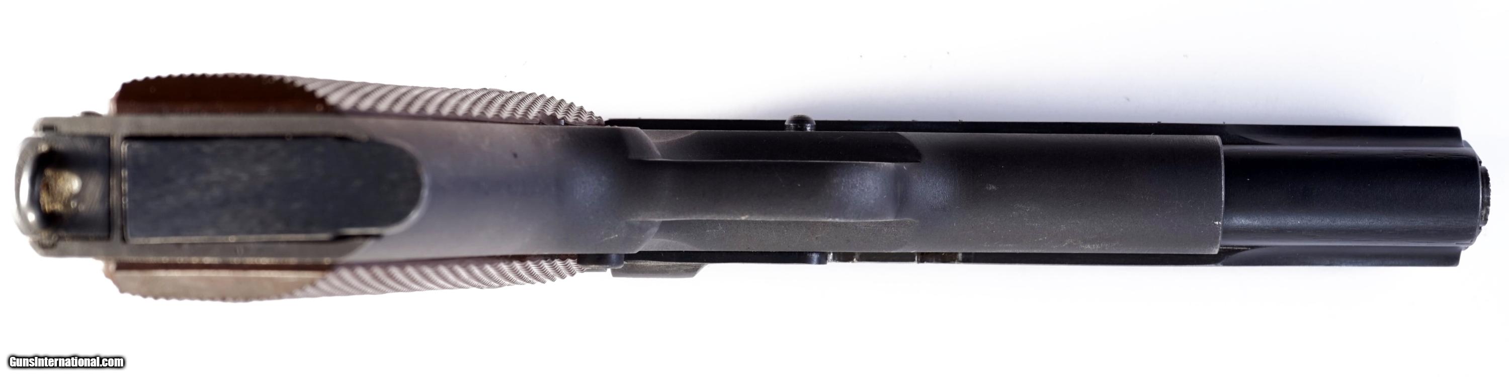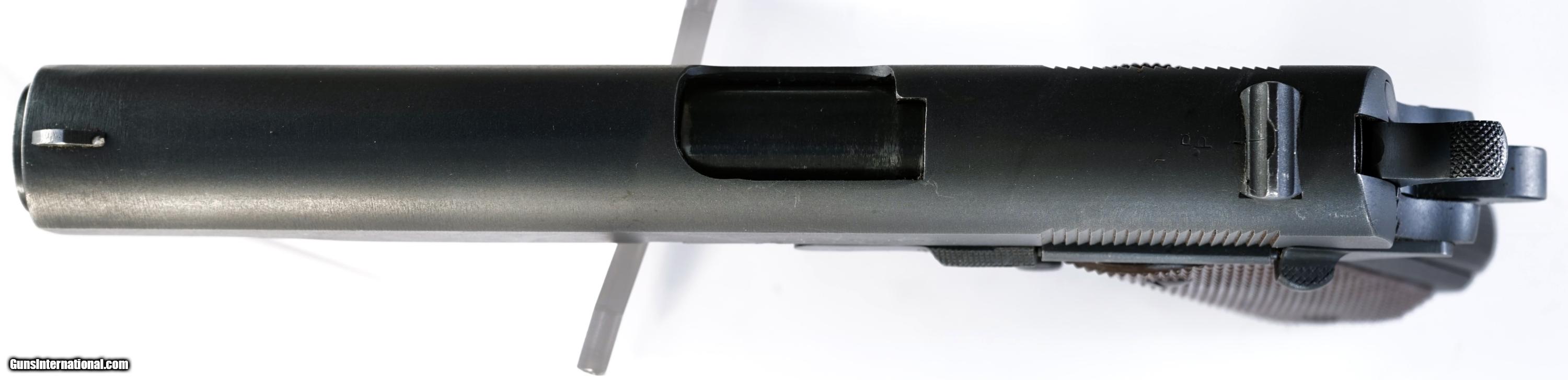 Description: U.S. 1911 A1, Remington Rand, Caliber .45 ACP, Serial Number 9772XX. This 1943 gun has seen very little if any use a true Desk Queen. The original factory finish is at 98+%. The only loss is some slight muzzle wear, a small rub mark on the slide from the the frame, some silvering on the sharp edges and a surface scuff or two from the holster. The gripstrap show absolutely no graying. The slide clearly shows the heat treat mark.There are no rust spots, pits, or flaking any kind on the finish. The rear of the frame has the proper Crossed Cannons Ordinance Stamp. The top of slide has the "P" proof. The right side of the frame has a "P" proof as and the correct FJA inspectors mark The grip panels are the proper early type, without the reinforcement rings. They are in perfect condition. Not scratch, crack or flattened point. The feed ramp which is correctly in the white, bolt face and slide rails show very little if any use. The correct "S P" marked barrel is mirror bright with razor sharp rifling. There is no sign of frosting. The gun comes with one proper "L" (Littleton) stamped magazine. This gun has obviously been somebodies a rear echelon Desk Queen for it's entire life. This really handsome and 100% correct gun that would make a great in your collection or super on the range.......$2795. Pictures to follow. SOLD Curio/Relic: Yes Manufacturer: Remington Rand Model: 1911-A1 Serial Number: 9772XX Caliber Info: .45 ACP |