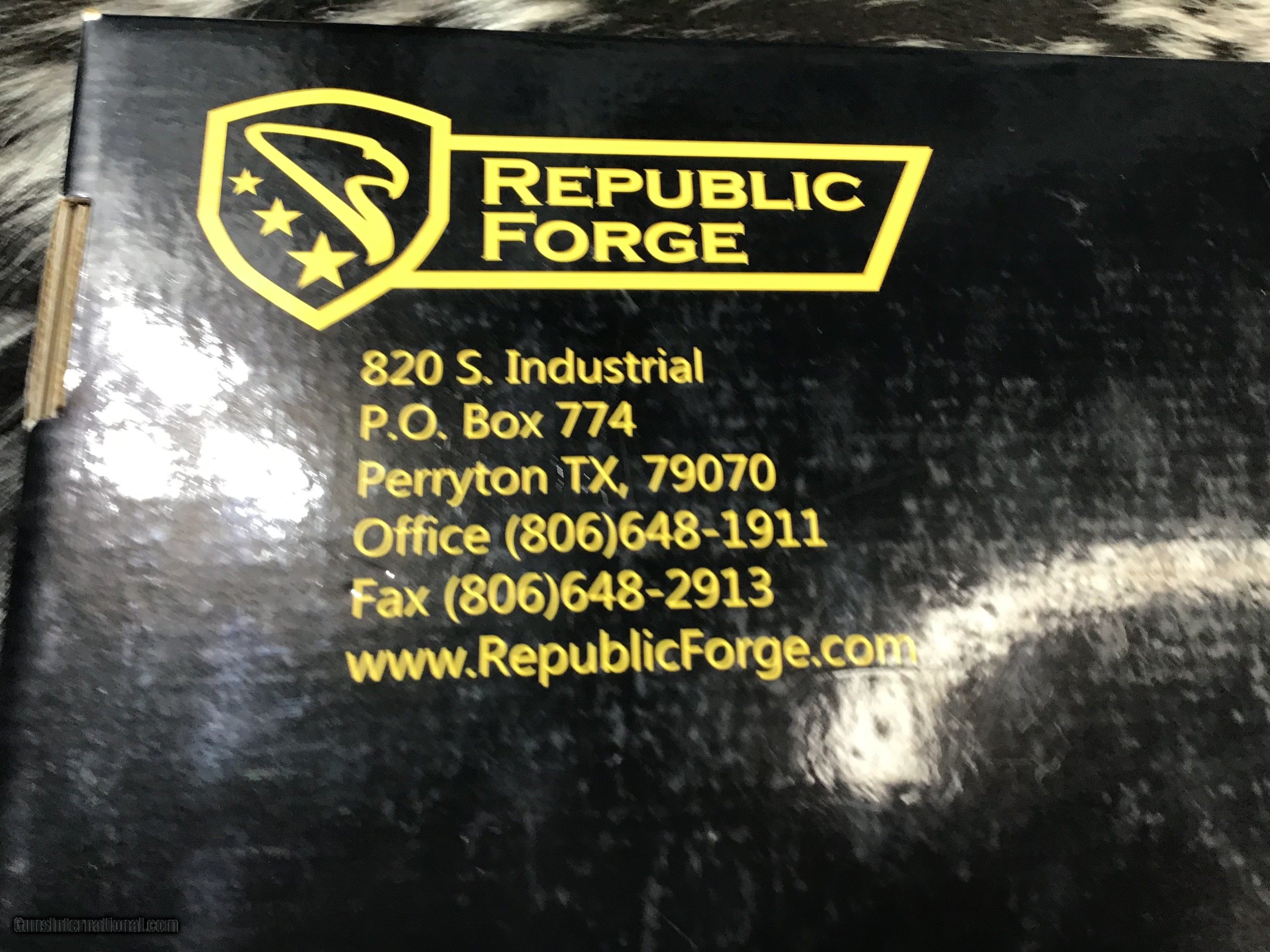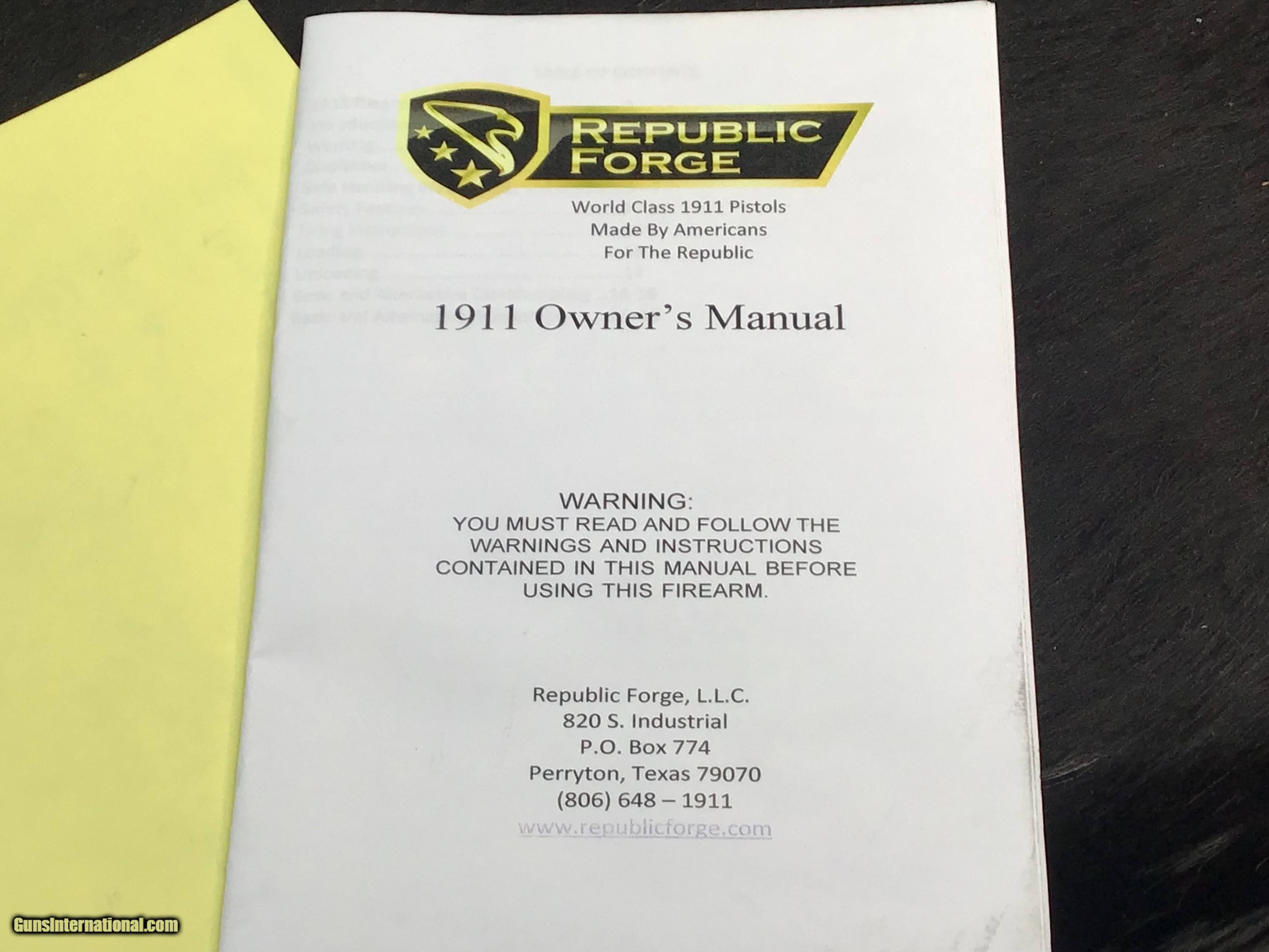 Description: Republic Forge Mission Statement; We build world-class 1911 pistols made by Americans for the Republic. Our pistols are truly made in the USA, by hand, with American-made parts, one gun at a time, not by ten assembly line workers. We get our hands dirty every day, making a custom pistol for you that gives you the thrill of a lifetime when you’re shooting it. We put a lot of rounds through each gun to make sure everything functions properly. We include a target from this first test firing to show you the incredible accuracy of our 1911s. This is our personal touch of confidence to prove that we stand behind every gun we make. Our pistols deliver a unique blend of cutting-edge technology and custom craftsmanship. Republic Forge Commander size 1911 Premium hand crafted in Texas USA. Republic forge pistols are build by hand with no CNC machines used. Rated one of the finest premium custom 1911 pistols produced. Texas Star hammer and Checked Wood grips, Black slide Titanium frame. Chambered in .45 acp. Adjustable U shaped combat night sights by Trijicon. Crowned muzzle, front serrations, checkered grip straps. Light rail with 4.25 inch barrel, mag well for fast reloads. Unfired since factory with box all owners papers, factory test target, 2 magazines and range bag with Republic Forge logo. One beautiful Commander. Unfired since factory. Add 3% if paying with credit card. Free shipping for US Veterans and retired Law Enforcement Officers. God Bless America from a proud American, and a Viet Nam Vet , thankful for our freedoms.. paid for by the Blood ,Sweat and Tears of our brave men and women in uniform. Ten Below Firearms is a Veteran owned and operated business. We specialize in out of production models of high quality firearms. We love to ship! If you are out of state or can't make it to our store, just give us a call! Handguns normally ship for $30 and Long guns for $40 to $65 for extra length long guns. That's 2-3 day USPS Priority shipping, Delivery conformation and with tracking number. Optional Postal insurance is additional $1.70 per $100 and highly recommended. We are OPEN BY APPOINTMENT ONLY FOR IN PERSON VISITS SOLD Handgun Caliber: .45 ACP (.45 Auto) Manufacturer: Republic Forge Model: Stryker Serial Number: R0199 Barrel Length: 4.25 inch Condition: NIB Metal Condition: Excellent New Wood Condition: Excellent New Bore Condition: NEW Action: SA Triggers: SA Finish: Titanium Sights: Adjustable U Manufacture Date: 1917 Extras: Test target, 2 mags, tools Case: Box, Soft case Item Location: Mn |