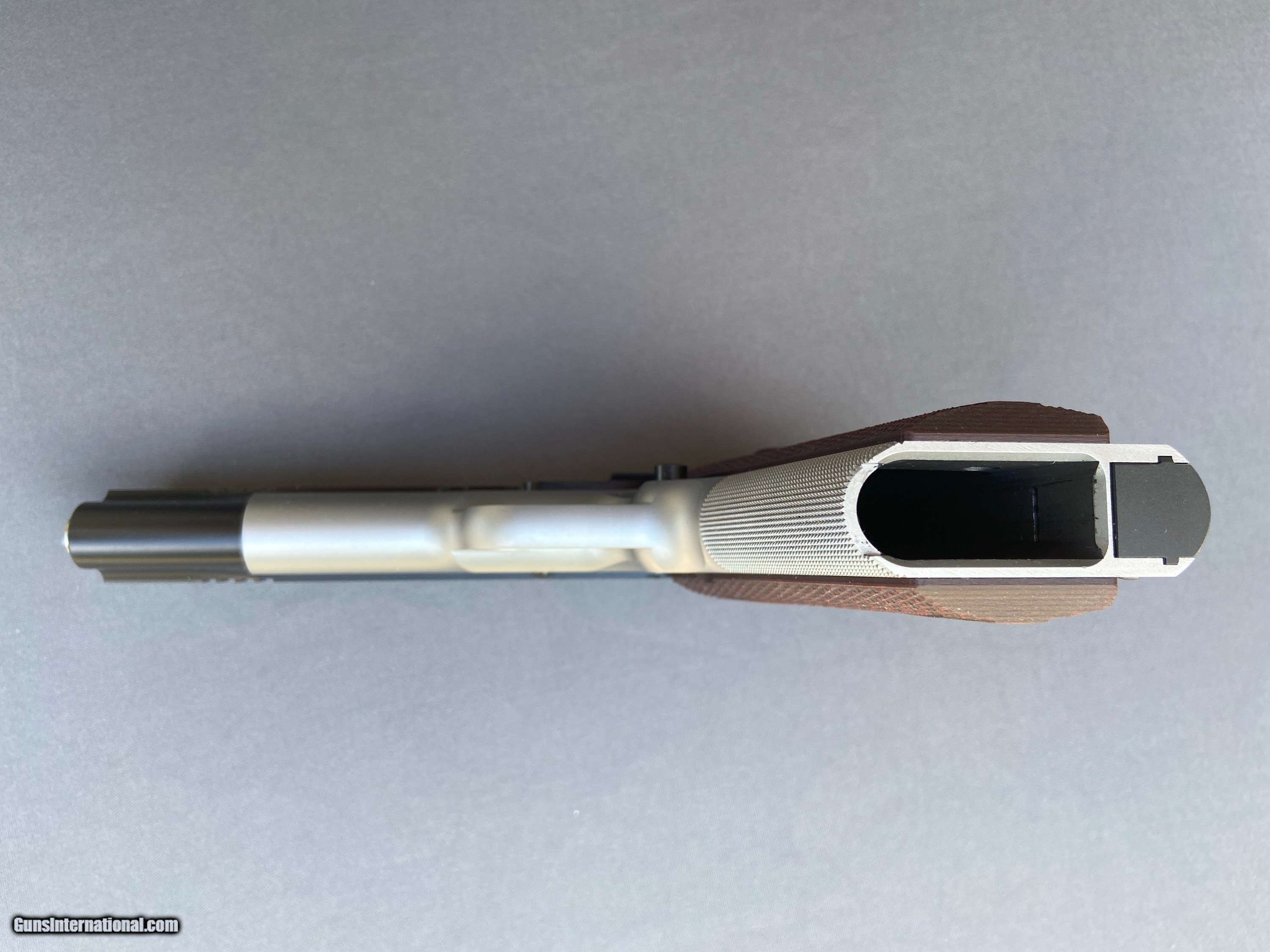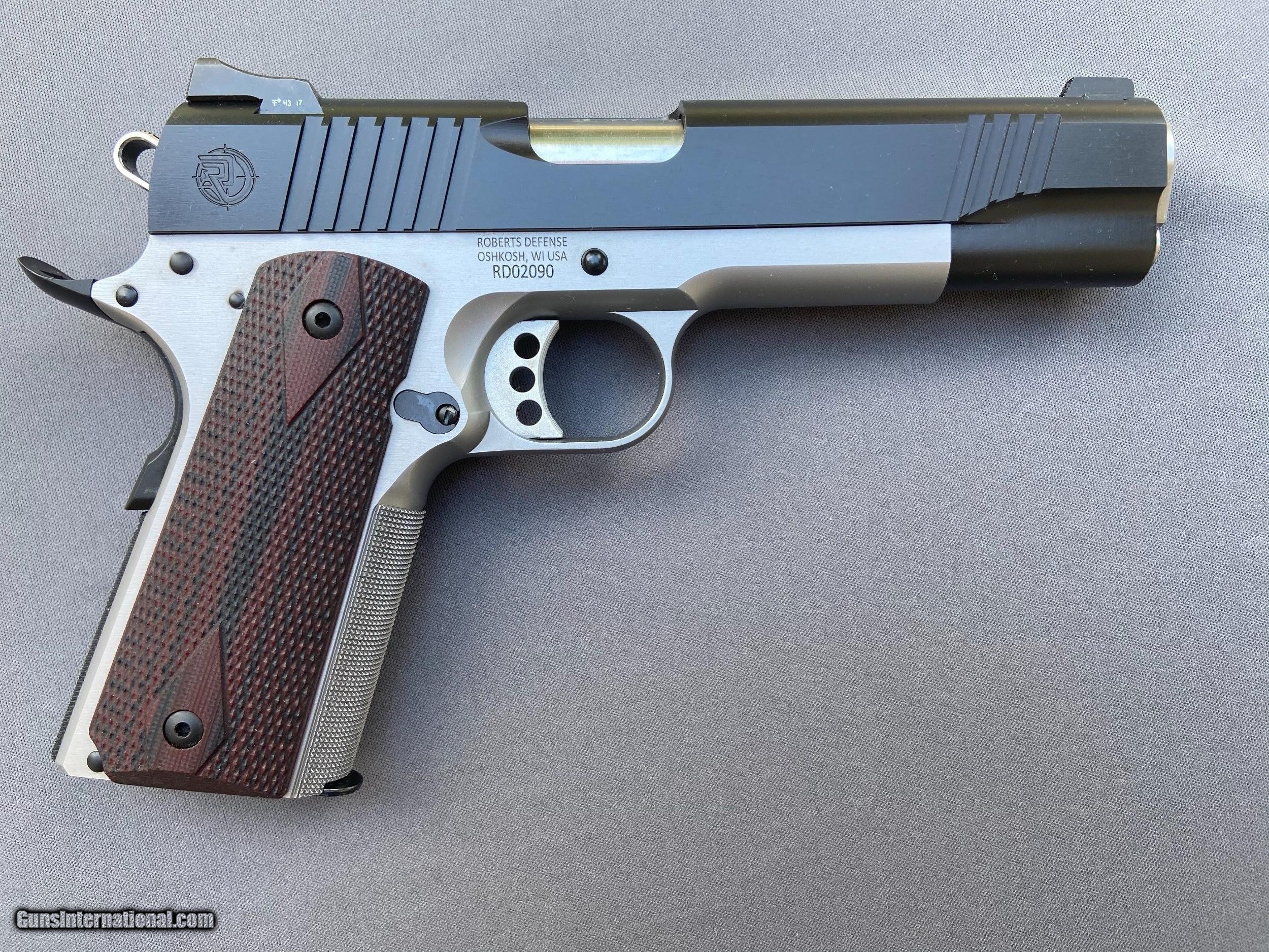 Description: Roberts Defense Custom 1911 New and Unfired from Factory, .45 ACP Custom 1911 SuperGrade 2-tone manufactured in Oshkosh, WI, 5” barrel, satin stainless steel frame, black Cerakote stainless steel slide, Heine Slant Pro Tritium sight, 3- hole trigger and single side safety. Built in 2017 the slide to frame fit is hand lapped with coarse, medium, fine and ultra fine lapping compound to provide a very smooth and precise fit (I can detect no movement between the slide and frame even when the slide is pulled back and locked). Crisp factory trigger pull. Complete with Roberts Defense soft case and 1- 8 round Roberts Defense magazine, instruction manual, bullet casing fired at factory, firearm lock, 1- small tube of Slip 2000 lubricant and disassembly tool. I have another Super Grade pistol that I shoot and believe the Roberts Defense pistols are equal in accuracy and quality to the big name 1911 makers. PRICE REDUCTION 07.25.2023- A new unfired custom handgun for $1895.00 plus 50.00 shipping & insurance to lower 48 only. Please contact me with questions at 920.216.6084