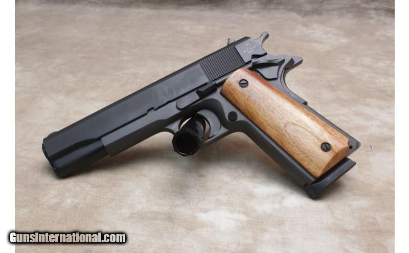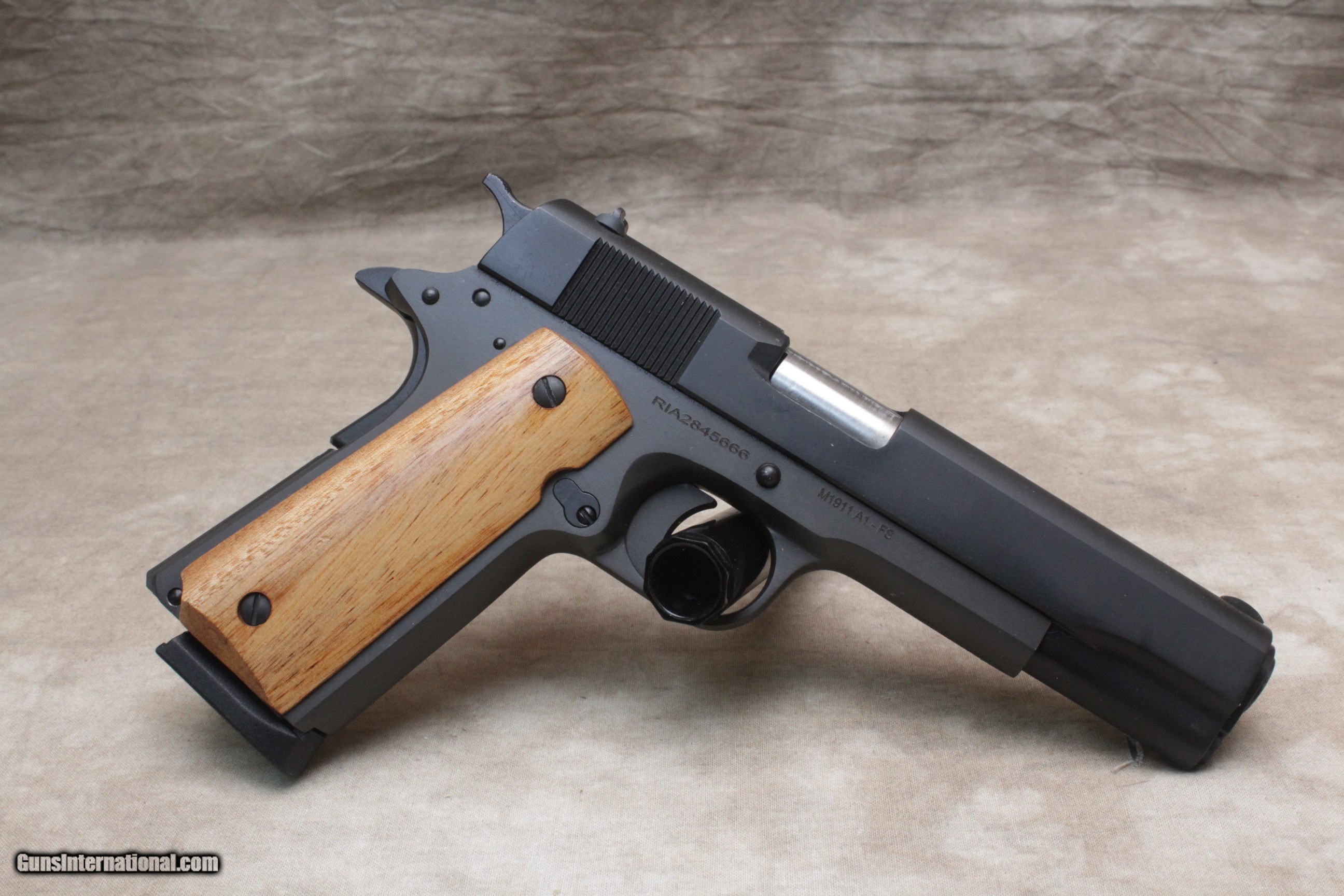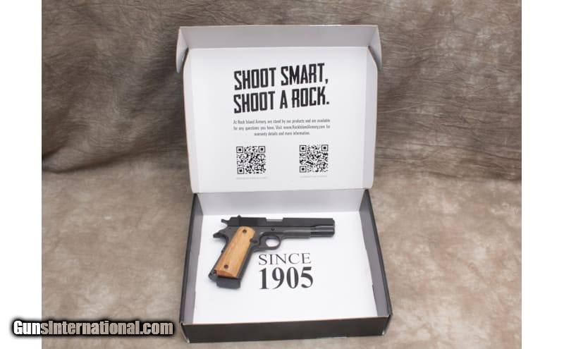 Description: The Rock Island M1911 is a great representation of the original US GI combat issue 1911 chambered in 45 ACP. Fixed low profile sights and traditional smooth slim design are perfect for quick pull holster use. A durable parkerized finish gives it a tough, smooth, non-reflective surface. Smooth wood grips offer comfort in both feel and design. The 5-inch barrel offers a balanced weight to assist with the accuracy and recoil that made the original 1911 design famous. .45 ACP SOLD Metal Condition: Metal is in great condition and has a black parkerized finish Bore Condition: Bore is in excellent condition with great shine Barrels: 5" barrel in great condition Triggers: 4–6 pounds Weight: 2.5 lbs Sights: Front sight is GI type mounted on slot and rear sight is GI type mounted on dovetail cut Item Location: Pearl, MS |