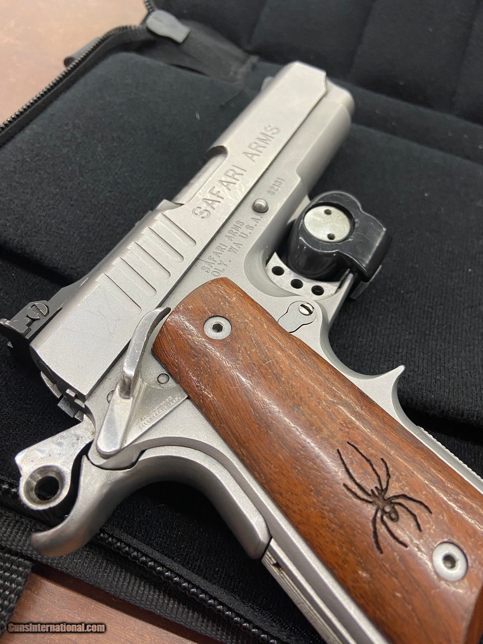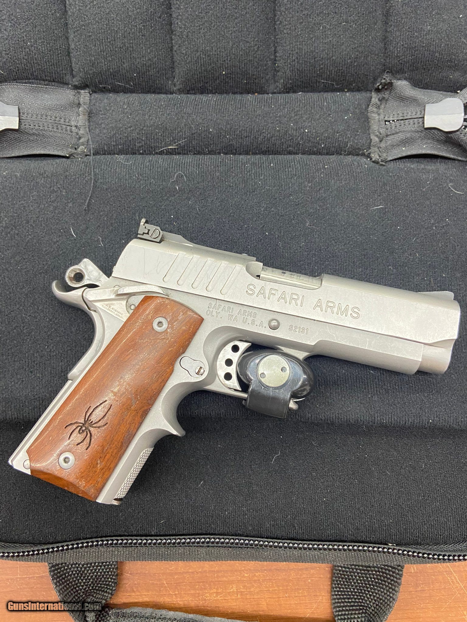 Description: Guns Listing ID: 1165980 Safari arms compact 1911 style handgun comes with a black soft case. SOLD Manufacturer: SAFARI ARMS Model: Black Widow Caliber Info: .45 ACP Condition: Used - Non-Certified Barrels: 4 BARREL Finish: STAINLESS/WOOD GRIPS |